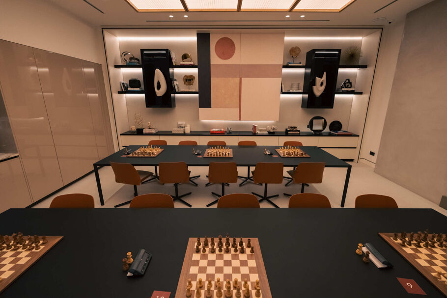 Guests arrived to find our 500-square-meter office transformed for the evening. Individual chess boards were arranged tournament-style, a live leaderboard displayed on a large screen, and a cocktail bar staffed by invited mixologists operated from our fully equipped bar area.