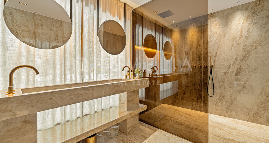 La planta principal ofrece cinco elegantes dormitorios en suite, amplias zonas de estar y comedor, y una cocina de diseño totalmente equipada con electrodomésticos Miele y Siemens. Una chimenea de diseño y un televisor de 75 pulgadas anclan el espacio central, creando un entorno cálido y sofisticado para reuniones y entretenimiento. En la planta superior, la suite principal sirve como un santuario de paz con vistas elevadas al mar y un baño acabado en mármol que realza la sensación de lujo.