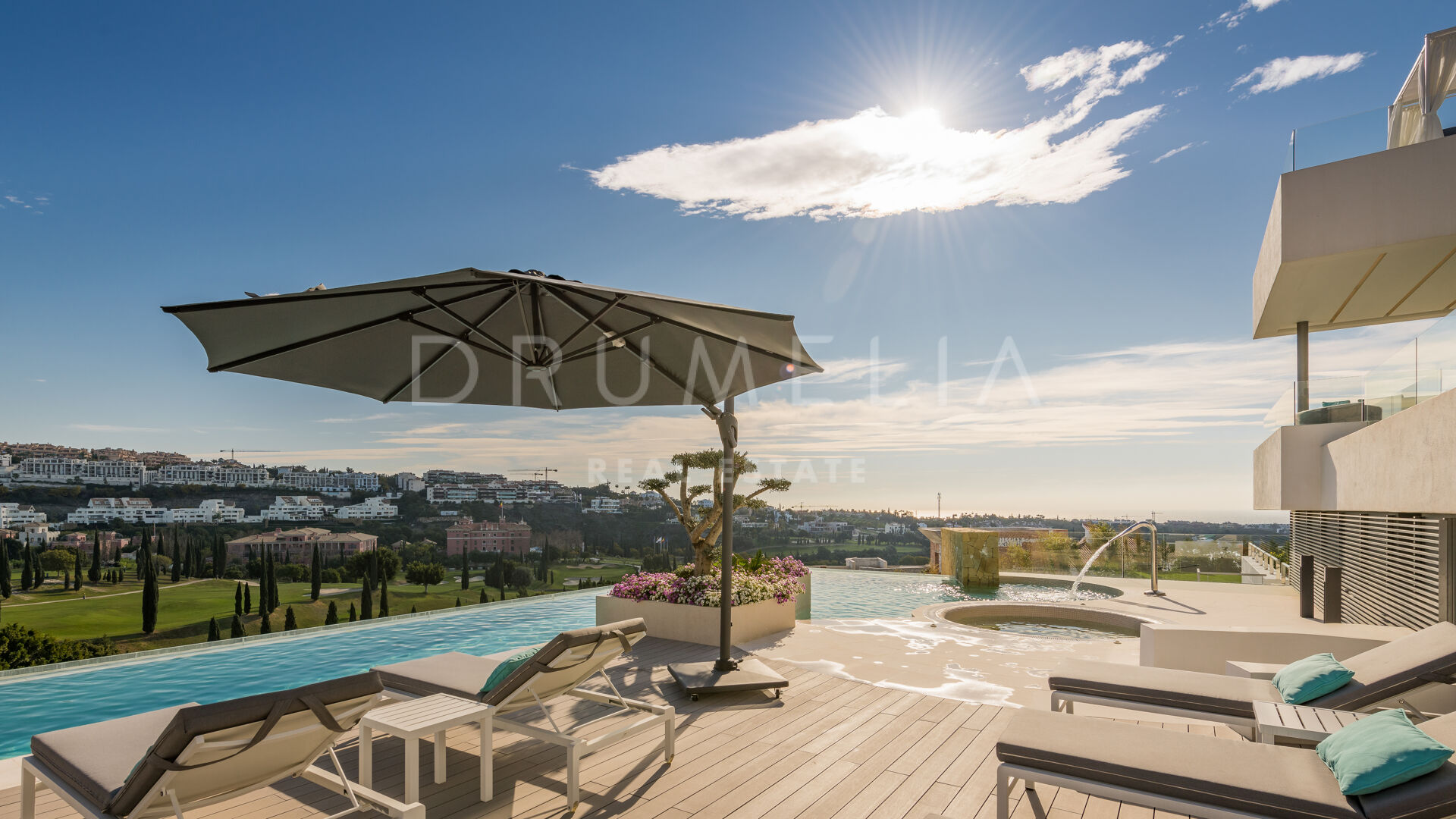 Ландшафтный сад приветствует вас ухоженными клумбами, газонами, вечнозелеными и субтропическими растениями. Большой импозантный бассейн с нулевым краем приглашает освежиться, устроить веселую вечеринку у бассейна или просто поплавать, любуясь видом на супер-роскошный отель «Villa Padierna Palace» и его итальянские сады с озерами и стройными кипарисами. Вы можете побаловать себя солнечными ванными в солярии в шезлонгах, наслаждаясь умиротворяющей красотой окружающей природы и видами на Средиземное море, Африку и Гибралтар. В темное время суток наружное освещение делает территорию волшебной.