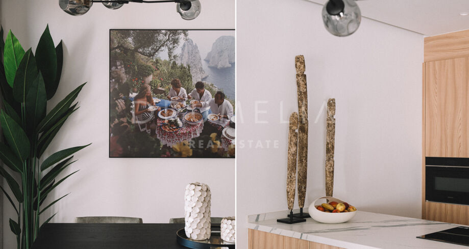 Bostaden är fördelad på två stilfulla våningsplan där entréplanet erbjuder en öppen planlösning mellan vardagsrum och matsal som smidigt ansluter till en generös terrass – perfekt för måltider utomhus, avkoppling eller underhållning under den medelhavska solen. Ett modernt, stilrent kök och en gästtoalett kompletterar detta plan med både funktion och elegans.