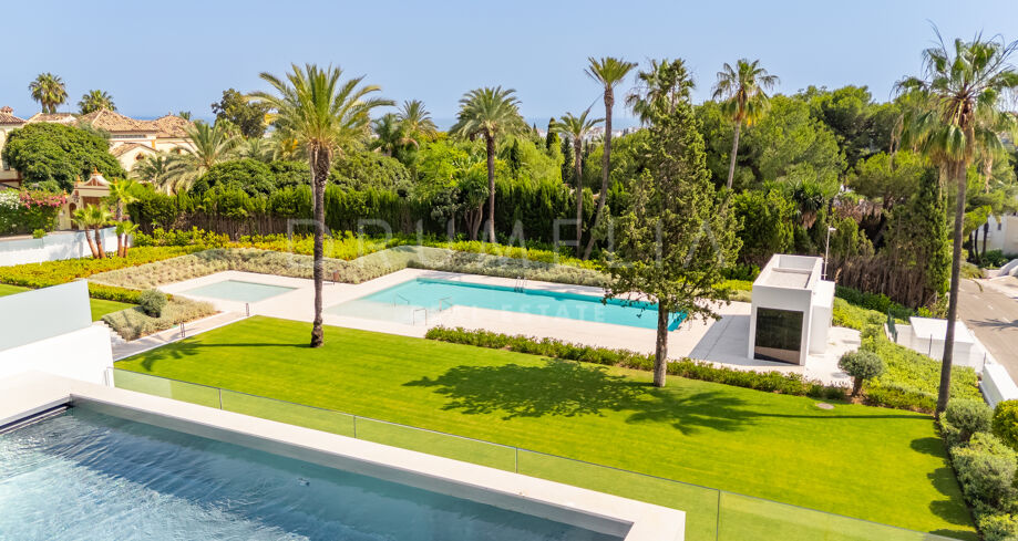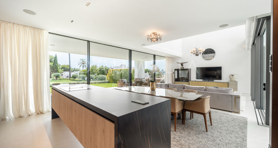 Huvudplanet rymmer ett generöst vardagsrum och matsal i öppen planlösning som öppnar upp mot en stor terrass, idealisk för avkoppling och sociala tillställningar. Det stilrena köket är utrustat med Gaggenau-apparater och kombinerar estetik med funktionalitet. Villan har fyra sovrum och fem badrum, inklusive tre sovrum med egna badrum på övre plan, med golv i ekträ och eleganta Porcelanosa-marmorer. Det extra sovrummet på nedre plan erbjuder flexibel användning som gästrum, privat kontor eller wellnessutrymme. Takterrassen med plunge pool och fullt utrustad utomhusbio erbjuder öppna vyer över Medelhavet, La Concha-berget och omgivningarna, och skapar en unik plats att njuta av året runt.