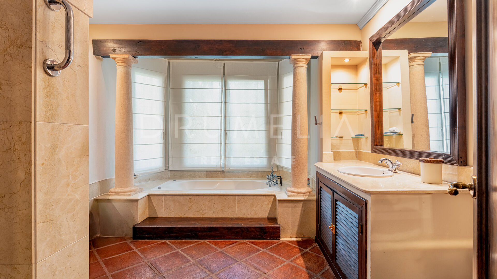 varje sovrum är smakfullt inrett med mjuka neutrala toner, dekorativa mattor och antika detaljer, vilket ger en lugn atmosfär i hela rummet. badrummen är ett framträdande inslag, prydda med levande kakel i sevilliansk stil, handmålade keramiska handfat och kvalitetsarmaturer. ett badrum har till och med ett spa-liknande badkar inramat av romerska kolumner, som utstrålar en känsla av klassisk lyx.