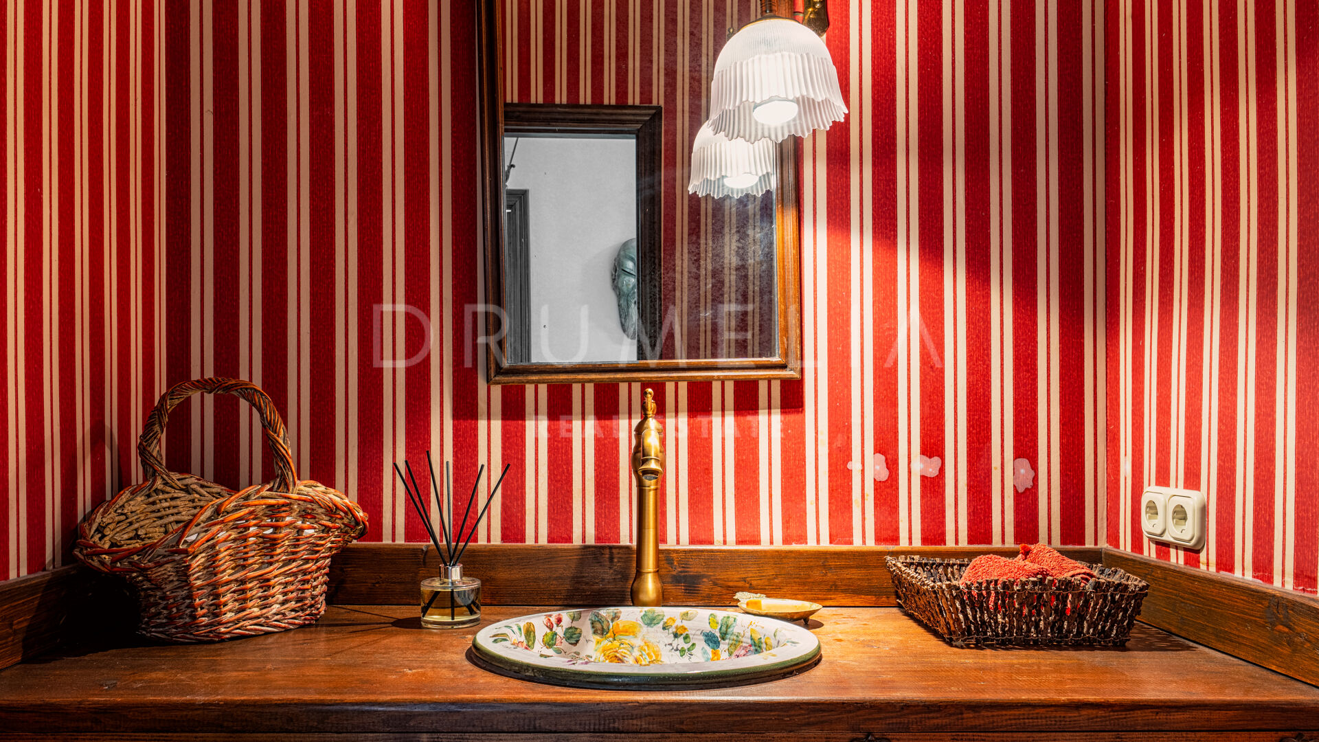gästtoaletten, klädd i djärv röd och vit randig tapet, erbjuder en nyckfull, vintage touch med sin träbänk och hantverkshandfat – ett designuttalande helt på egen hand.