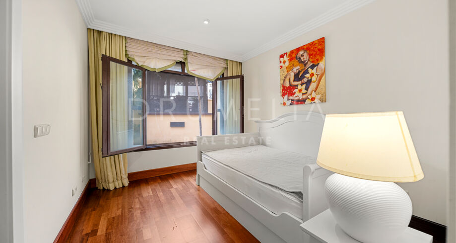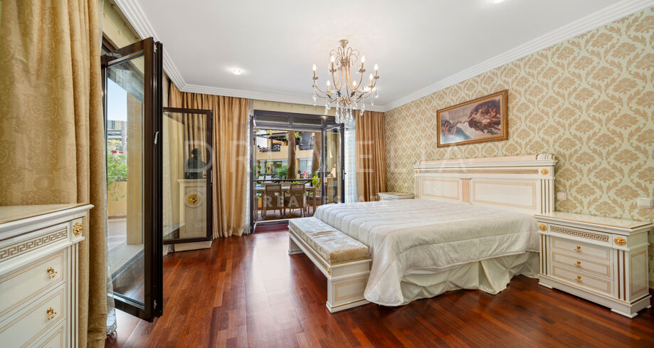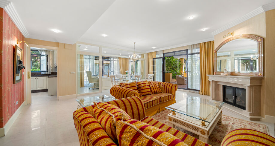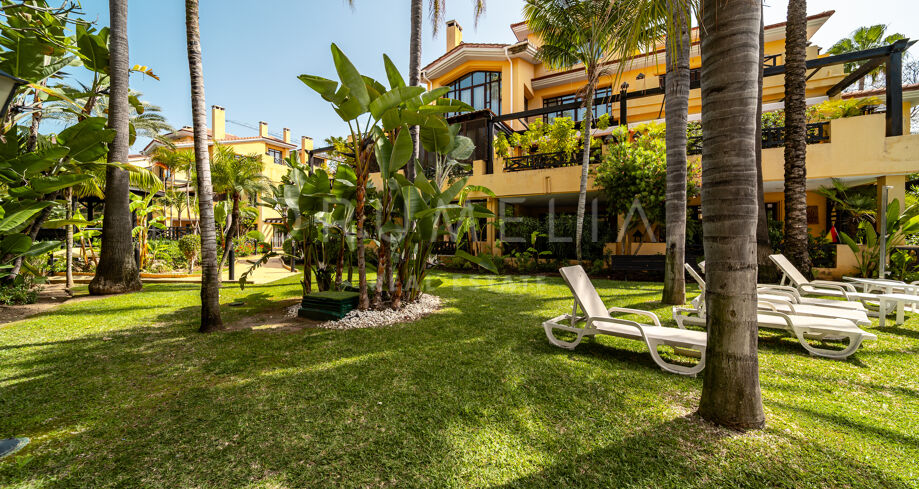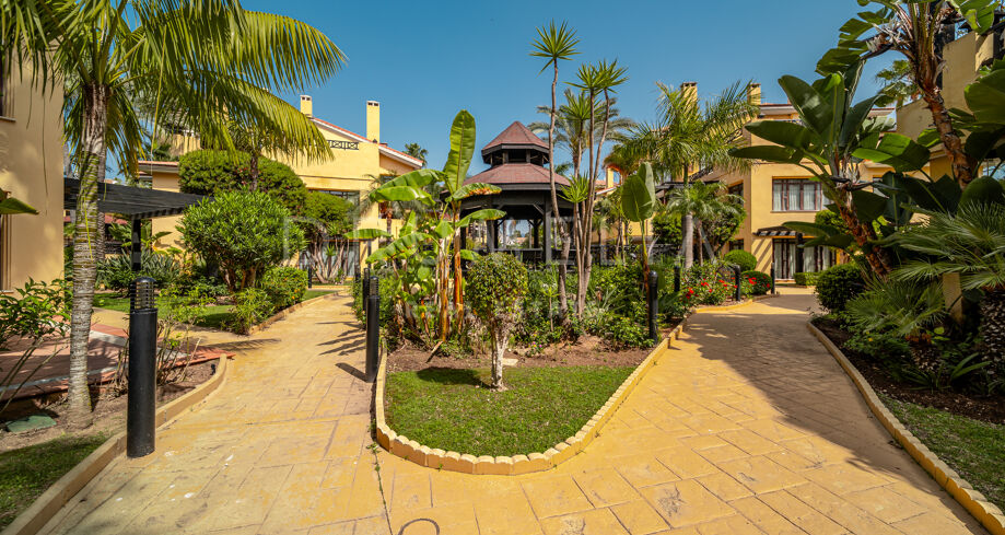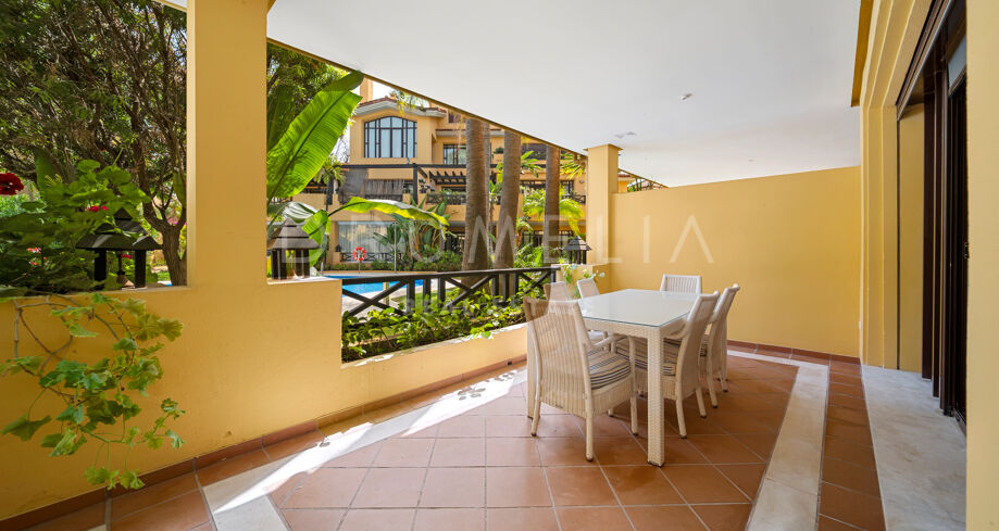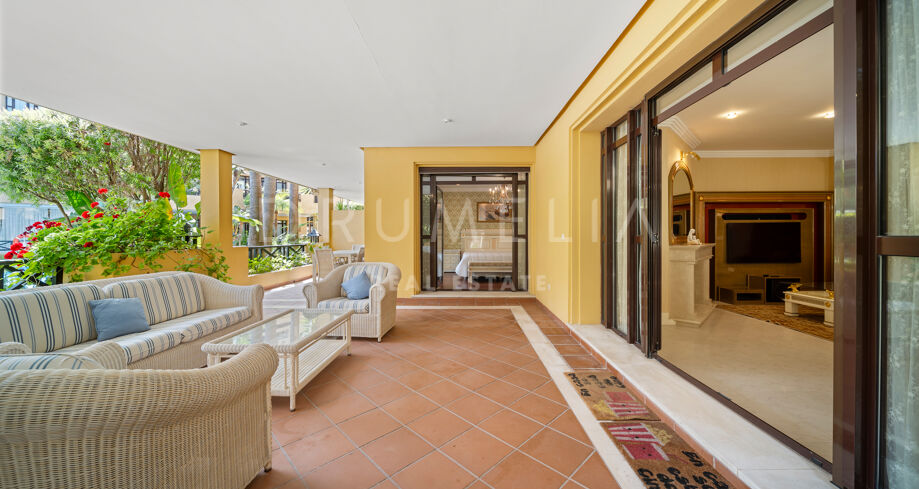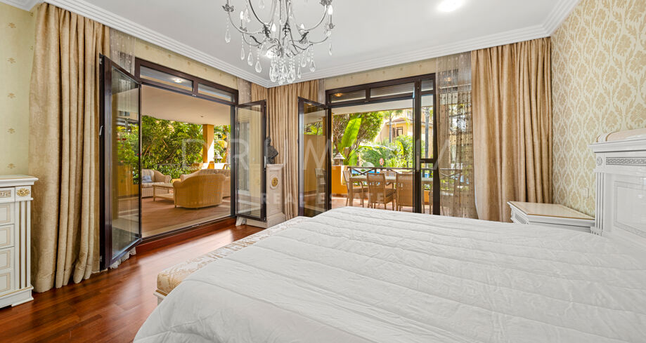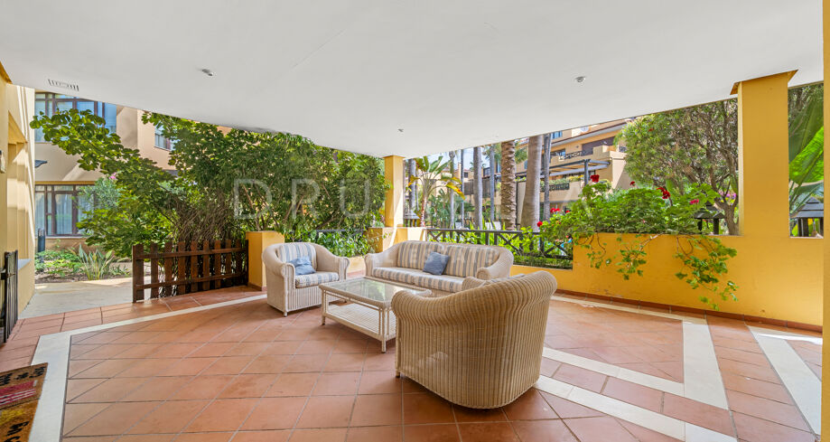 Denna eleganta lägenhet på markplan ligger i det exklusiva och inhägnade området Bahia de Banús, och kombinerar klassisk stil med modern komfort. Det rymliga vardagsrummet och matsalen är smakfullt inredda och öppnar upp till en stor täckt terrass omgiven av frodiga tropiska trädgårdar. Köket är fullt utrustat med vitvaror av hög kvalitet, granitbänkar och ett separat tvättutrymme – perfekt för en bekväm vardag.