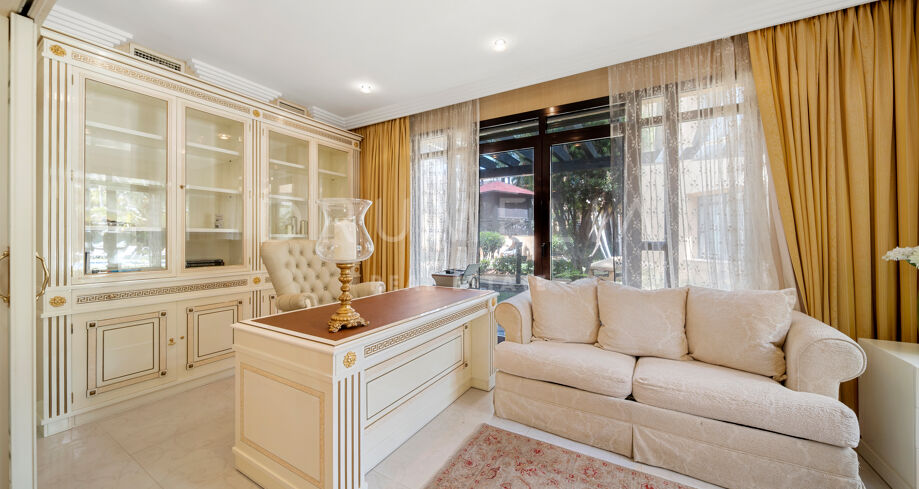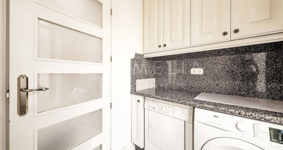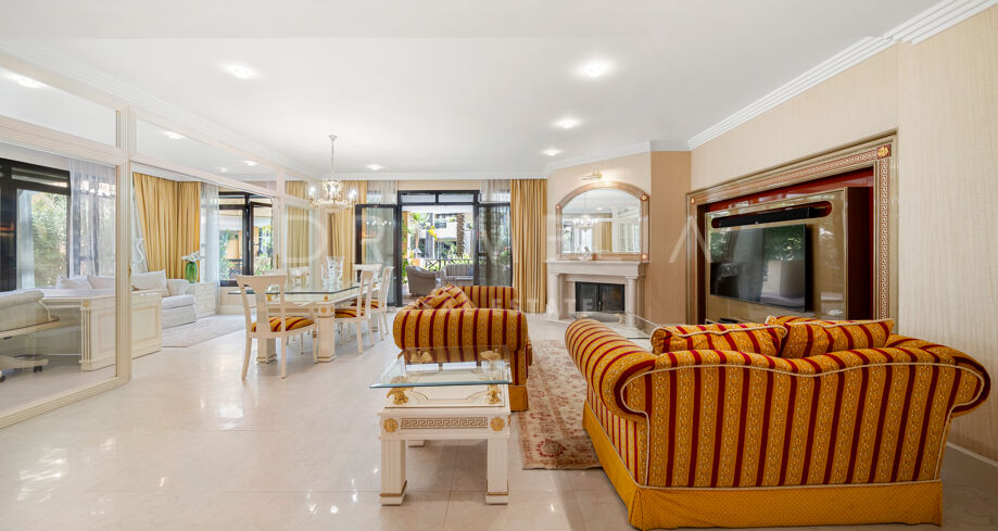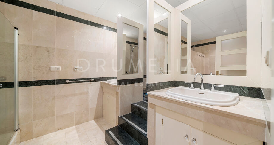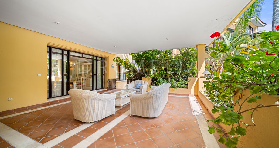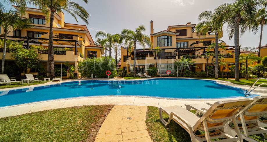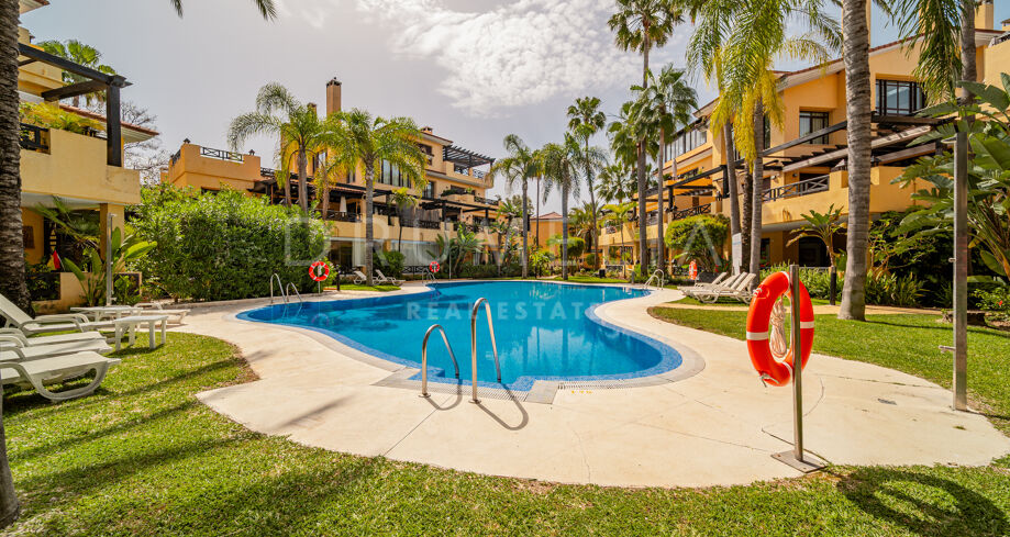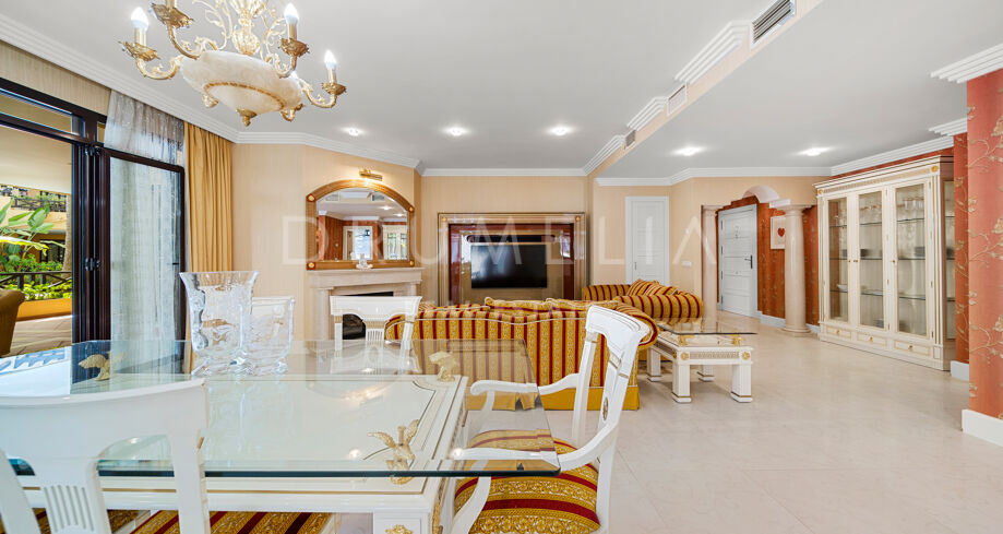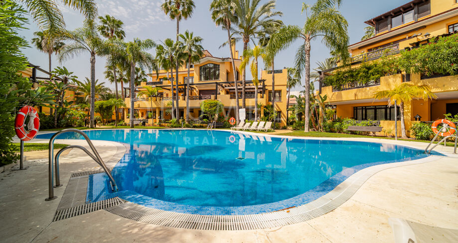 Denna eleganta lägenhet på markplan ligger i det exklusiva och inhägnade området Bahia de Banús, och kombinerar klassisk stil med modern komfort. Det rymliga vardagsrummet och matsalen är smakfullt inredda och öppnar upp till en stor täckt terrass omgiven av frodiga tropiska trädgårdar. Köket är fullt utrustat med vitvaror av hög kvalitet, granitbänkar och ett separat tvättutrymme – perfekt för en bekväm vardag.