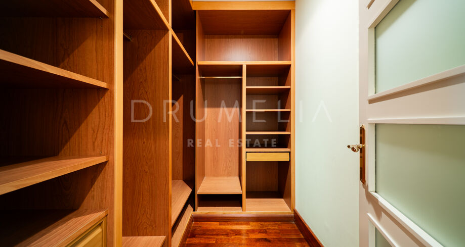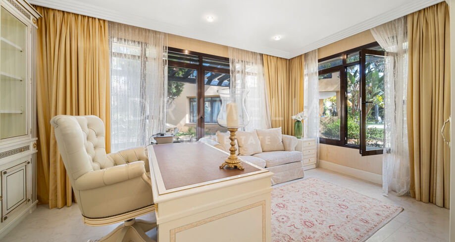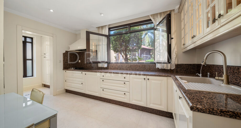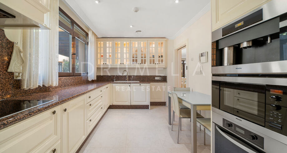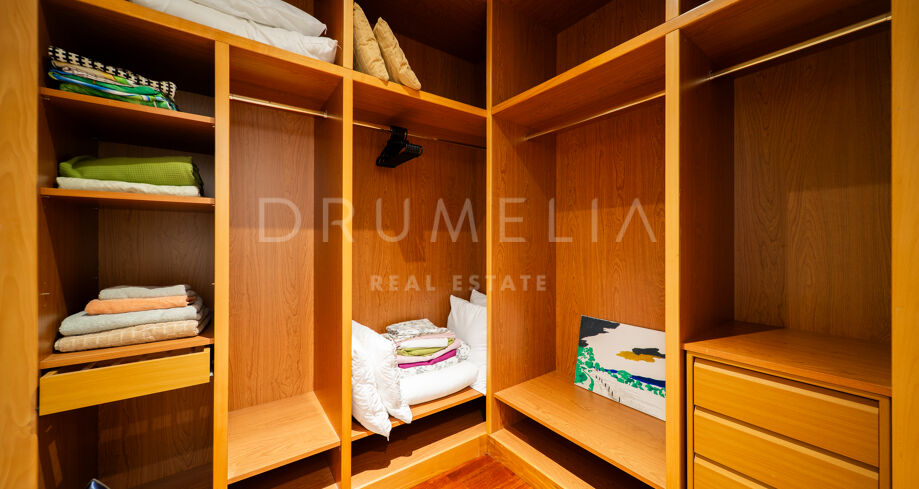 Interiören erbjuder generösa ytor, med vackra sovrum som har stora fönster, walk-in-garderober och badrum i marmor. Mastersovrummet har direkt tillgång till terrassen och skapar en sömlös övergång mellan inomhusliv och utomhusavkoppling. Stora glasdörrar släpper in mycket naturligt ljus och förbinder varje rum med den lugna trädgårdsmiljön utanför.