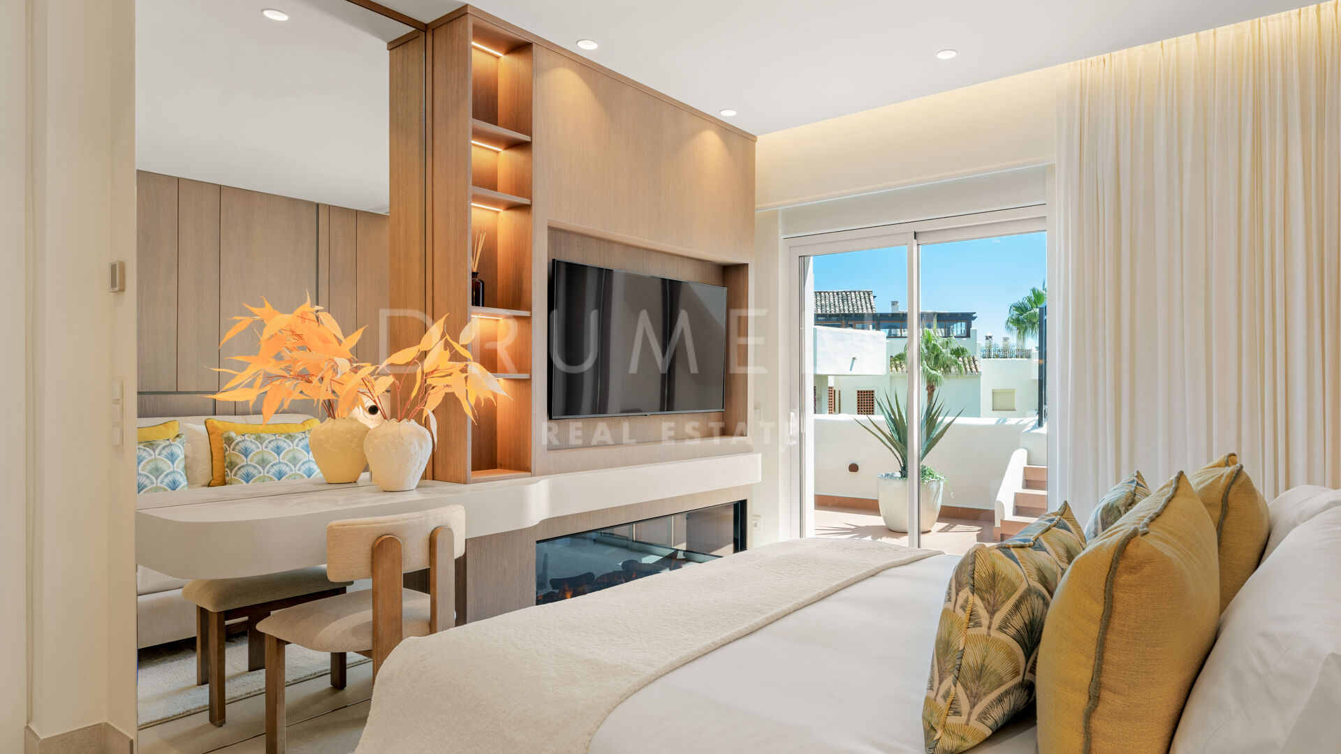 Belägen i det exklusiva strandnära området Bahía del Velerín, mellan Marbella och Estepona, erbjuder denna totalrenoverade takvåning en oöverträffad kombination av modern lyx och medelhavslivsstil. Bostaden ligger i ett säkert, inhägnat område med bevakning dygnet runt, frodiga tropiska trädgårdar, en rogivande lagunliknande pool och en charmig strandchiringuito, vilket fångar essensen av ett liv i resortstil vid kusten.