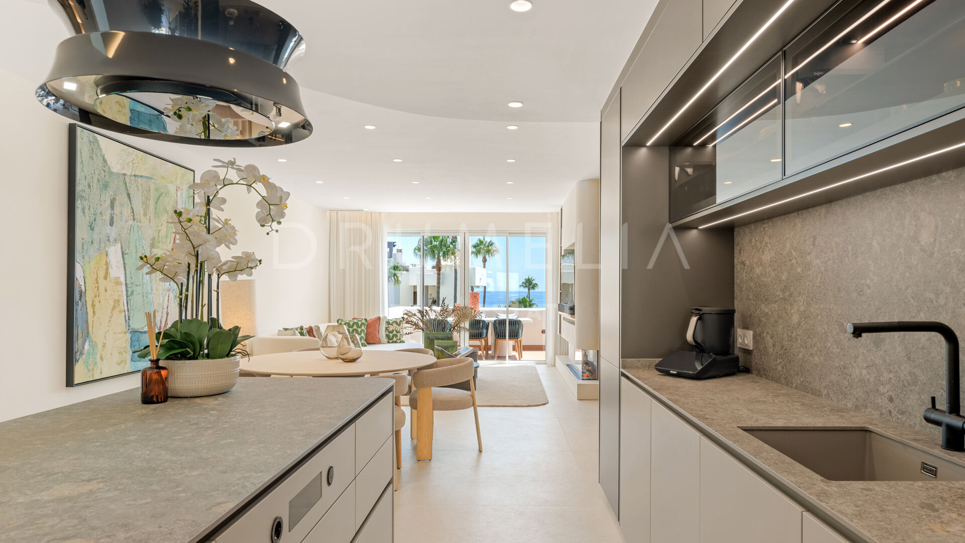 Det rymliga, öppna vardagsrummet och mastersviten badar i naturligt ljus och har fri utsikt över havet som sträcker sig mot horisonten. Hemmets verkliga juvel är det privata taksolariet – en fridfull oas perfekt för solbad, umgänge eller för att njuta av spektakulära solnedgångar över Medelhavet.