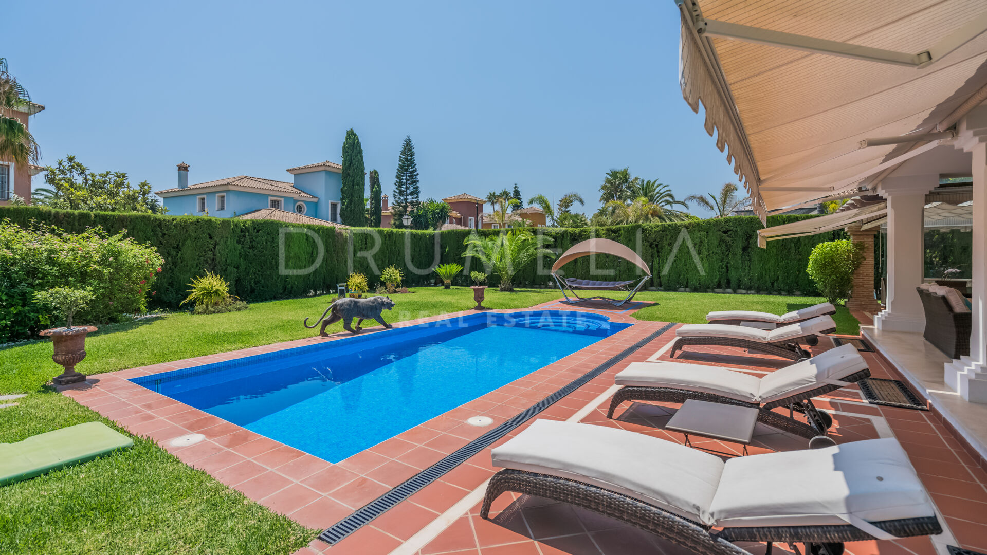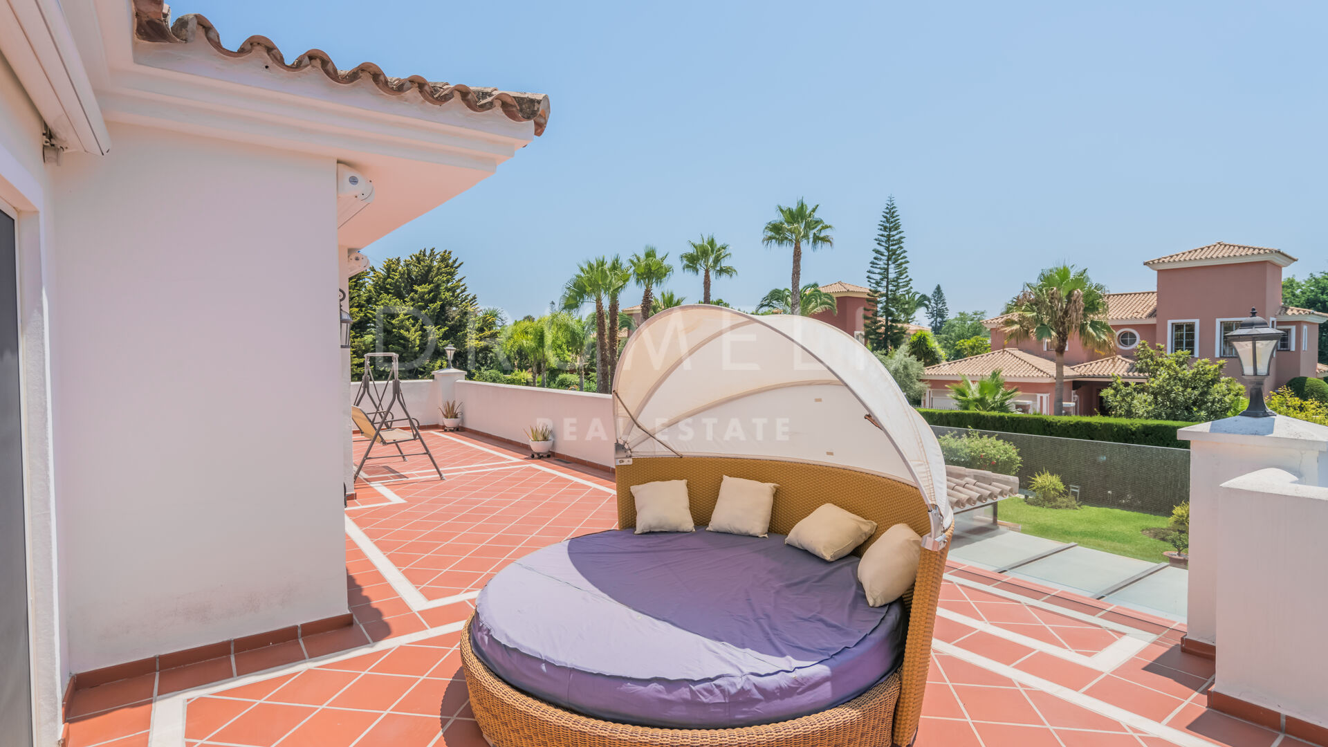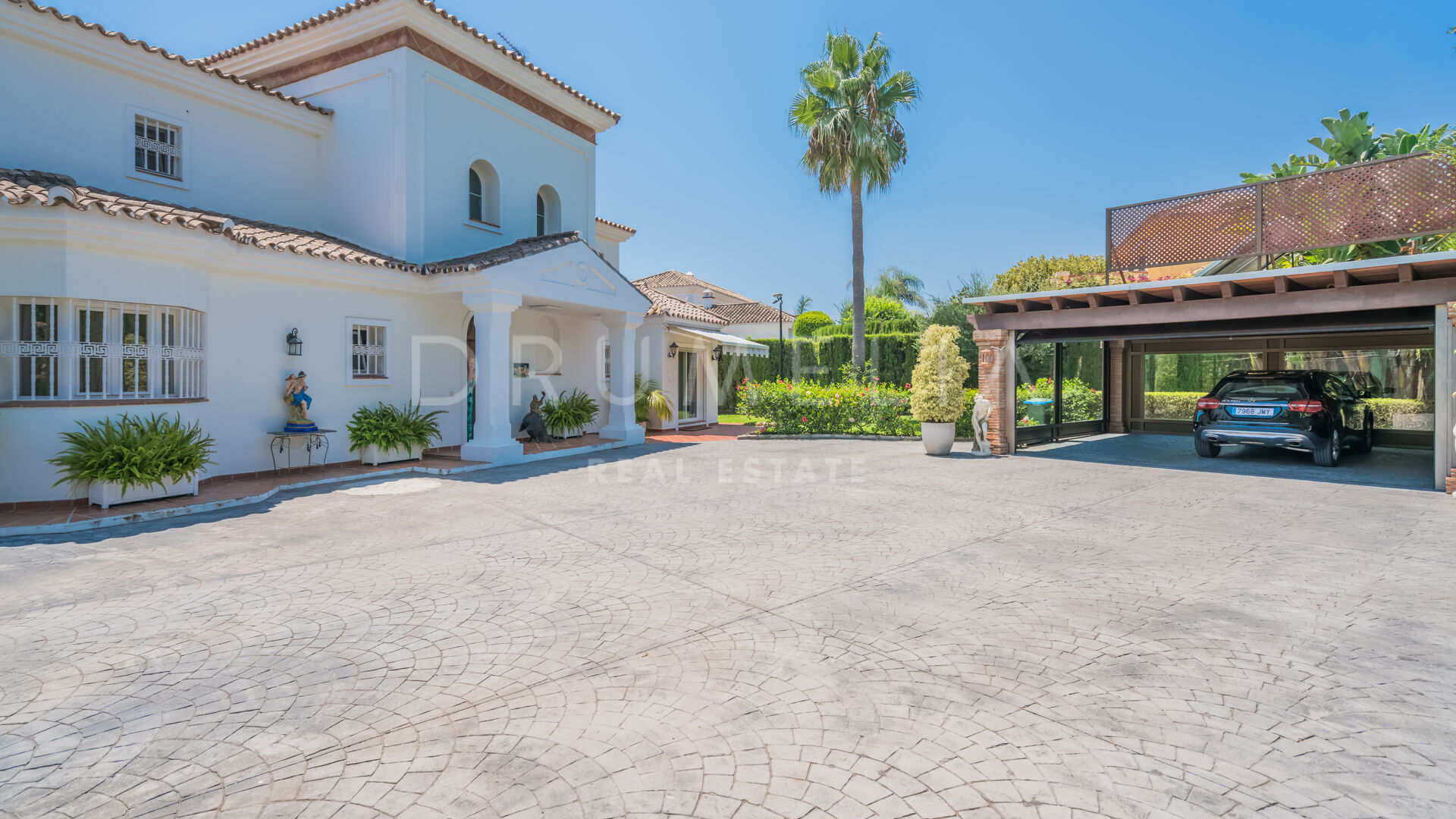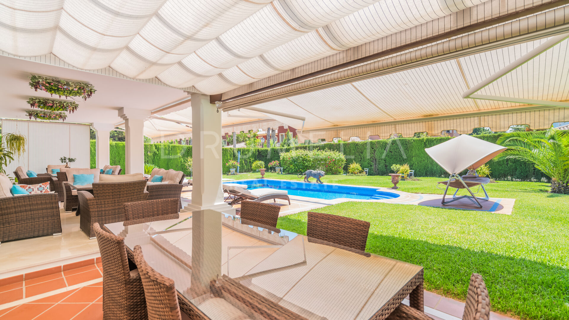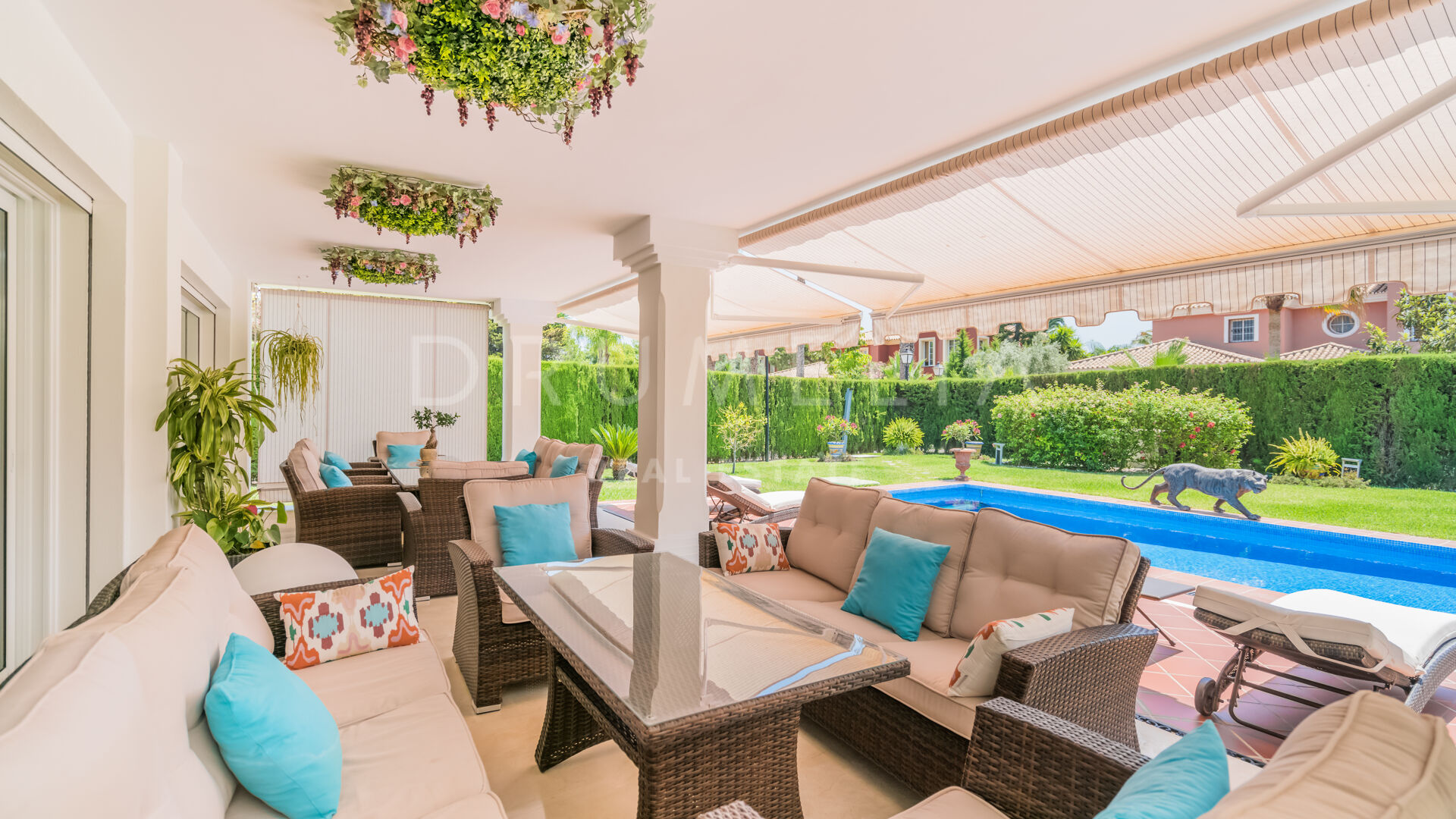 Den sydorienterade villan har gott om sol och ljus som bjuder in till den övre terrassen- solarium, pool med utmärkta solbadplatser, täckta terrasser/allrum på 127 m² med al fresco-matplatser och kaffehörnor, perfekt för avkoppling eller underhållning utomhus. Tomten på 1 109 m² har en välskött trädgård med gröna gräsmattor och rabatter, uppvuxna träd och utomhusstatyer som är i total harmoni med den övergripande stilen.