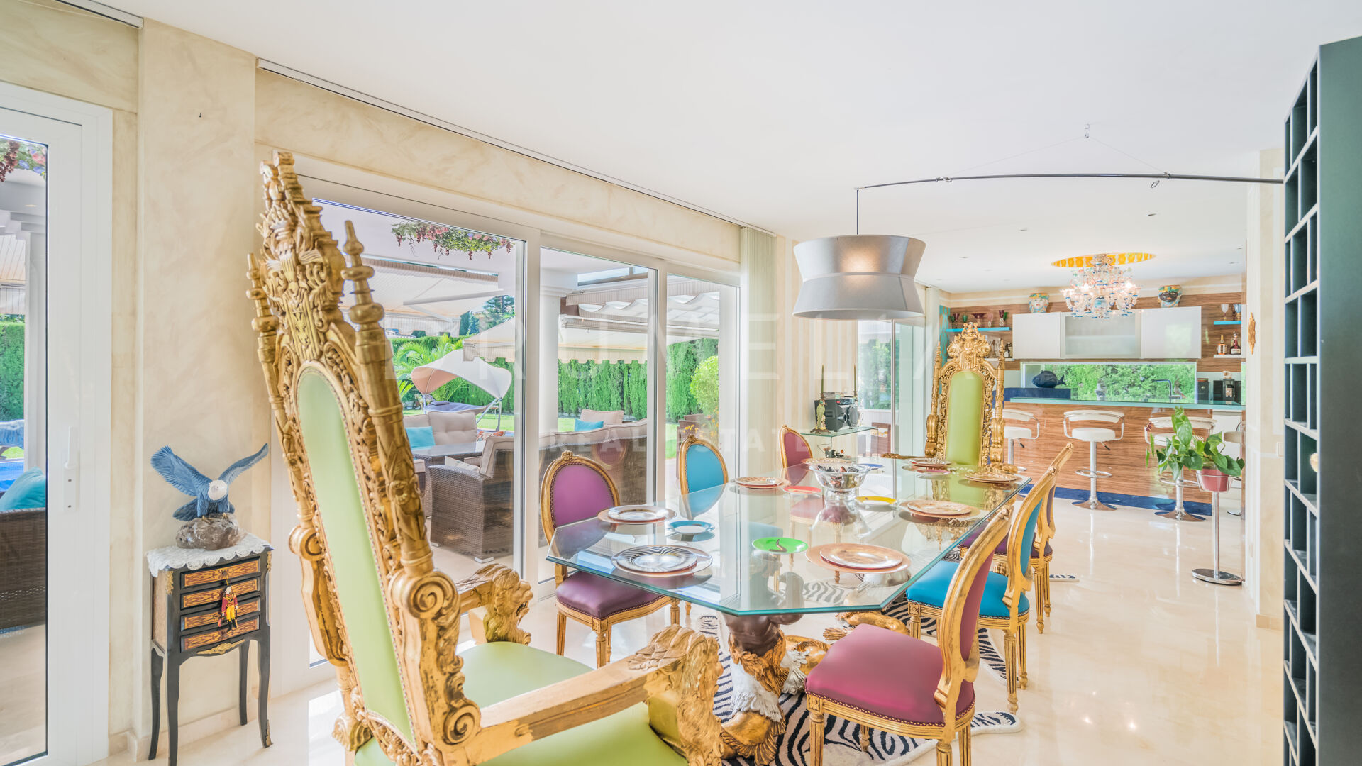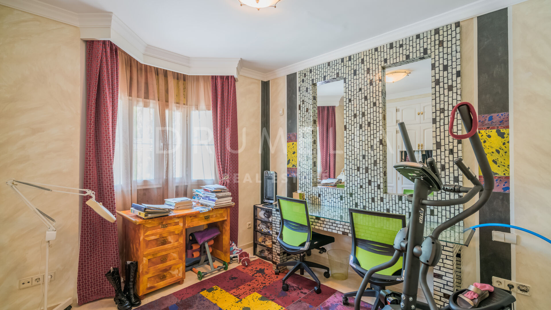 Stilfullt hus på 637 m² är i gott skick, fullt möblerat och inrett (enastående klassiska och moderna möbler, dyrbara mattor och mattor, kristallkronor, etnisk inredning). Det erbjuder 3 våningar med rymligt ljust vardagsrum, salong som håller det etniska temat, bibliotek, 5 sovrum med 5 badrum, 1 gästtoalett, tvättstuga, privat garage, kontor och fitnesshörna. Fullt utrustat öppet kök med innovativ design, modern bar och djärva glada färger som passar perfekt till matsalen med zebramatta och toppmoderna möbler.
