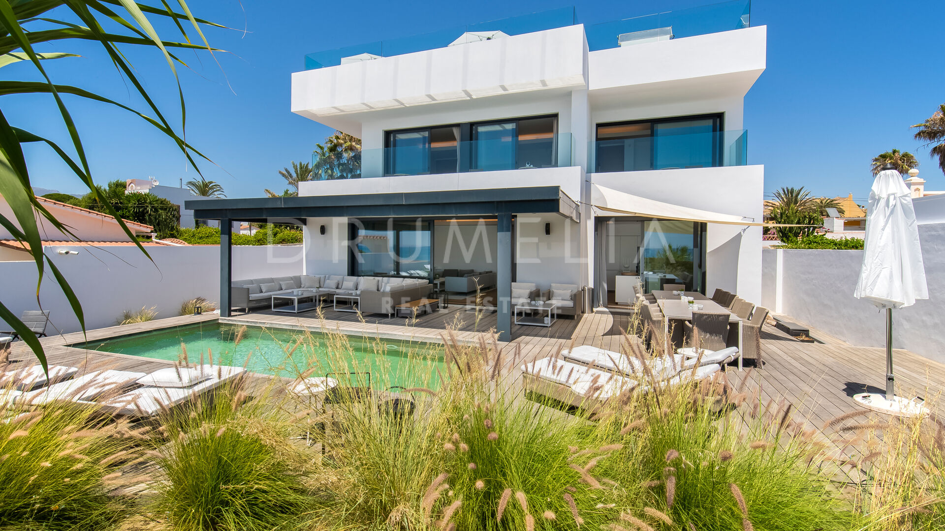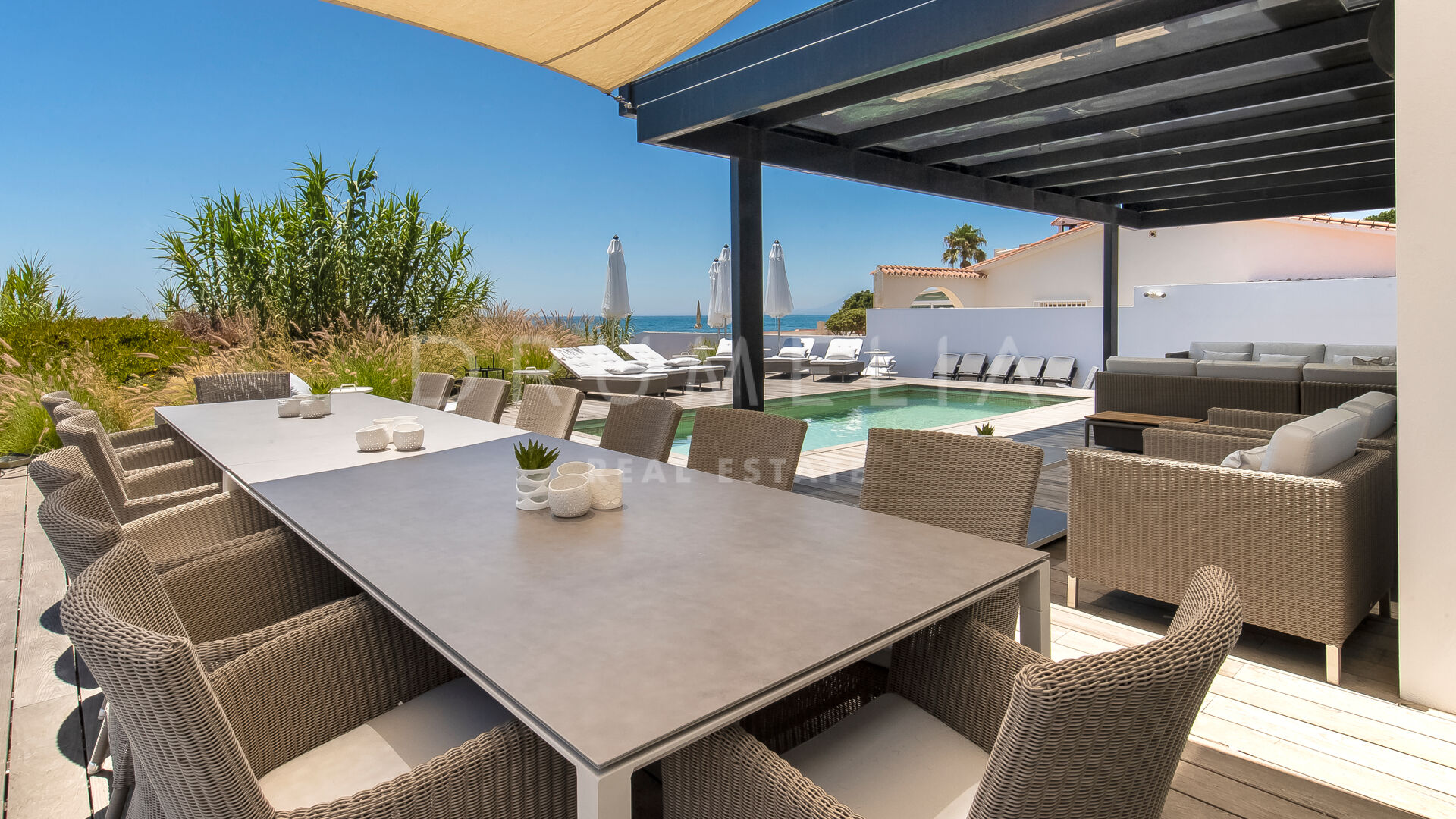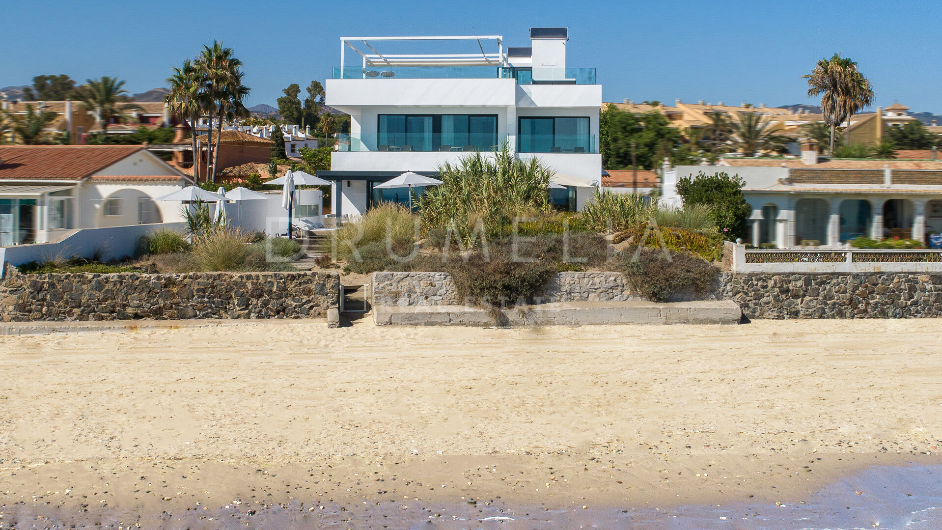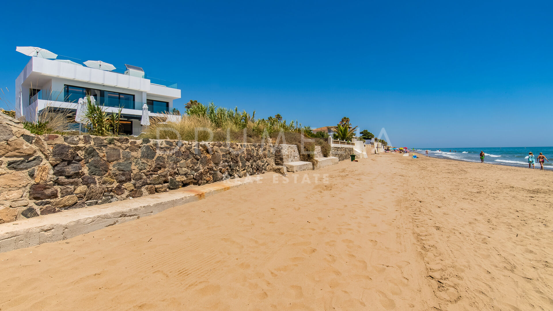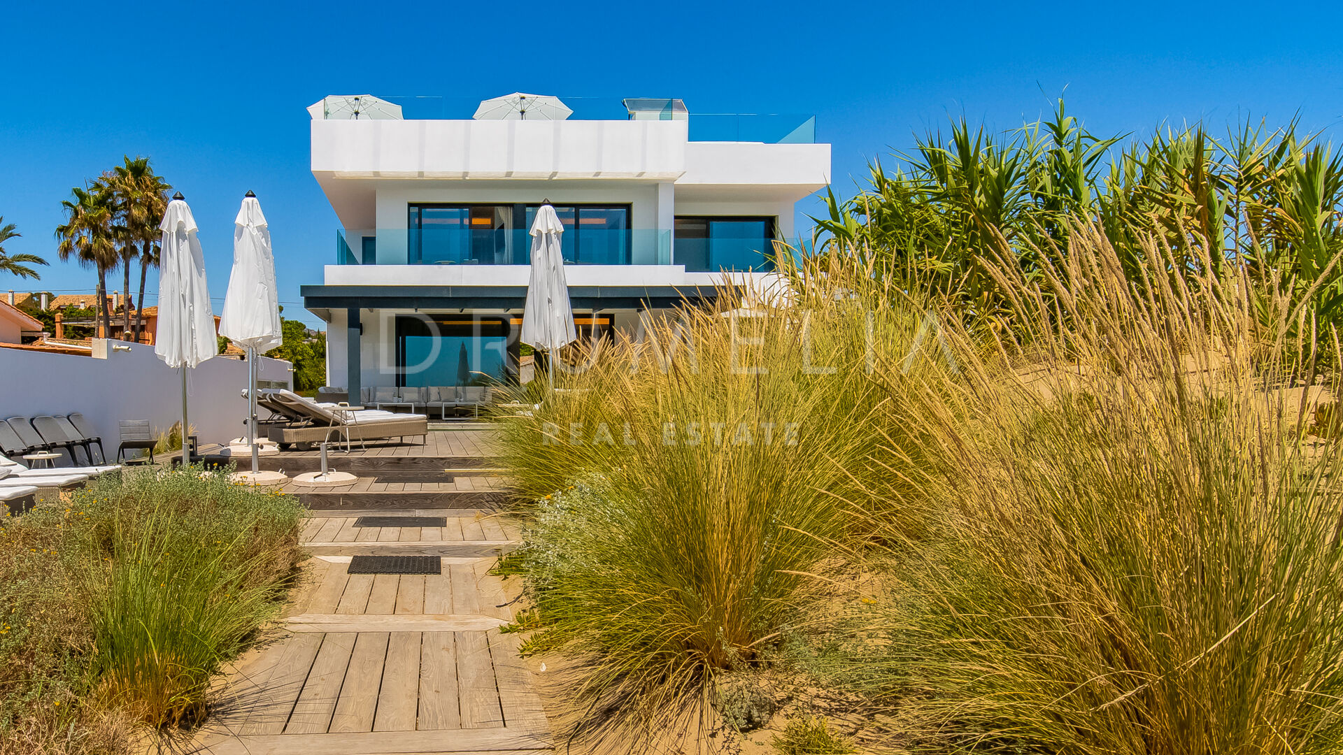 Den har utformats på ett utsökt sätt av Marbellas främsta arkitekt Jose Carlos Moya och har nybyggts enligt högsta standard i en fascinerande naturmiljö. Fastigheten i modern stil på 558 m² imponerar med känslan av avskildhet, modern sofistikering och elegans. Ytterdörren öppnar upp till den dubbla höjden rymliga entréhallen som leder till ett omfattande vardagsrum med matplats och ett stort och smart kök i öppen planlösning, fullt och utmärkt utrustat med de senaste moderna apparaterna. På entréplanet finns också ett gästrum med inbyggd/walk-in-garderob och badrum. Från både kök och vardagsrum leder stora skjutdörrar med elektriska säkerhetsgardiner till en elegant terrass med däck och en uppvärmd pool. En pittoresk stig från poolområdet leder genom sanddynerna direkt till stranden! Havet kommer definitivt att vara en del av ditt hem här.