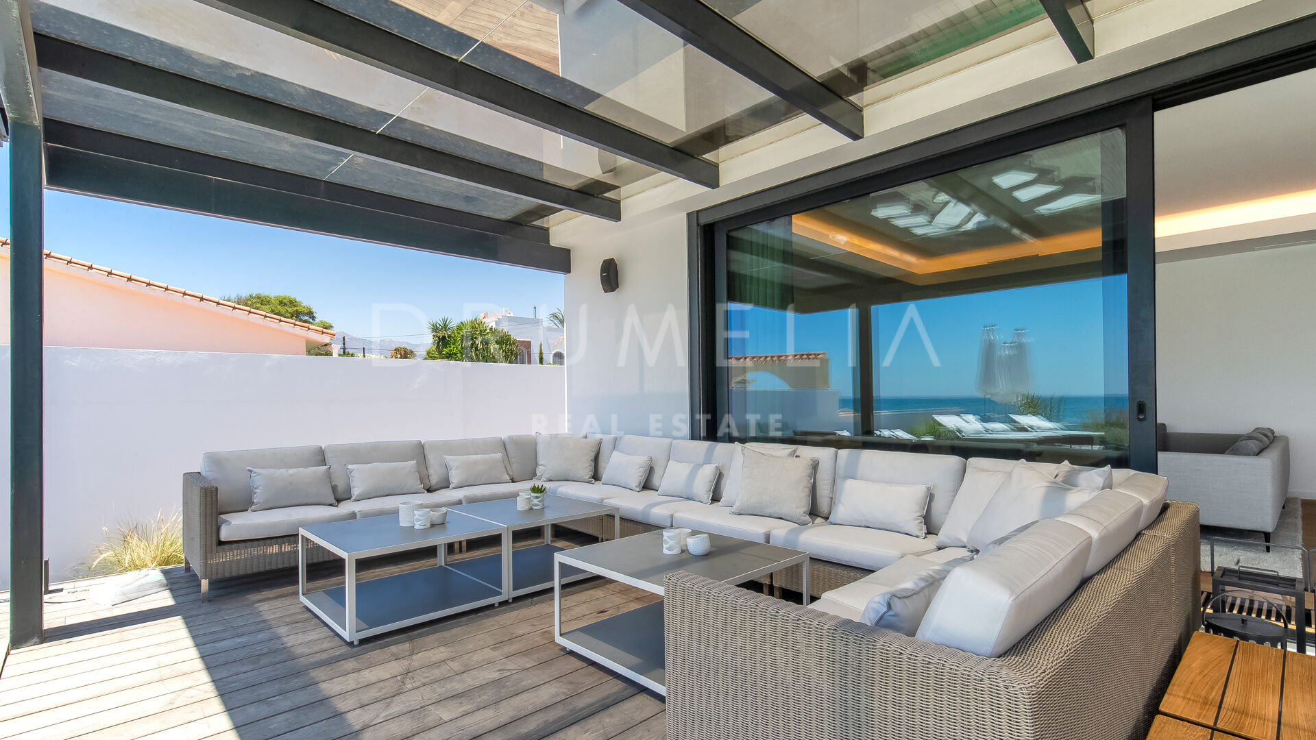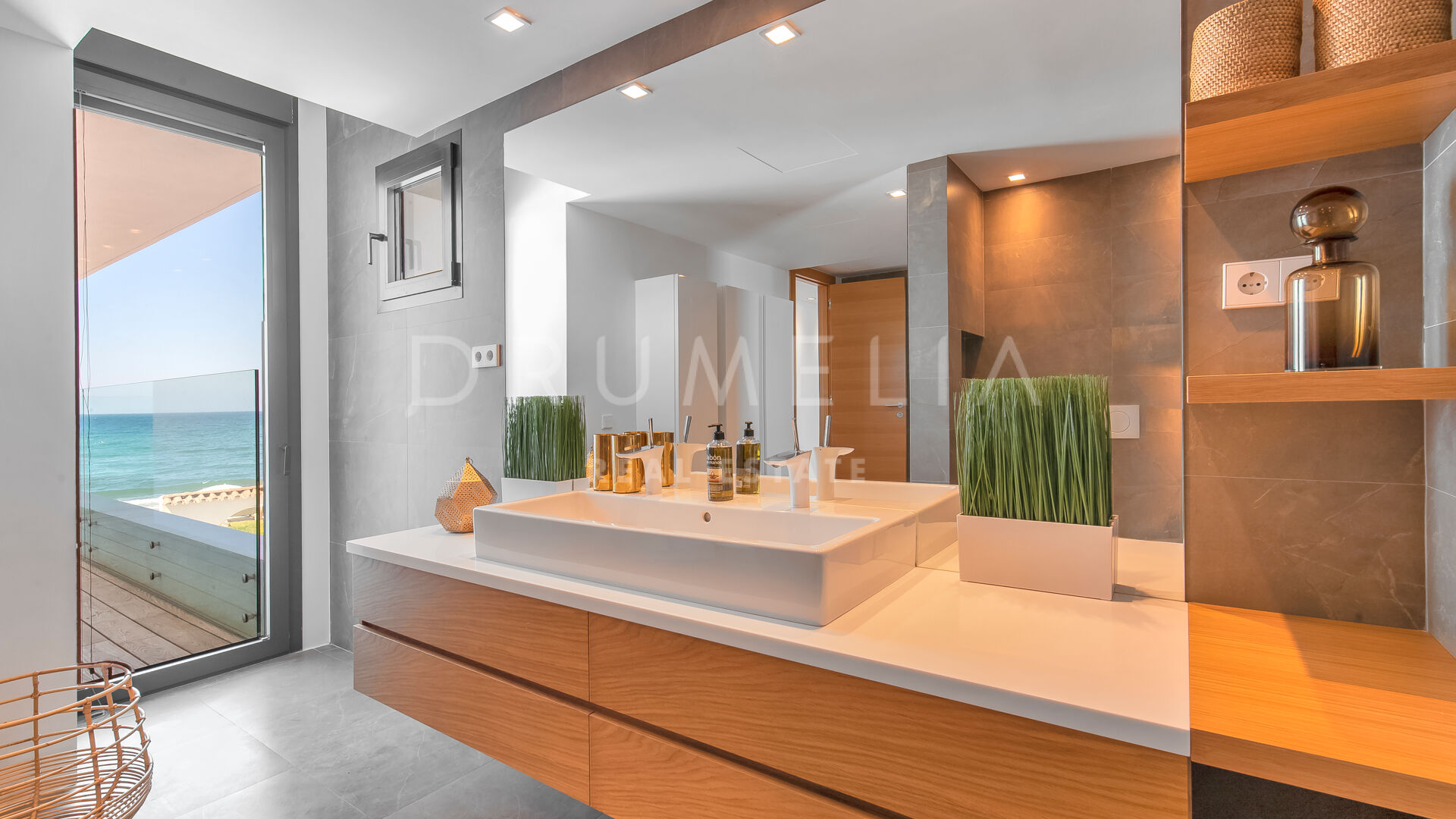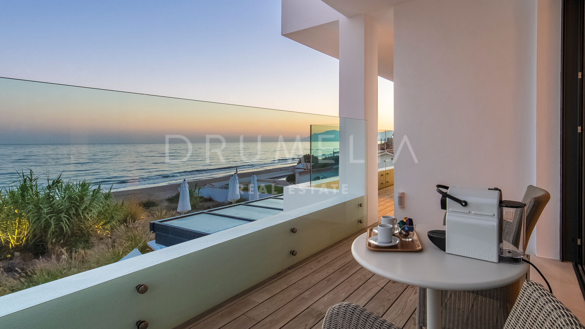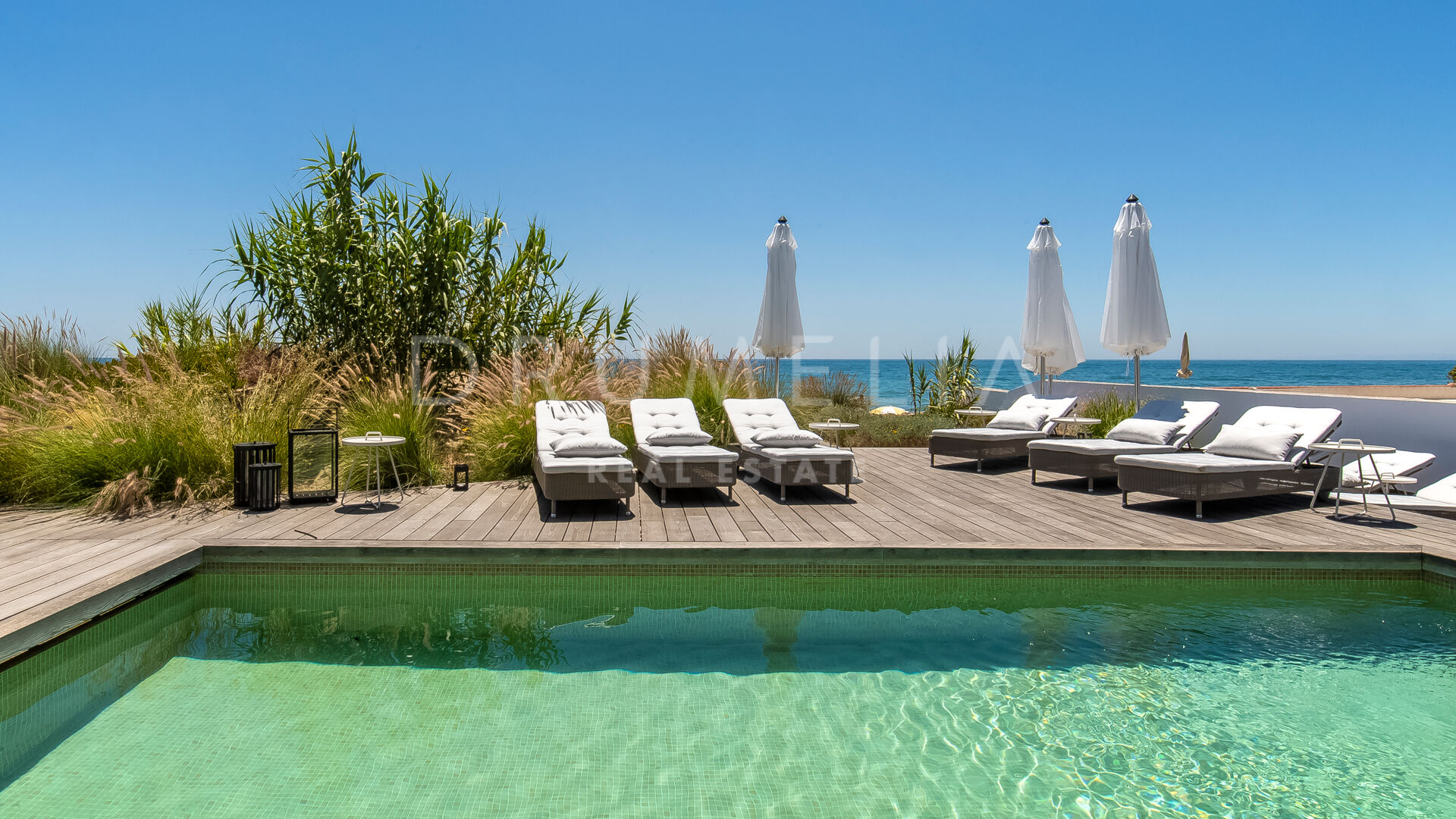 Den har utformats på ett utsökt sätt av Marbellas främsta arkitekt Jose Carlos Moya och har nybyggts enligt högsta standard i en fascinerande naturmiljö. Fastigheten i modern stil på 558 m² imponerar med känslan av avskildhet, modern sofistikering och elegans. Ytterdörren öppnar upp till den dubbla höjden rymliga entréhallen som leder till ett omfattande vardagsrum med matplats och ett stort och smart kök i öppen planlösning, fullt och utmärkt utrustat med de senaste moderna apparaterna. På entréplanet finns också ett gästrum med inbyggd/walk-in-garderob och badrum. Från både kök och vardagsrum leder stora skjutdörrar med elektriska säkerhetsgardiner till en elegant terrass med däck och en uppvärmd pool. En pittoresk stig från poolområdet leder genom sanddynerna direkt till stranden! Havet kommer definitivt att vara en del av ditt hem här.