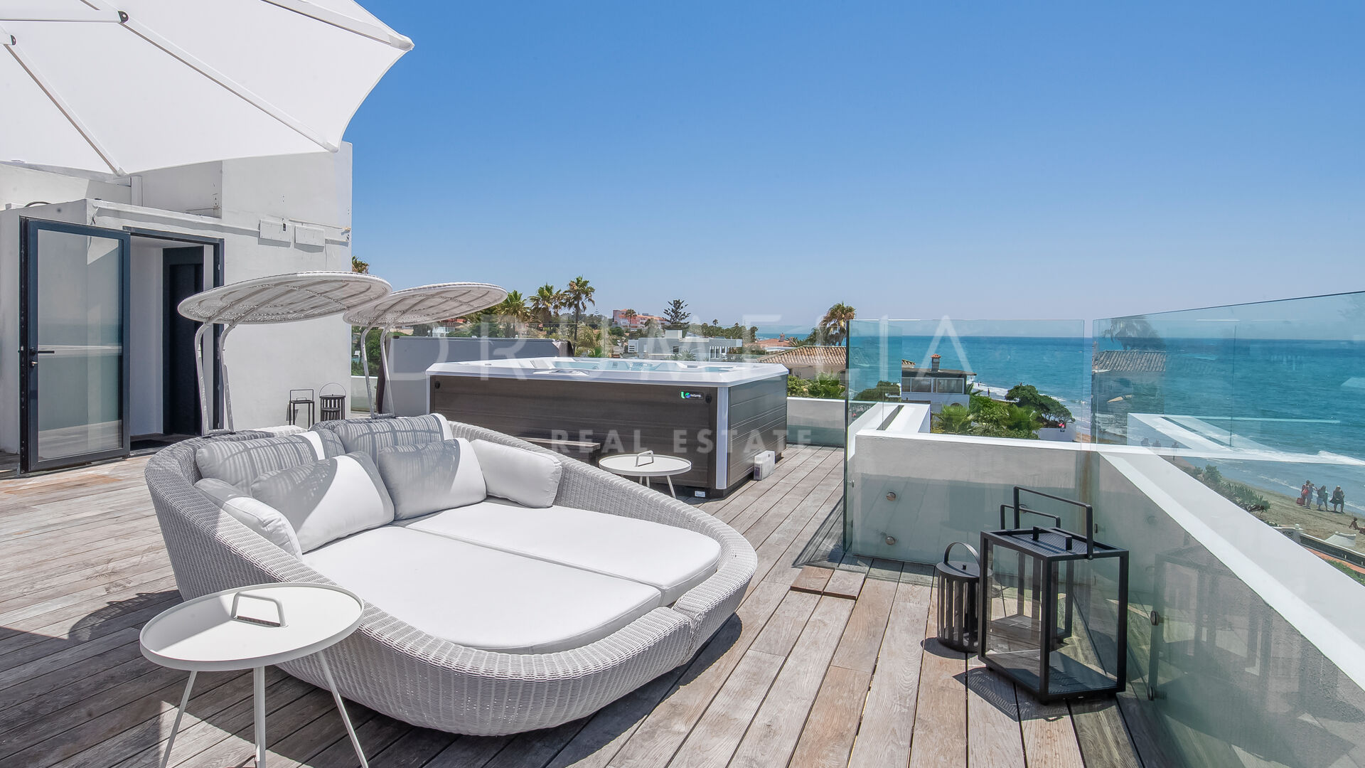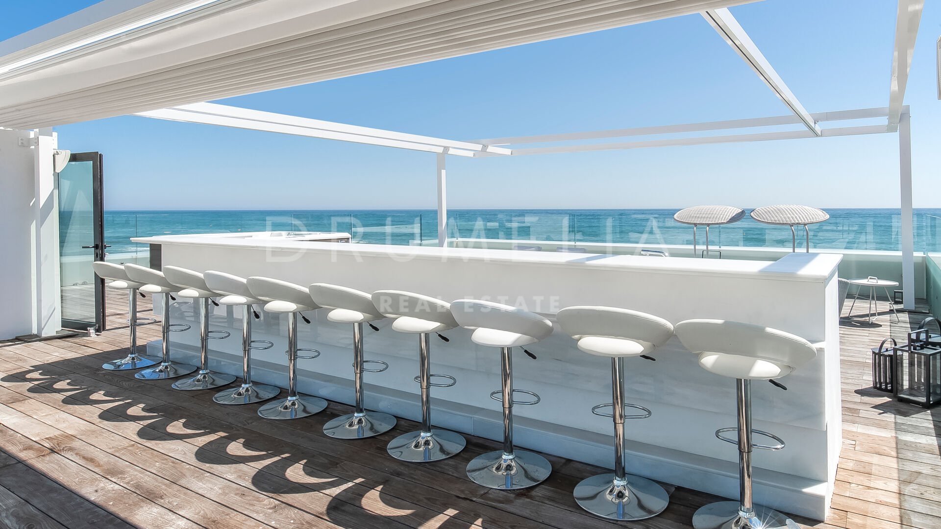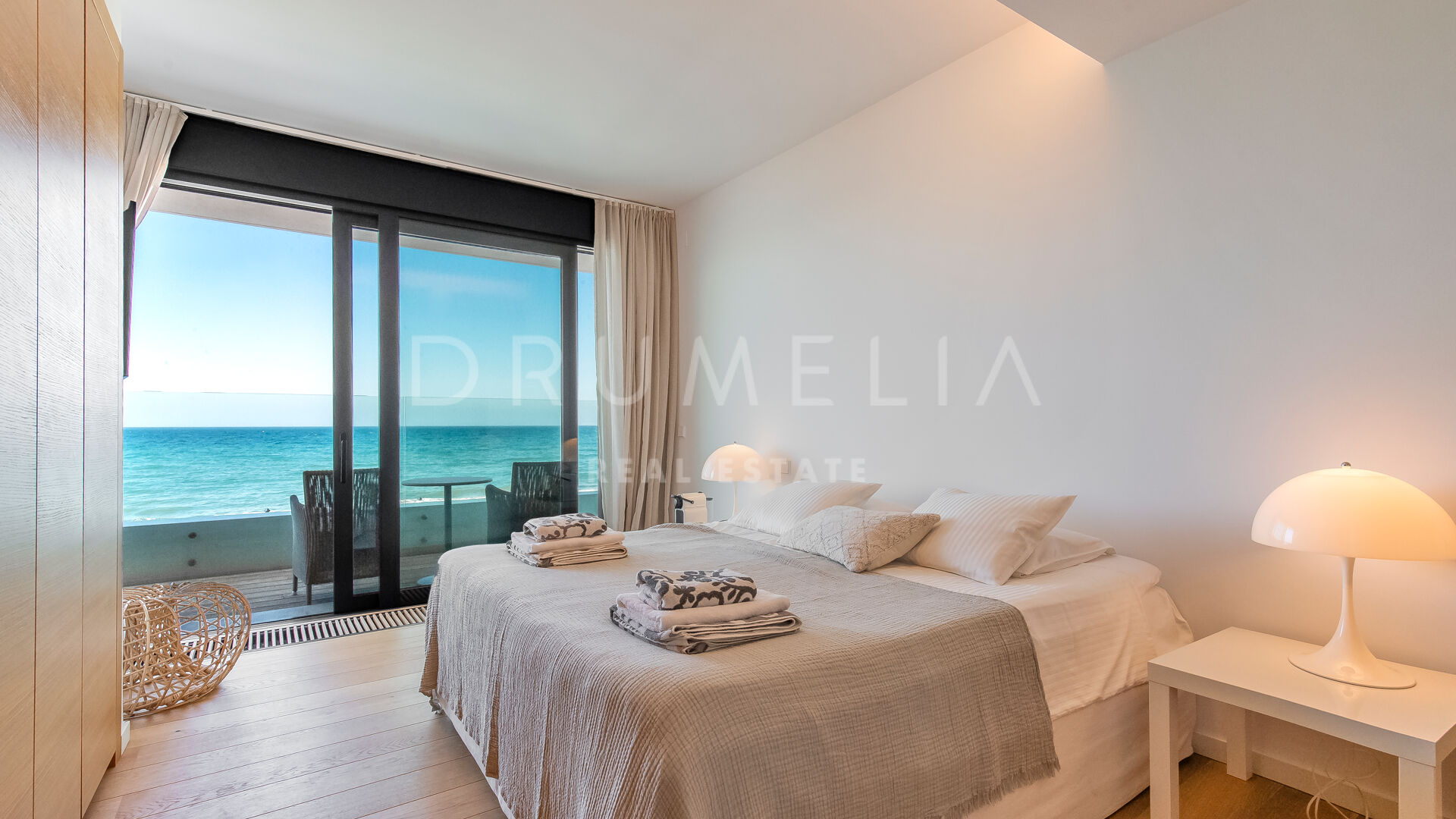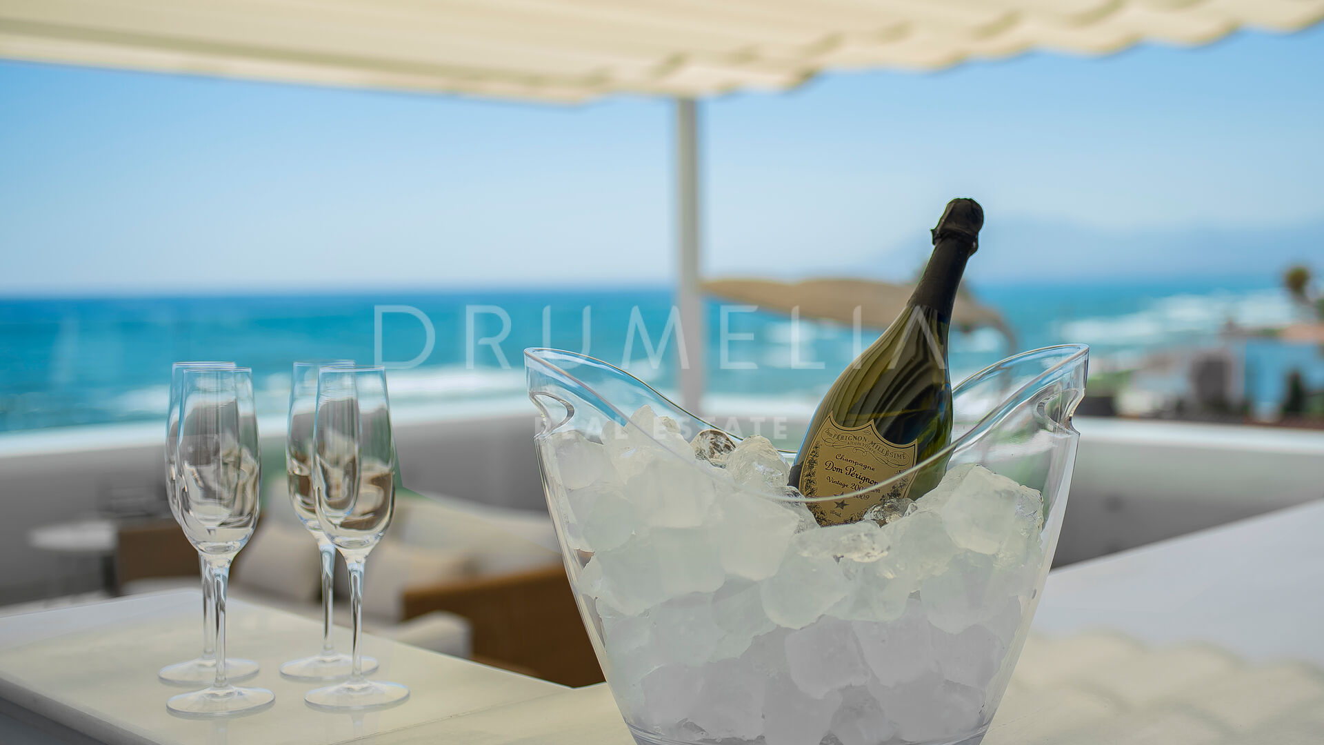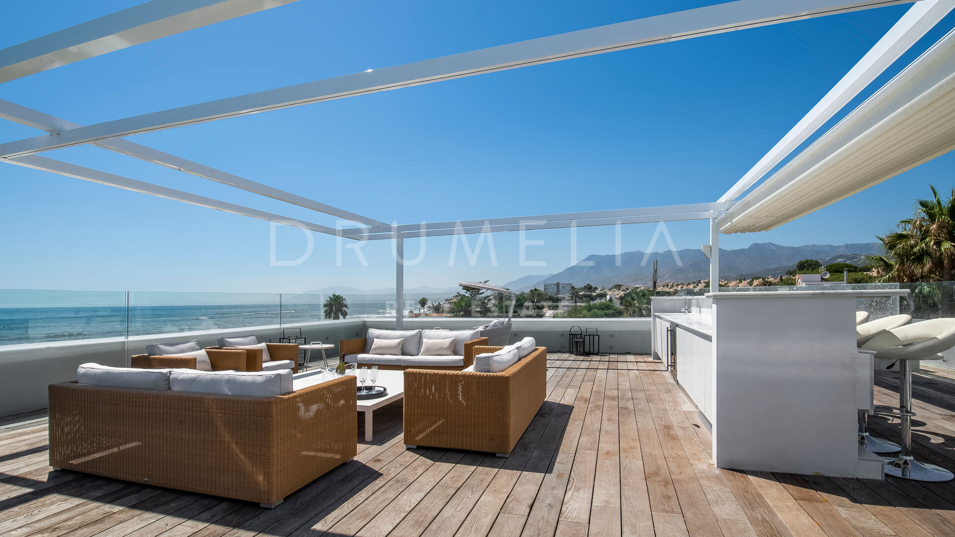 Den har utformats på ett utsökt sätt av Marbellas främsta arkitekt Jose Carlos Moya och har nybyggts enligt högsta standard i en fascinerande naturmiljö. Fastigheten i modern stil på 558 m² imponerar med känslan av avskildhet, modern sofistikering och elegans. Ytterdörren öppnar upp till den dubbla höjden rymliga entréhallen som leder till ett omfattande vardagsrum med matplats och ett stort och smart kök i öppen planlösning, fullt och utmärkt utrustat med de senaste moderna apparaterna. På entréplanet finns också ett gästrum med inbyggd/walk-in-garderob och badrum. Från både kök och vardagsrum leder stora skjutdörrar med elektriska säkerhetsgardiner till en elegant terrass med däck och en uppvärmd pool. En pittoresk stig från poolområdet leder genom sanddynerna direkt till stranden! Havet kommer definitivt att vara en del av ditt hem här.