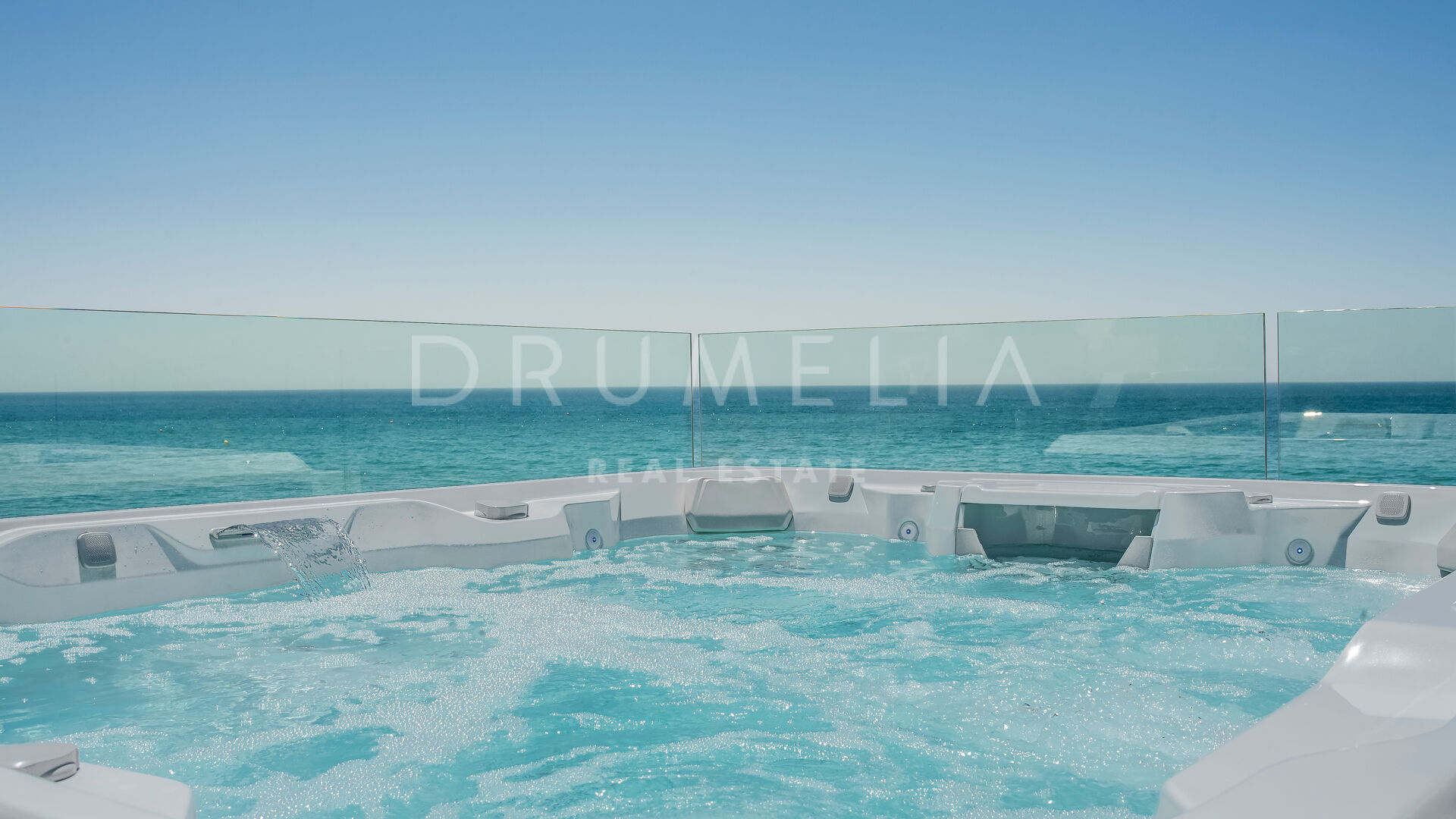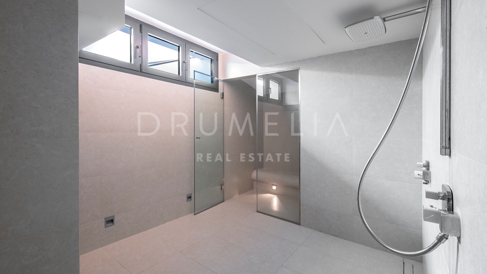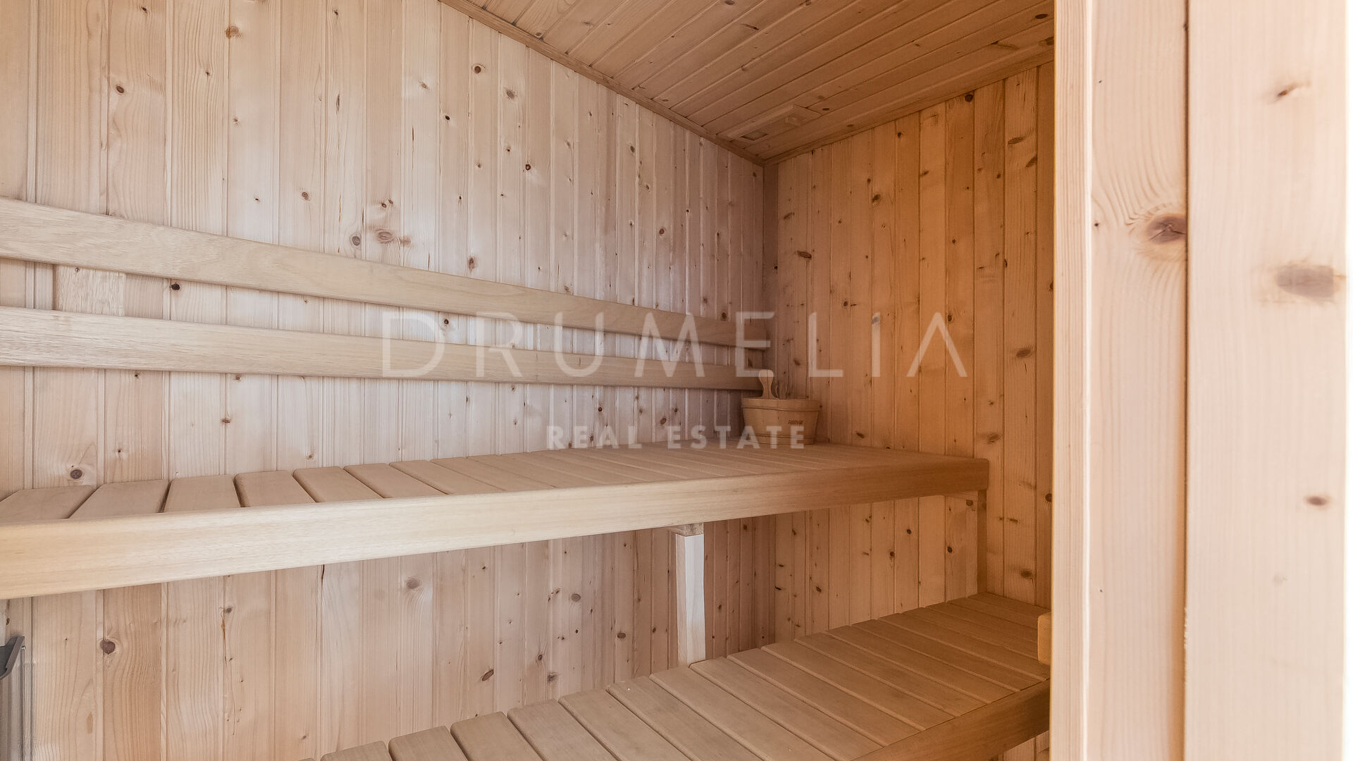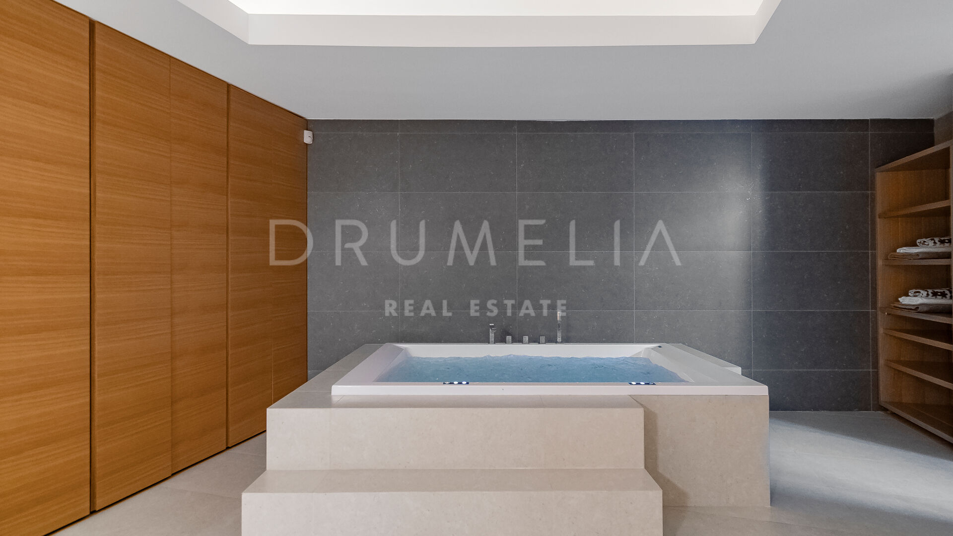 På övervåningen finns det 3 sovrum: Master Suite med 2 garderober, badrum och terrass, och 2 sovrum som delar på ett badrum, vart och ett med direkt tillgång till terrass som erbjuder fantastisk havsutsikt. Det nedre våningsplanet har naturligt ljus och hyser ytterligare 2 sovrum med inbyggda garderober och ett badrum, samt SPA-område med jacuzzi, ångbad, bastu och duschar; förråd och tvättstuga. Ett fantastiskt solarium/terrass på taket med pergola och jacuzzi är perfekt för att njuta av en häpnadsväckande 360-graders utsikt och magnifika solnedgångar. Här finns också fitnessutrustning.
