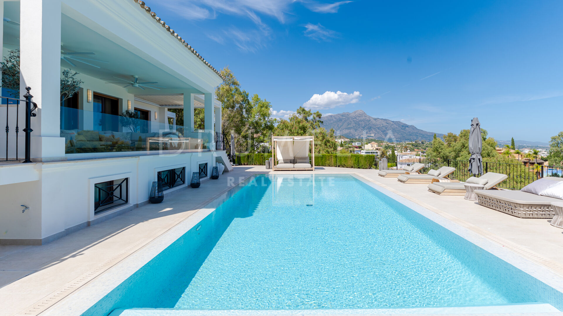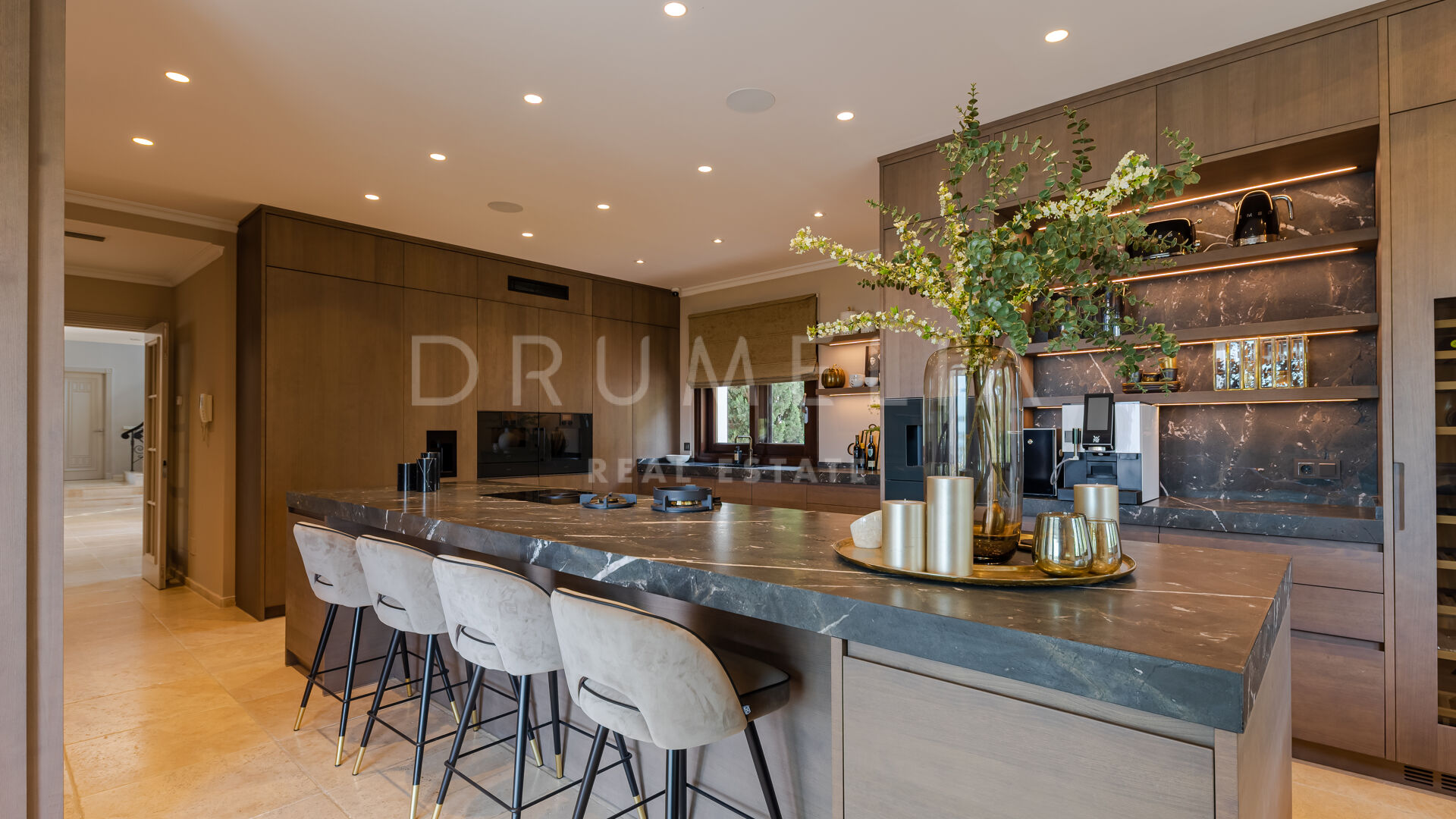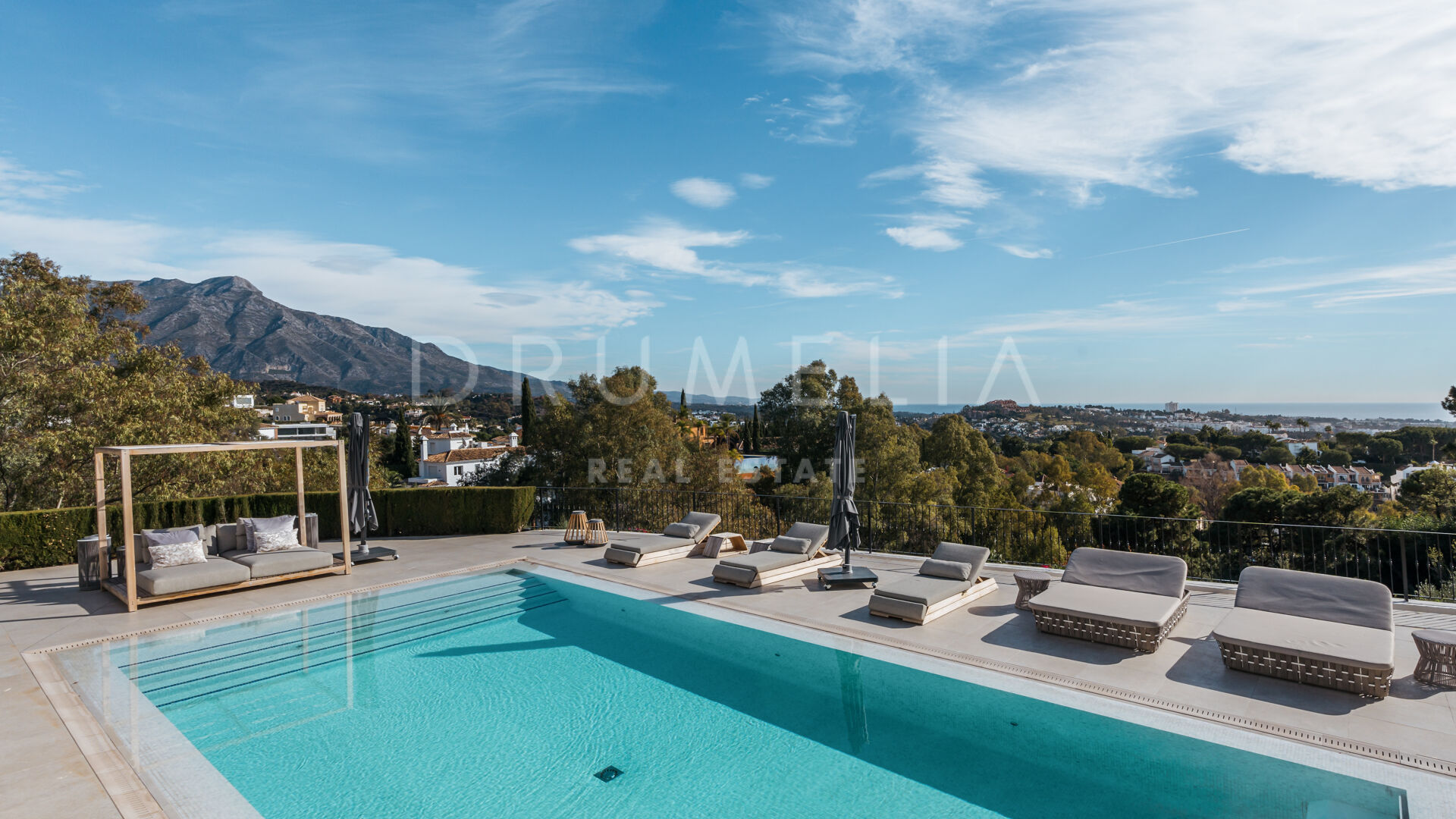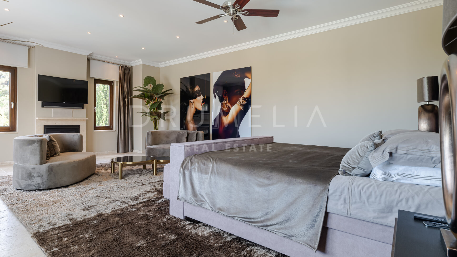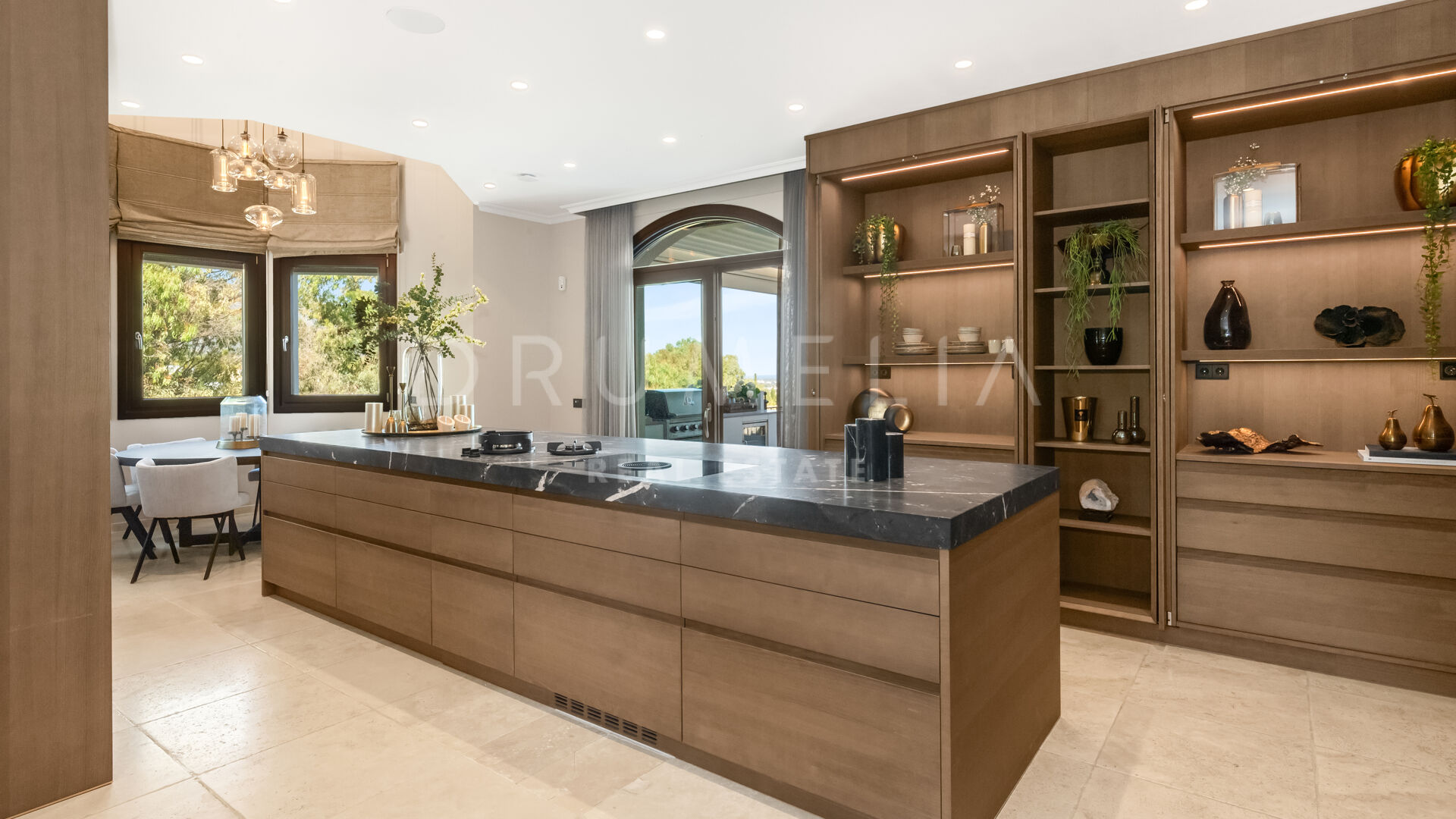 Den renoverade och omsorgsfullt designade bostaden på 1 014 m² med 211 m² terrasser ligger på en tomt på 10 100 m², omgiven av naturen och de exklusiva fastigheterna i La Quinta. Detta är ett verkligt arkitektoniskt mästerverk i modern klassisk stil… aka tidlöst! Det sätter en ny standard för raffinerat boende och kombinerar utan ansträngning modernitet och tradition. När du kliver in i huset blir du fängslad av den storslagenhet och elegans som breder ut sig framför dig. Uppmärksamheten på detaljer är uppenbar i varje hörn, från de noggrant utformade ytorna till de tankeväckande kuraterade designelementen. De stora fönstren och de vidsträckta terrasserna på den söderläge fastigheten erbjuder vidsträckt utsikt över det blå Medelhavet och de majestätiska bergen som ramar in landskapet. 2 rymliga lounger med plyschmöbler och magnifika konstverk inbjuder din familj och gäster att koppla av i oöverträffad komfort och stil. Det utsökta huset har 7 överdådigt inredda sovrumssviter, alla med eget badrum, inbyggda garderober eller omklädningsrum. 8 lyxiga badrum ger största möjliga bekvämlighet och funktionalitet för de kräsna invånarna i denna villa. Ett fantastiskt modernt kök är utrustat med hushållsapparater av högsta kvalitet, en ö och en frukostplats, och ansluten till en grillterrass. Ett förråd är bekvämt beläget för att tillgodose dina organisatoriska behov.