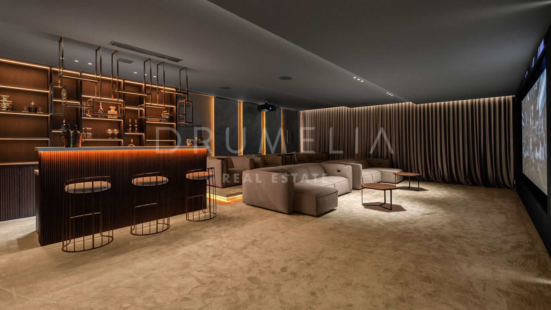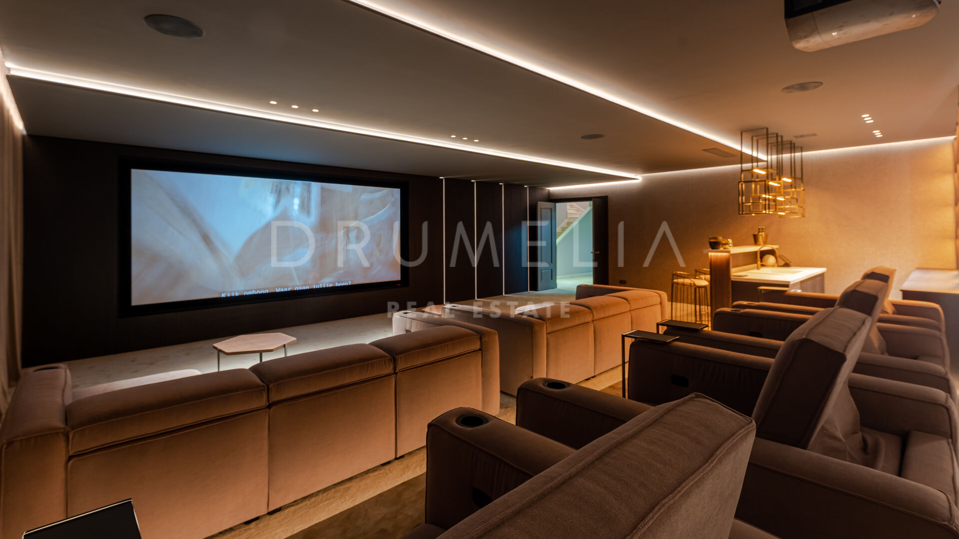Unna dig en filmupplevelse utan dess like i det toppmoderna biorummet, där du kan njuta av de senaste storfilmerna eller dina favoritklassiker i absolut avskildhet och komfort. Upprätthåll din fitnessrutin i ett fullt utrustat gym med panoramautsikt över de omgivande bergen. Varva ner i värmen i din egen bastu. Villans utomhusområde är en oas av avkoppling och underhållning, utrustad med ett utomhuskök och matplats utomhus. Fördjupa dig i den inbjudande poolen eller sola i Medelhavssolen på de lyxiga solstolarna. I den välskötta subtropiska trädgården kan man njuta av blommornas doft och naturens lugnande ljud.