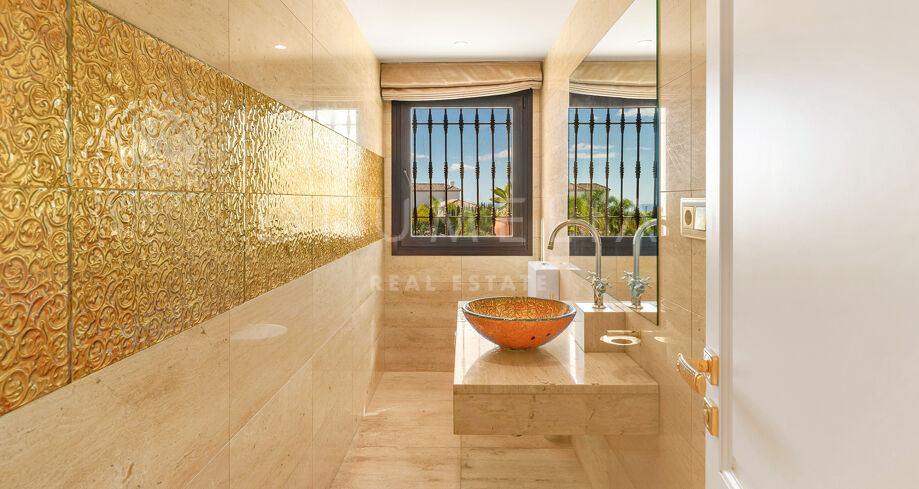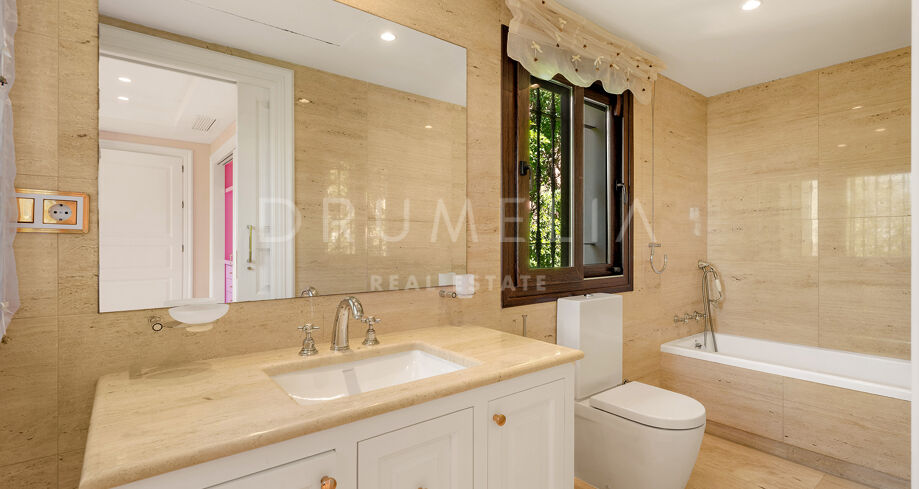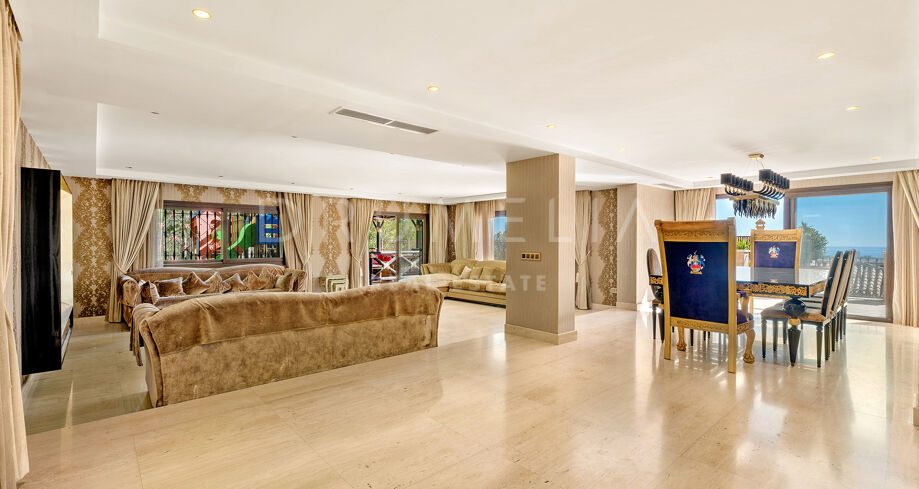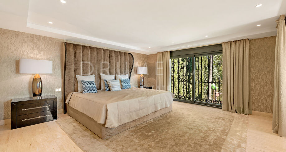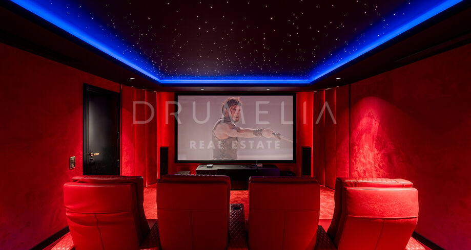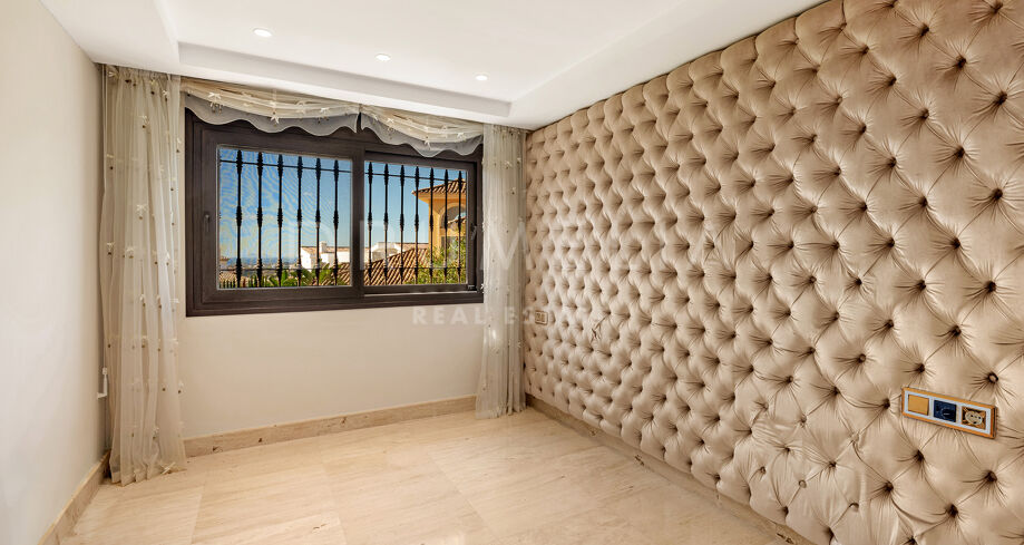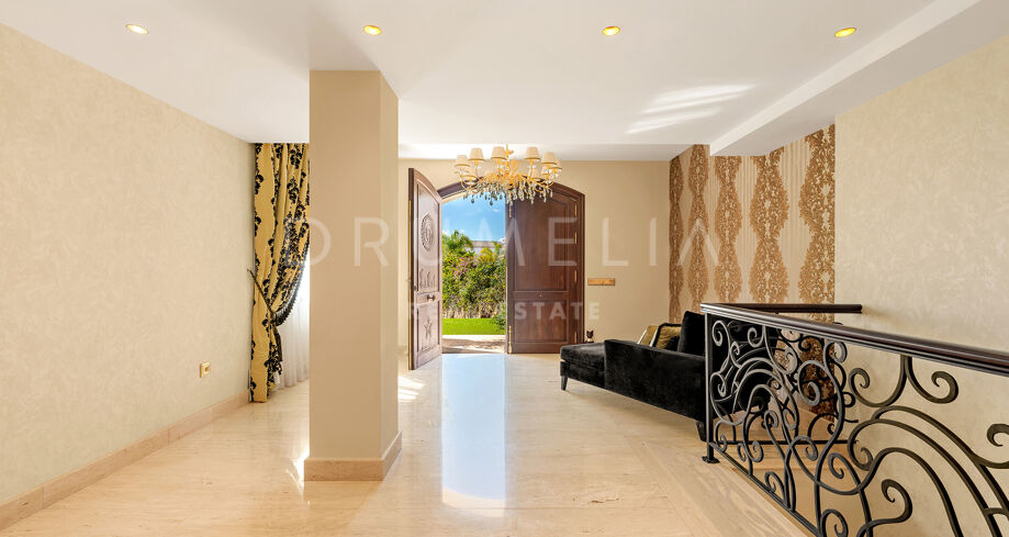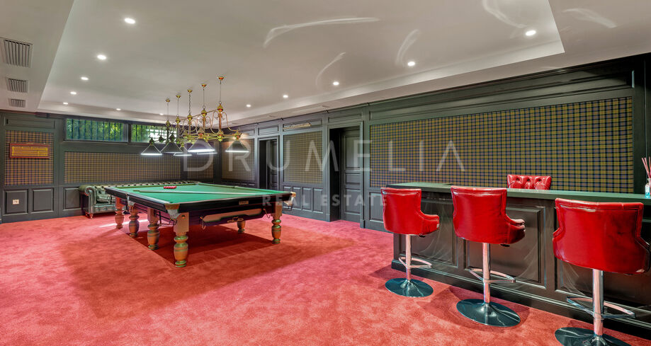 Fastigheten byggdes ursprungligen 1998 och renoverades omsorgsfullt 2015 och visar upp premiumfinish, inklusive polerade marmorgolv och ett fullt utrustat modernt kök. Den eleganta matsalen är perfekt för intima middagar, medan det rymliga vardagsrummet, med direkt tillgång till en privat terrass, inbjuder till avkoppling och sammankomster. Underhållningsentusiaster kommer att uppskatta biorummet och spelrummet, perfekt för filmkvällar eller sociala evenemang.