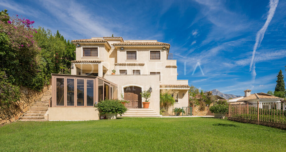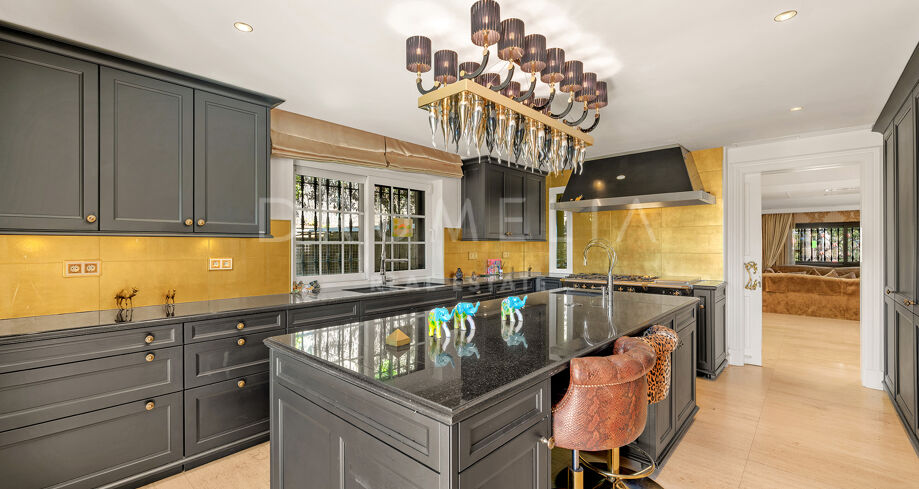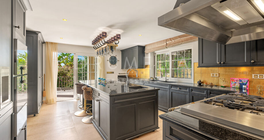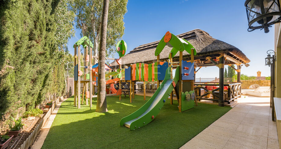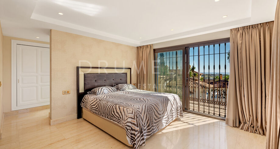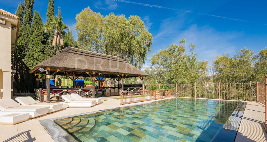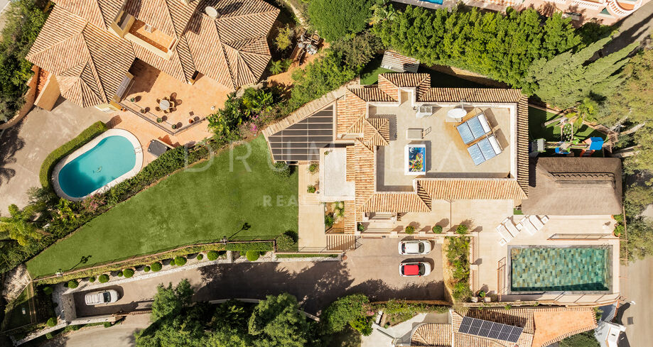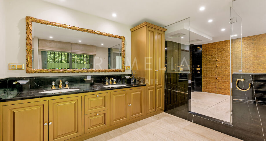Fastigheten byggdes ursprungligen 1998 och renoverades omsorgsfullt 2015 och visar upp premiumfinish, inklusive polerade marmorgolv och ett fullt utrustat modernt kök. Den eleganta matsalen är perfekt för intima middagar, medan det rymliga vardagsrummet, med direkt tillgång till en privat terrass, inbjuder till avkoppling och sammankomster. Underhållningsentusiaster kommer att uppskatta biorummet och spelrummet, perfekt för filmkvällar eller sociala evenemang.