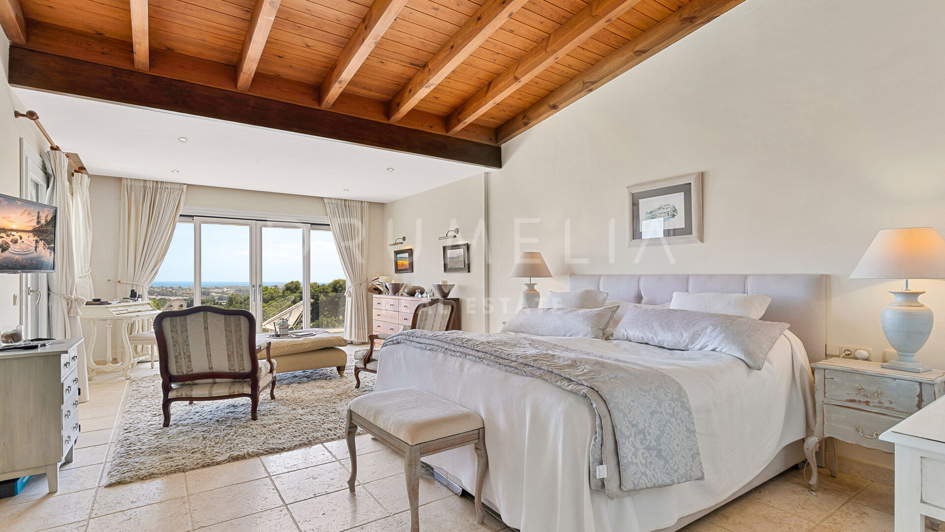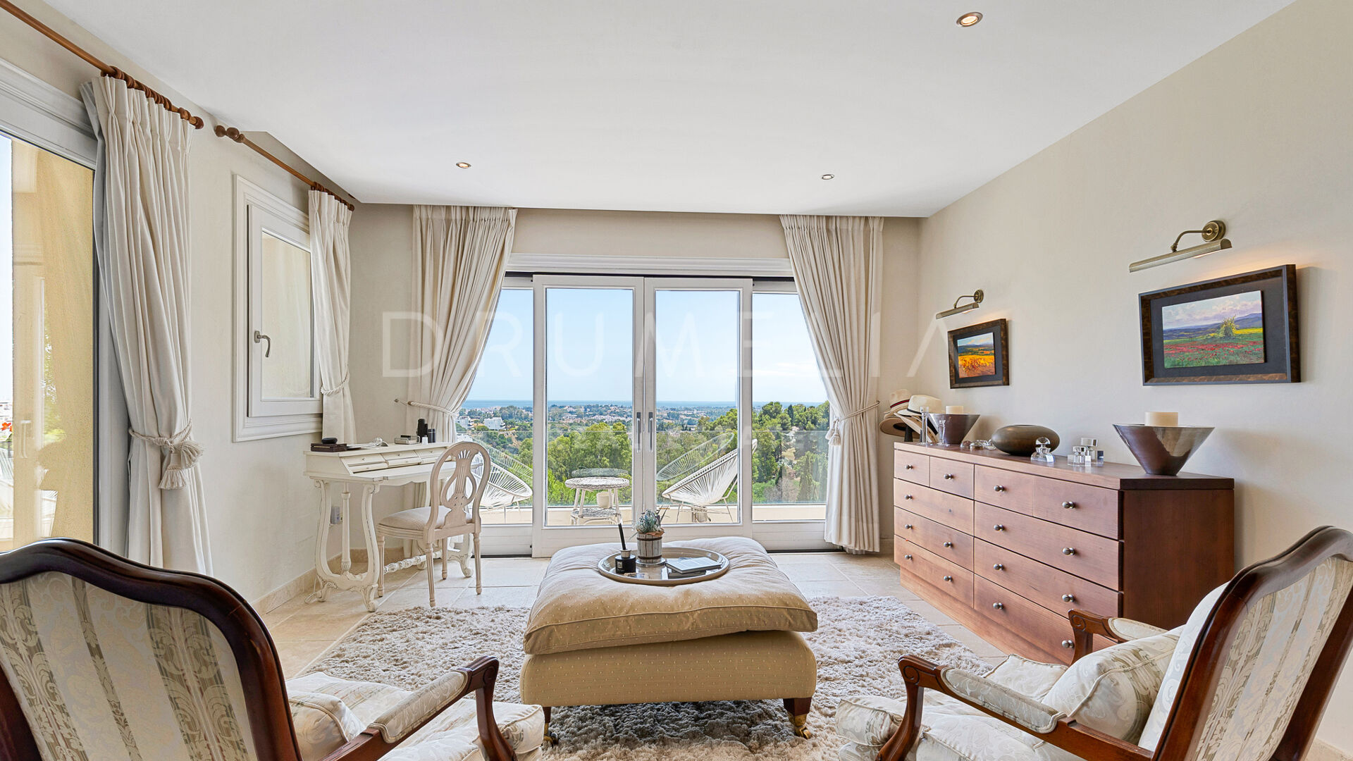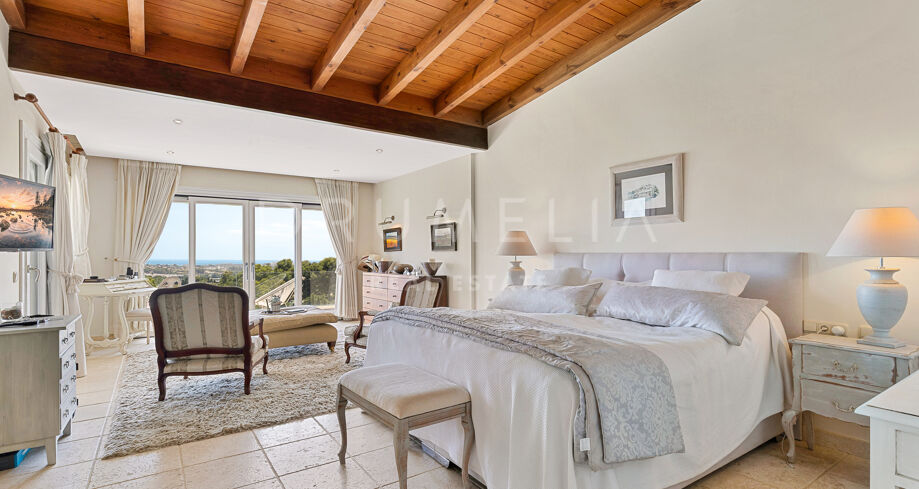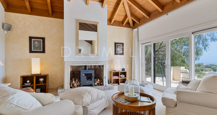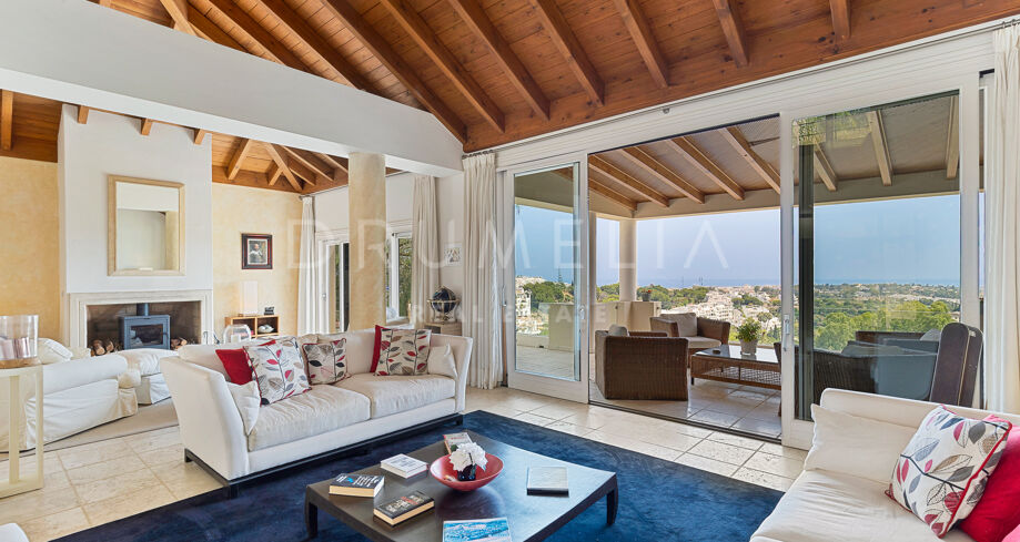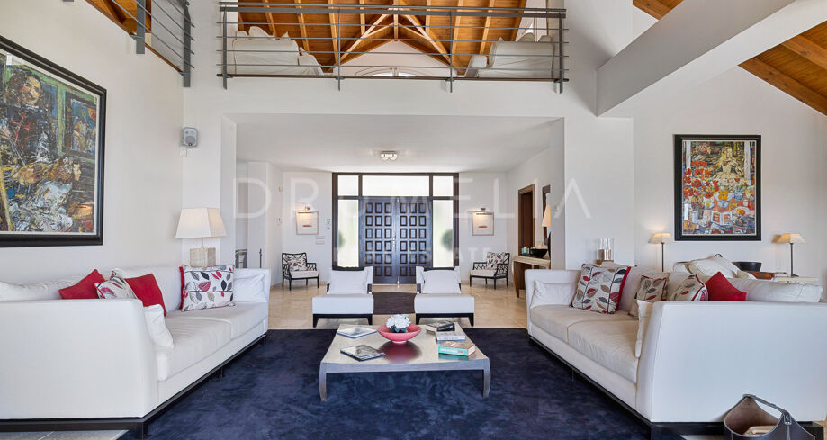 Redan vid entrén möts du av en dubbelhöjd hall som sätter tonen: generösa proportioner, varma material och en känsla av lugn. Vardagsrummet öppnar direkt ut mot en vidsträckt terrass där panoramautsikten över Medelhavskusten, Gibraltarklippan och bergen i norra Afrika breder ut sig från soluppgång till solnedgång. Golv-till-tak-fönster säkerställer att utsikten alltid är närvarande.