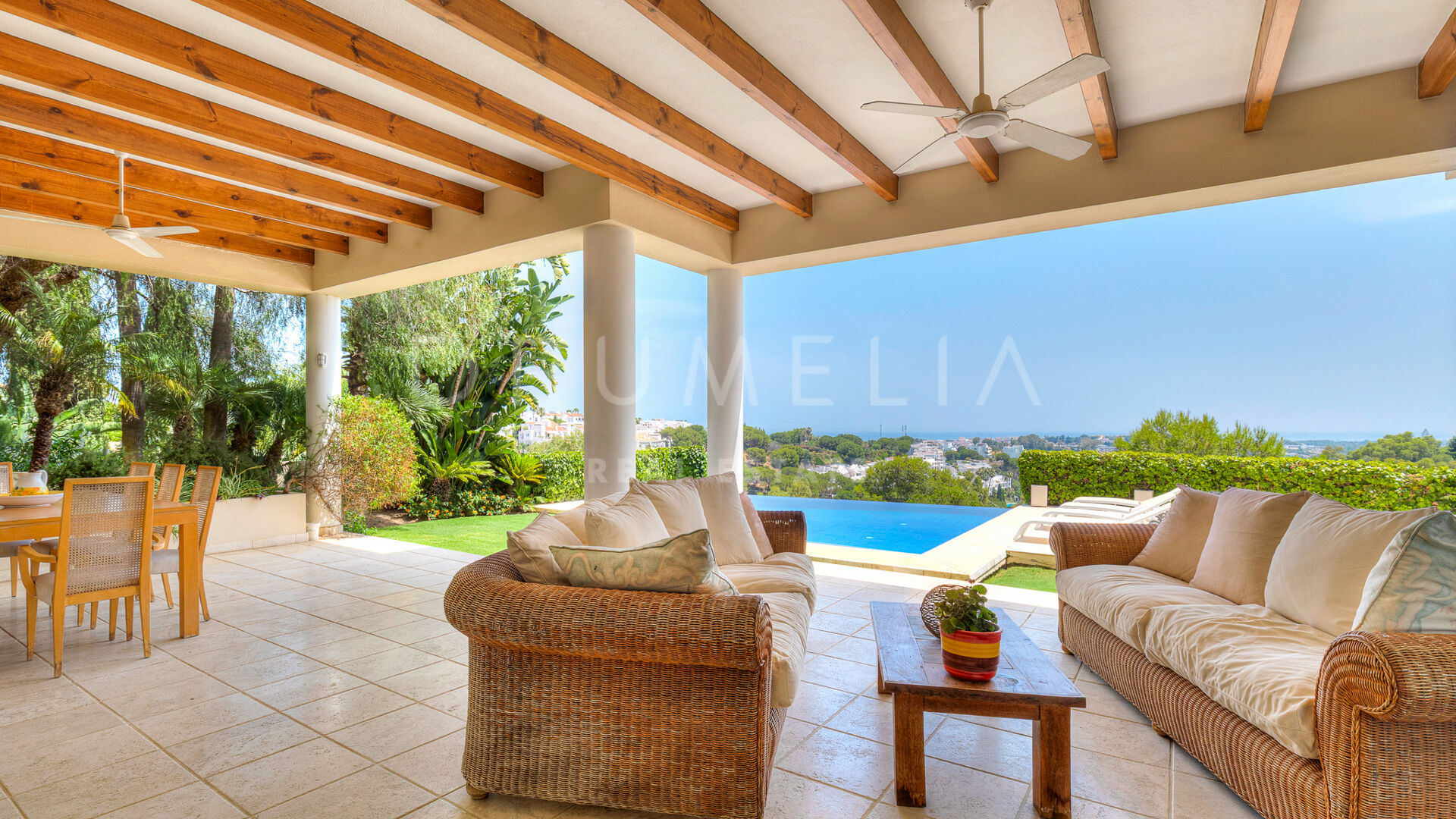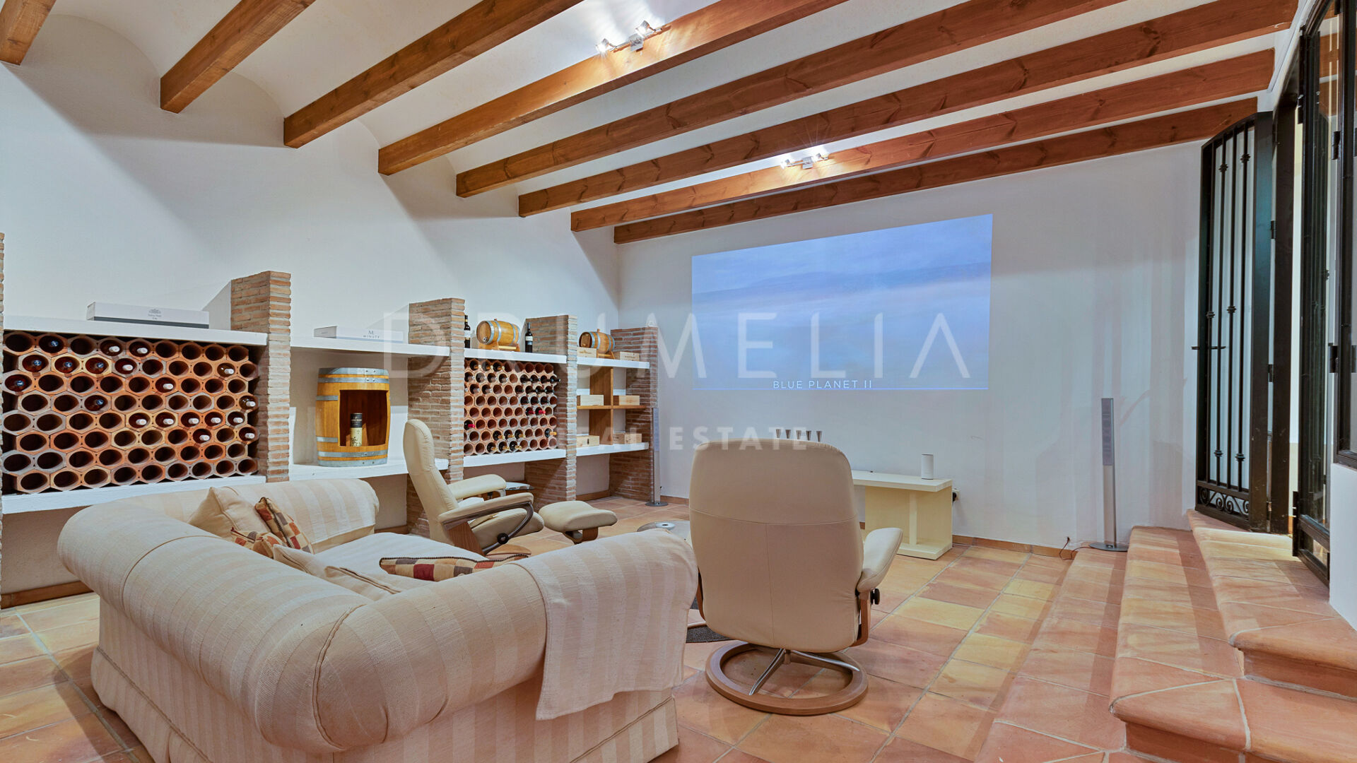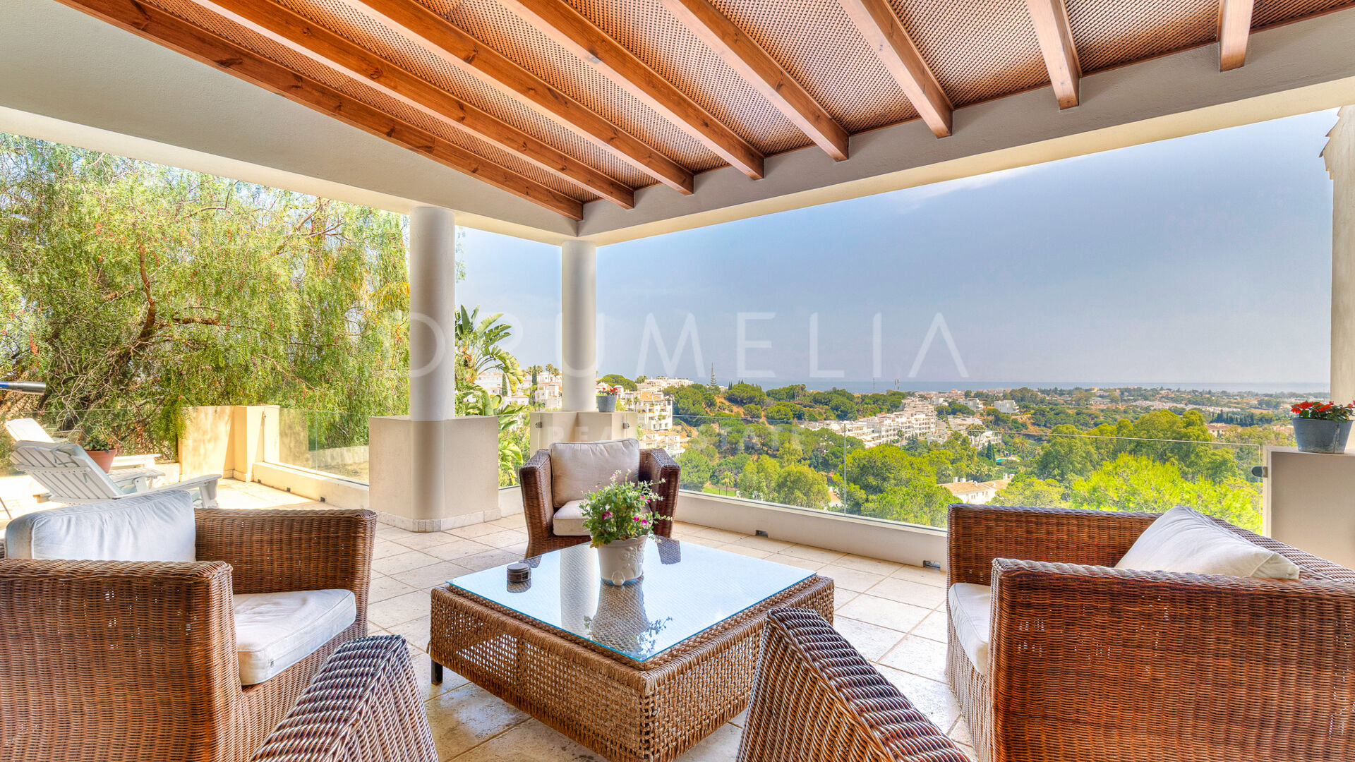 Redan vid entrén möts du av en dubbelhöjd hall som sätter tonen: generösa proportioner, varma material och en känsla av lugn. Vardagsrummet öppnar direkt ut mot en vidsträckt terrass där panoramautsikten över Medelhavskusten, Gibraltarklippan och bergen i norra Afrika breder ut sig från soluppgång till solnedgång. Golv-till-tak-fönster säkerställer att utsikten alltid är närvarande.