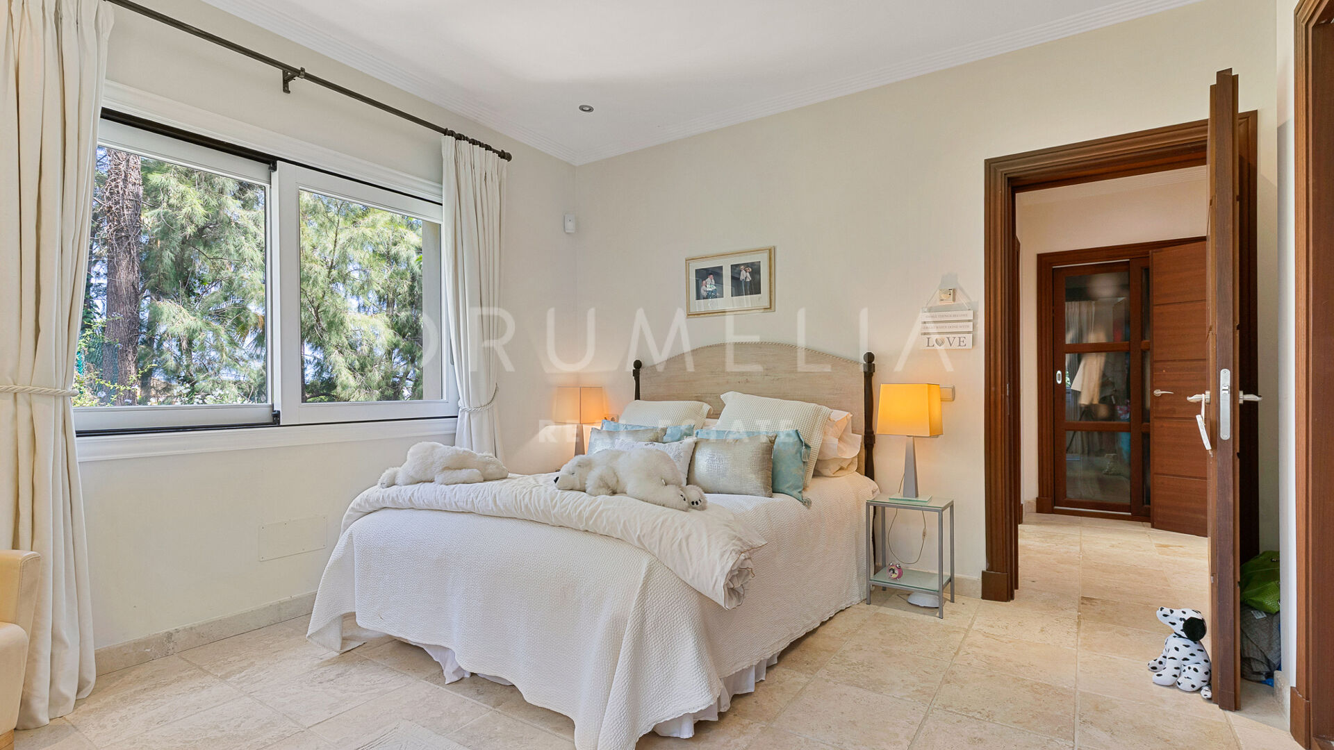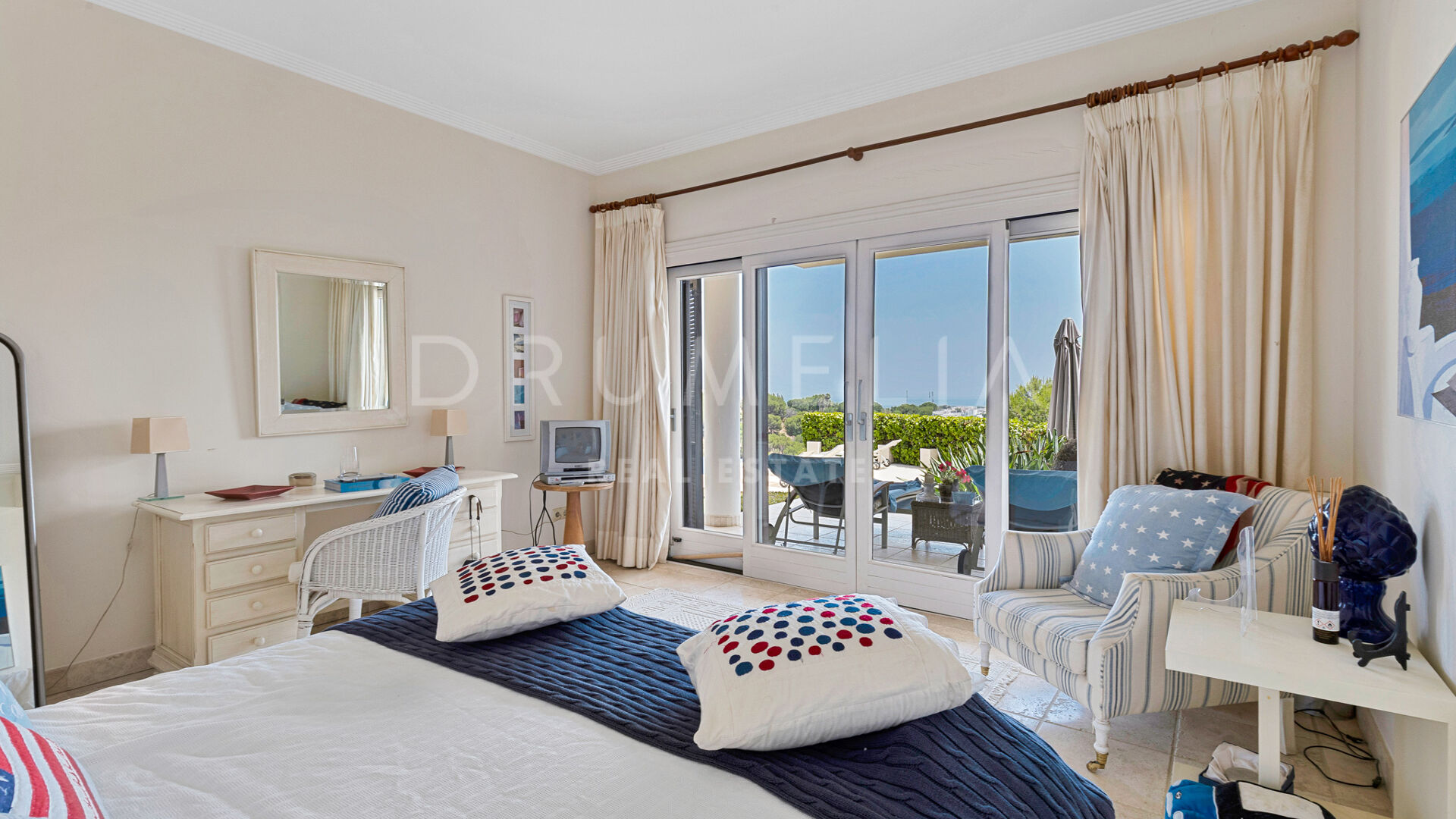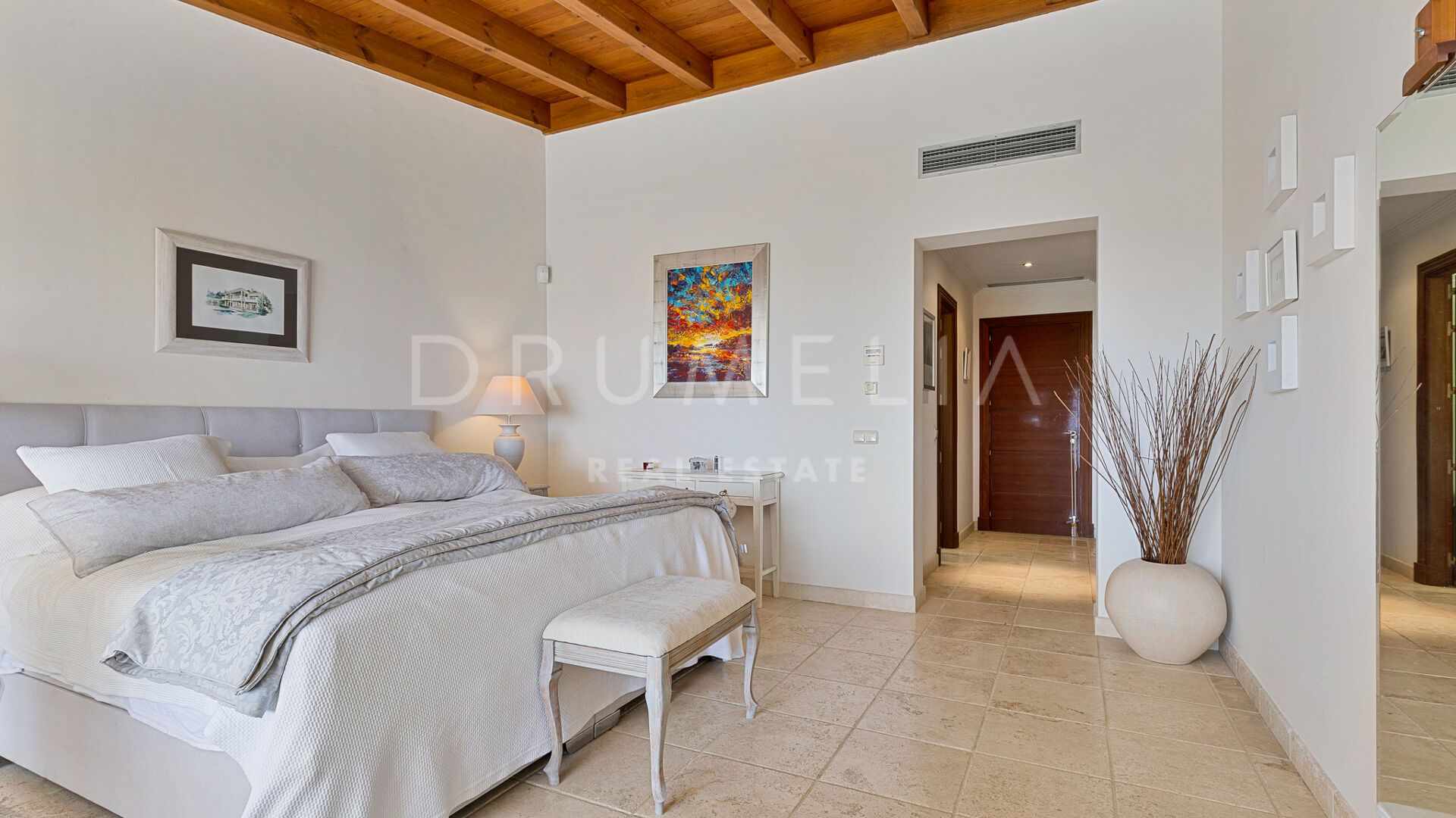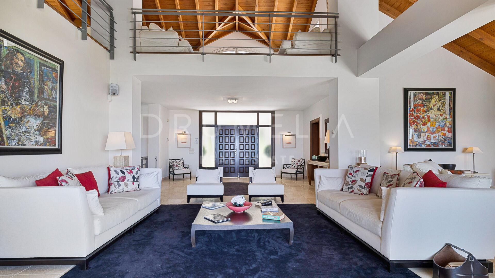 Redan vid entrén möts du av en dubbelhöjd hall som sätter tonen: generösa proportioner, varma material och en känsla av lugn. Vardagsrummet öppnar direkt ut mot en vidsträckt terrass där panoramautsikten över Medelhavskusten, Gibraltarklippan och bergen i norra Afrika breder ut sig från soluppgång till solnedgång. Golv-till-tak-fönster säkerställer att utsikten alltid är närvarande.
