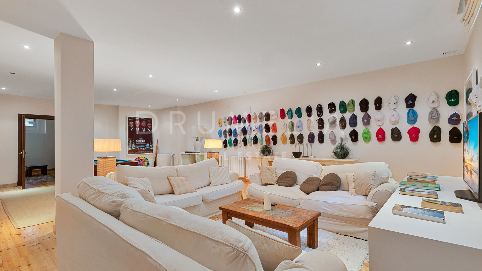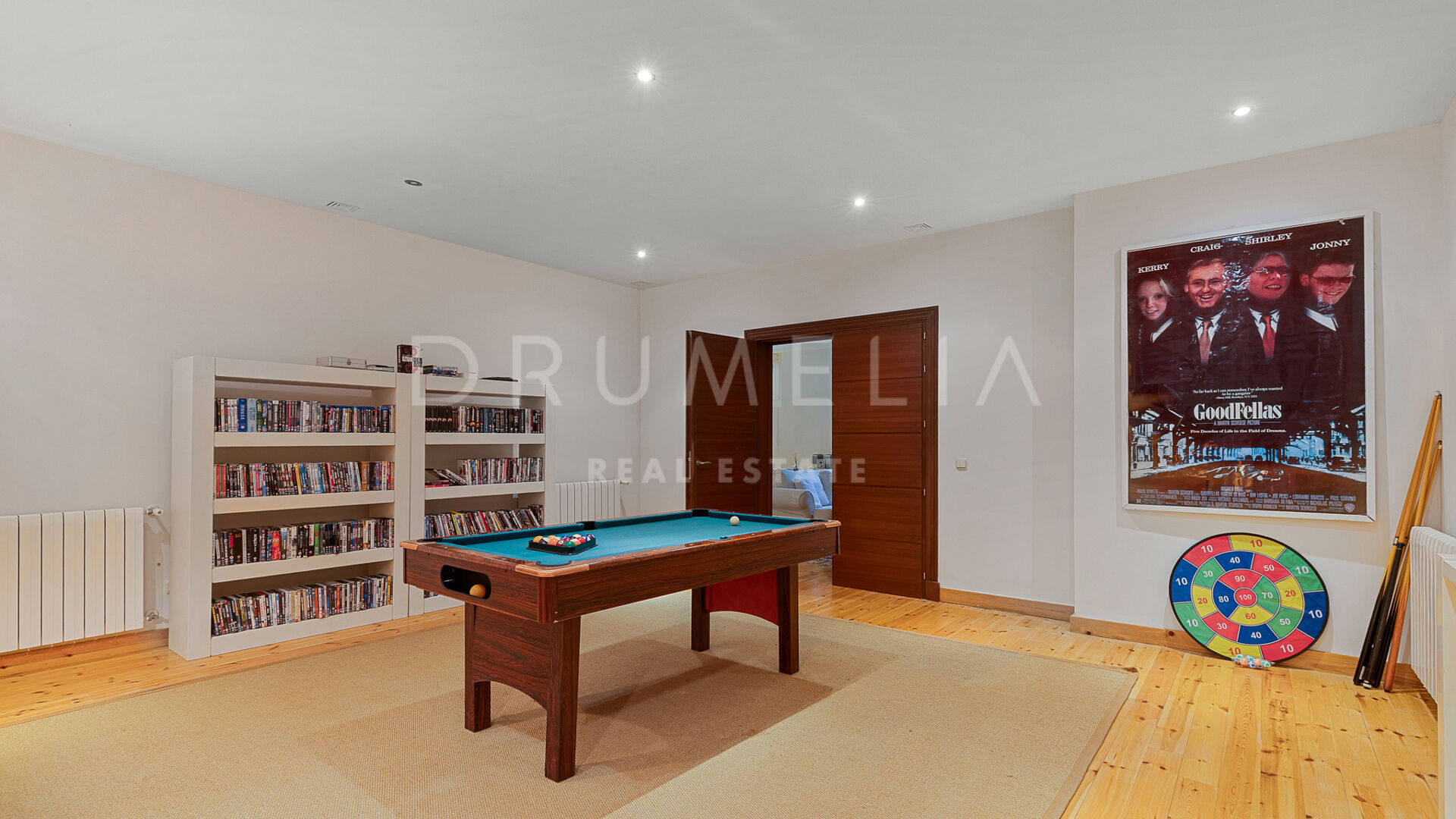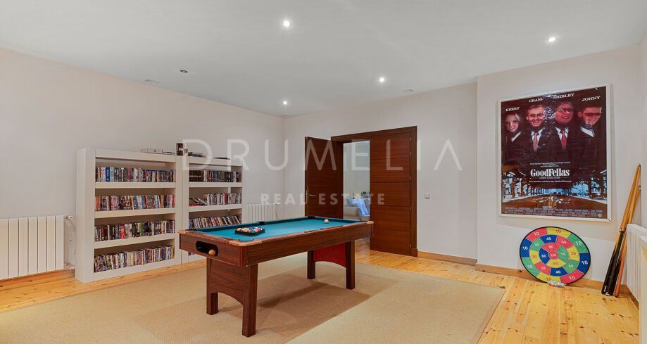 Hemmet är utformat för ett bekvämt liv. På huvudsakliga våningsplanet finns master-sviten och ytterligare ett sovrum med eget badrum, båda med direkt tillgång till terrassen. En trappa ner finns ett öppet kök utrustat med Miele-vitvaror som leder till en mat- och loungedel med naturligt flöde ut mot den sydvända infinitypoolen och den privata trädgården – perfekt för både familjeliv och sociala tillställningar. På den nedre våningen finns även vinkällare, biosalong, spelrum och ytterligare en gästsvit, vilket gör denna fastighet lika funktionell som vacker.