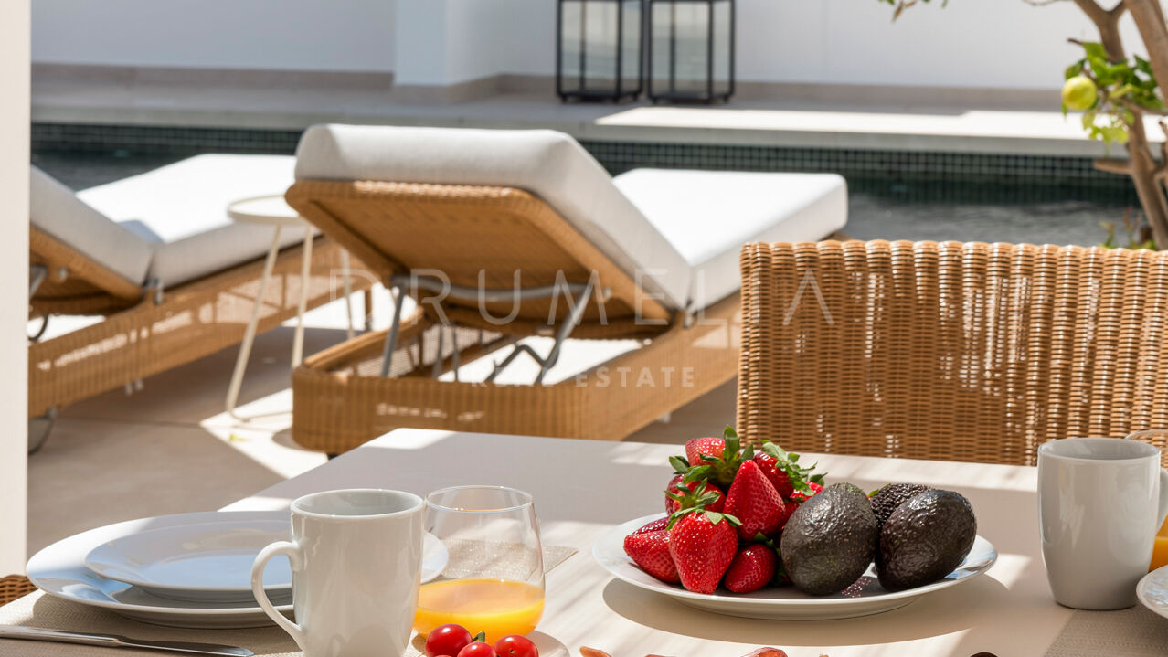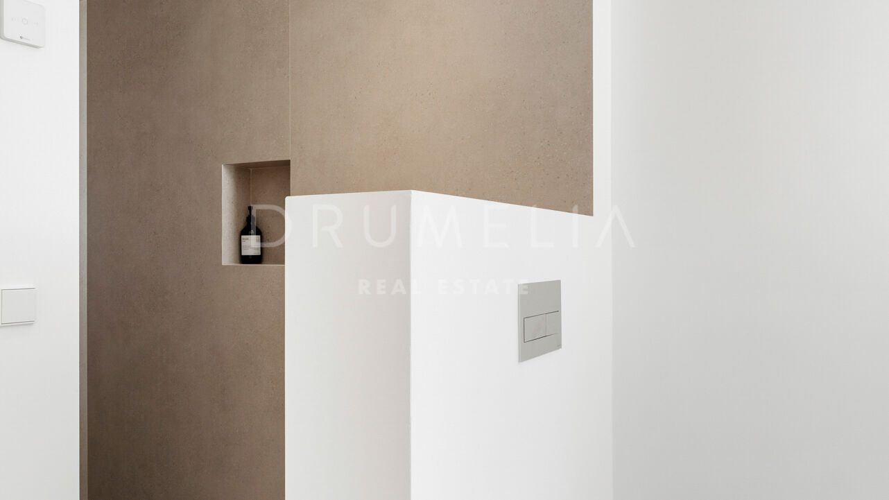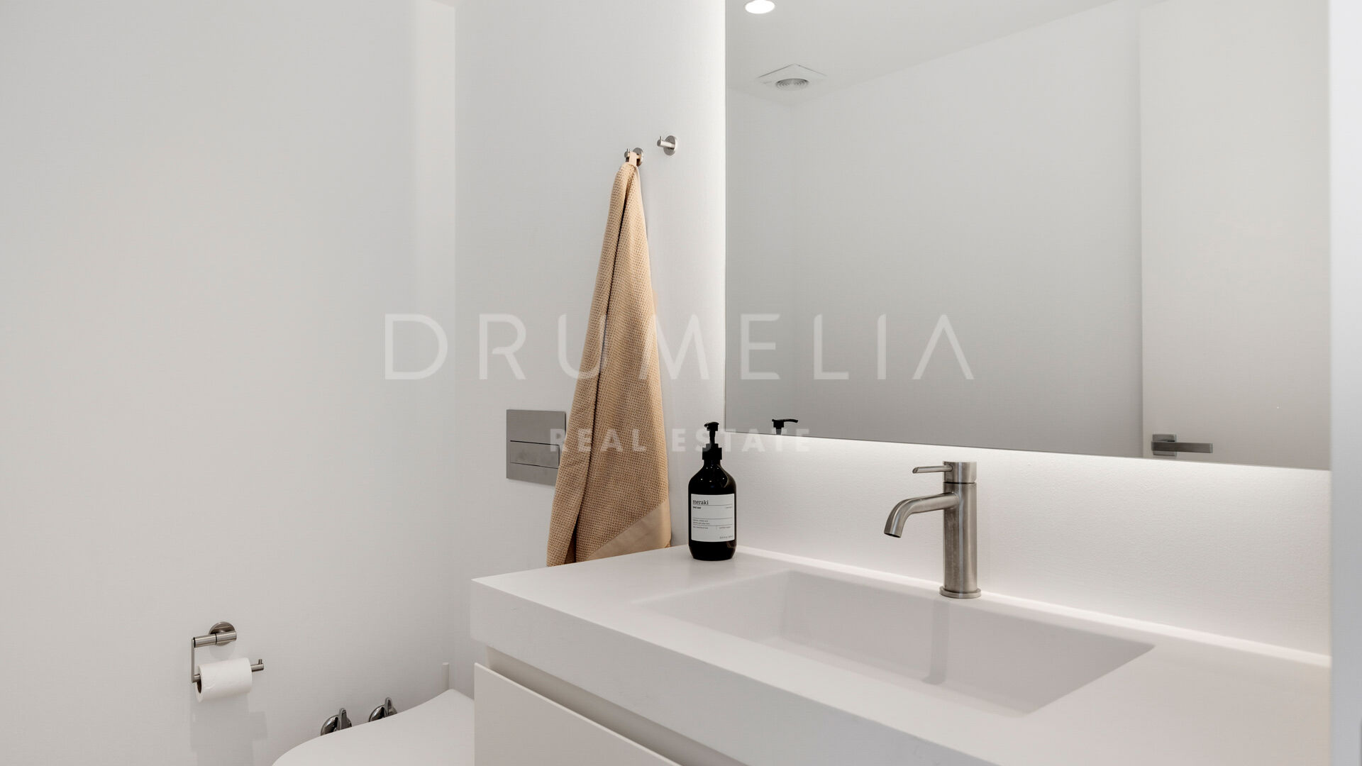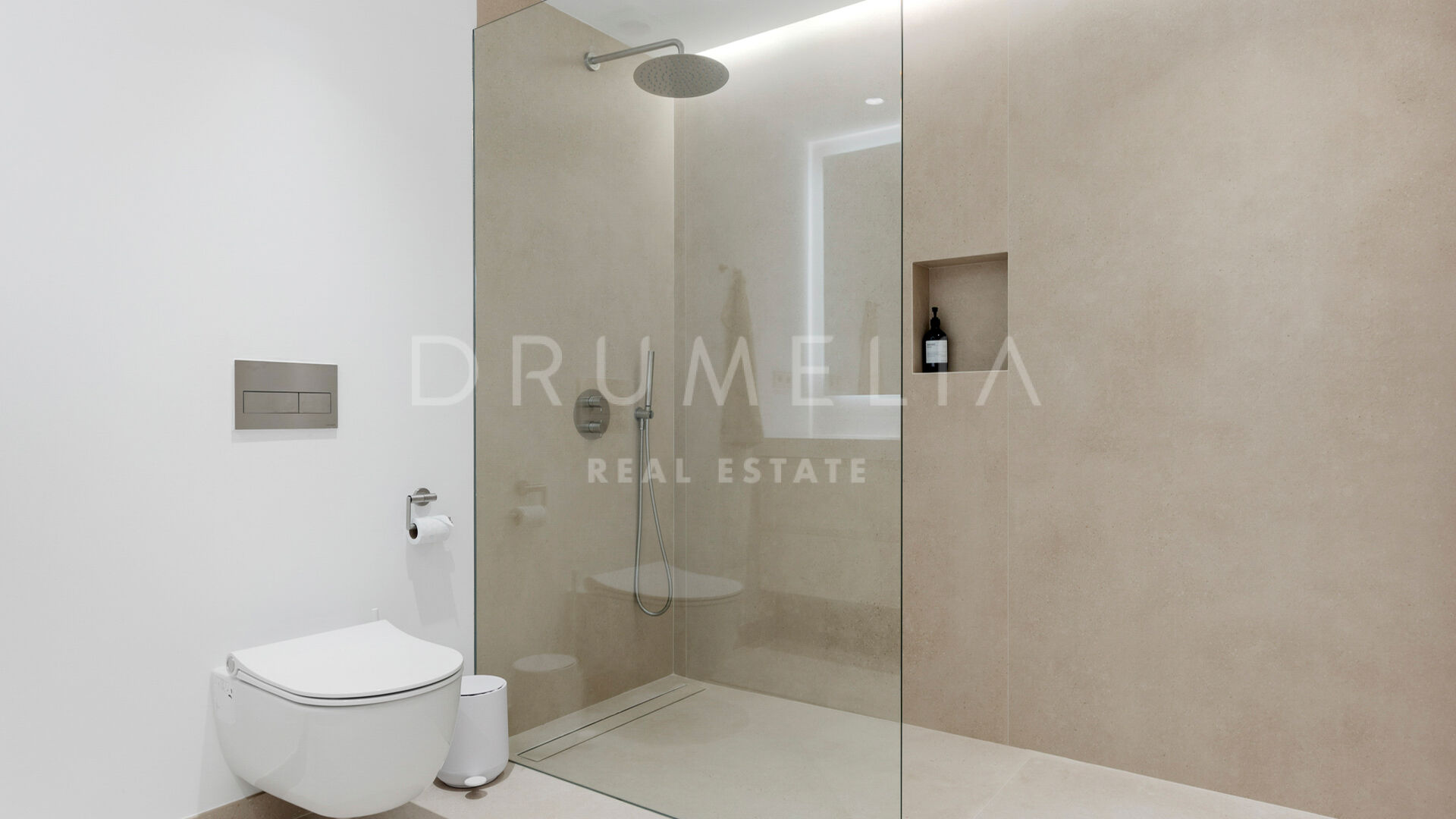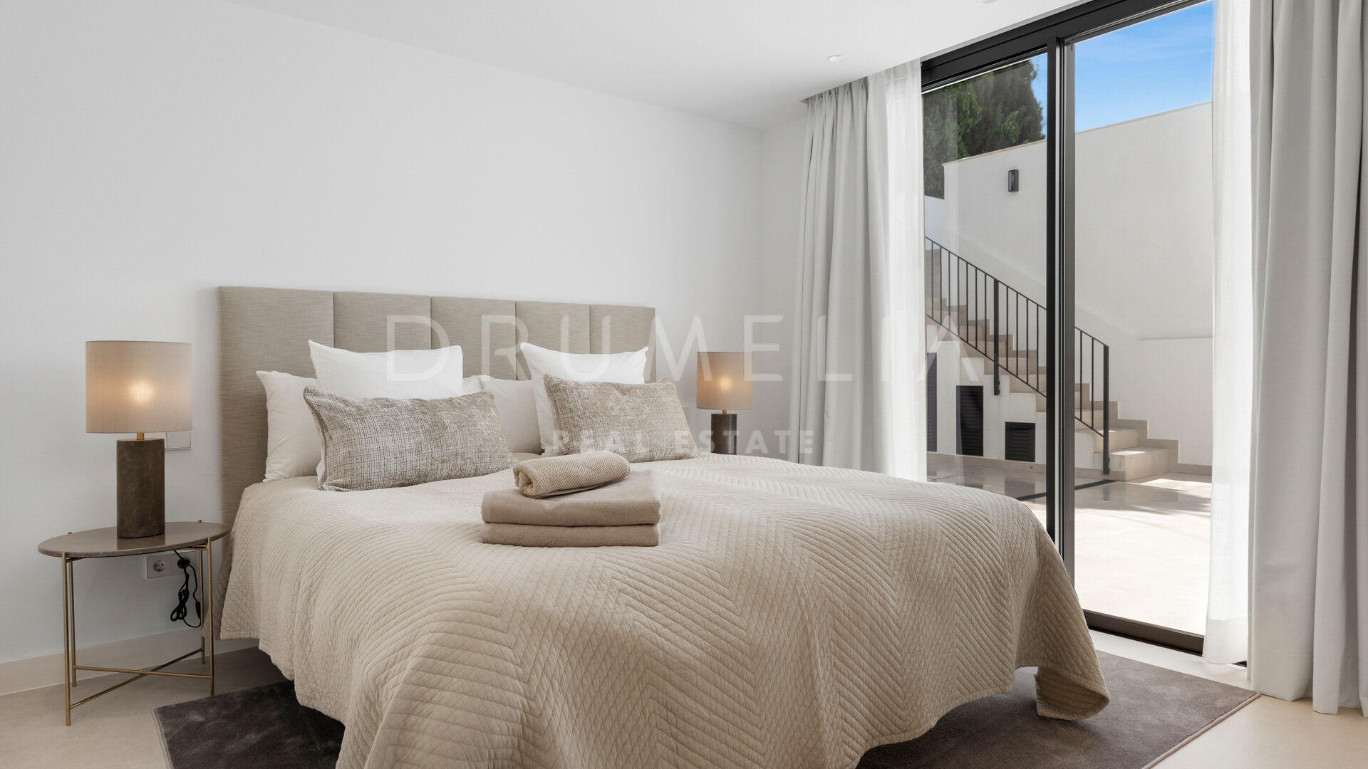 Villan ligger på en rymlig tomt och har ett utomhusområde som är utformat för både underhållning och avkoppling, med en lyxig jacuzzi, en regndusch och en uteservering komplett med en utrustad grill. Den moderna landskapsarkitekturen kompletterar den eleganta arkitektoniska designen, medan expansiva terrasser erbjuder fantastisk utsikt över Medelhavet. Inuti sträcker sig villan över 482 m² och inkluderar vardagsrum och matsalar i öppen planlösning, ett modernt fullt utrustat kök och fem generösa sovrum med eget badrum, alla utformade för att maximera ljus och komfort.