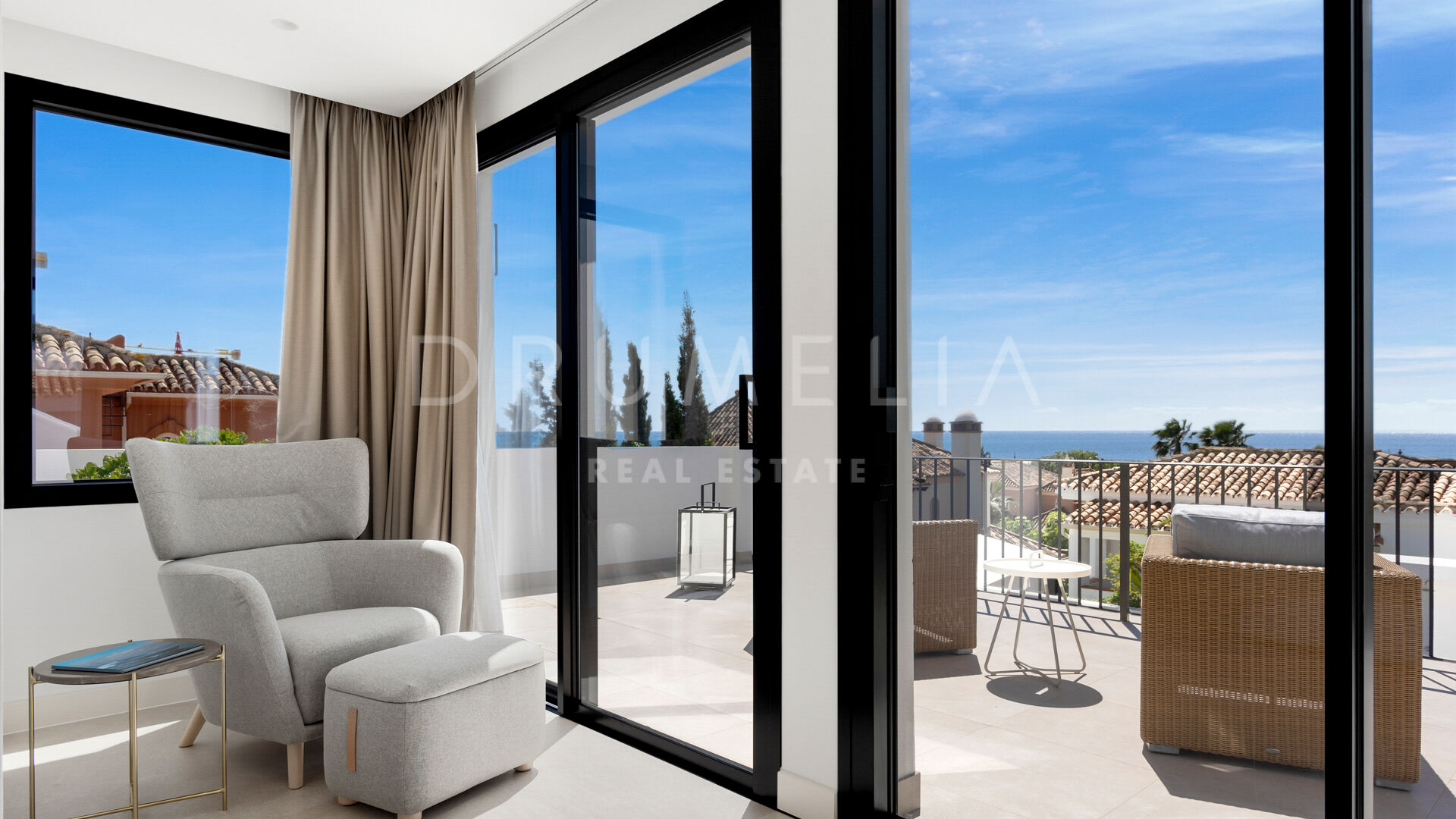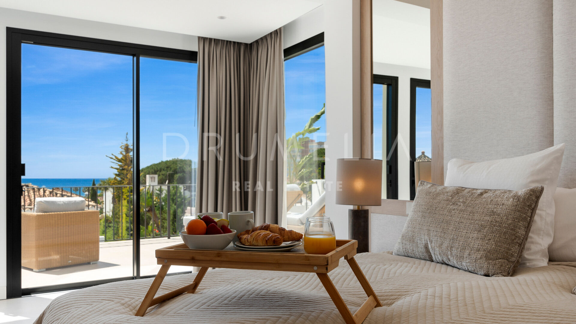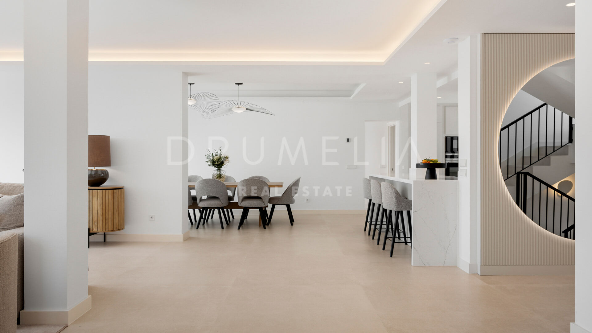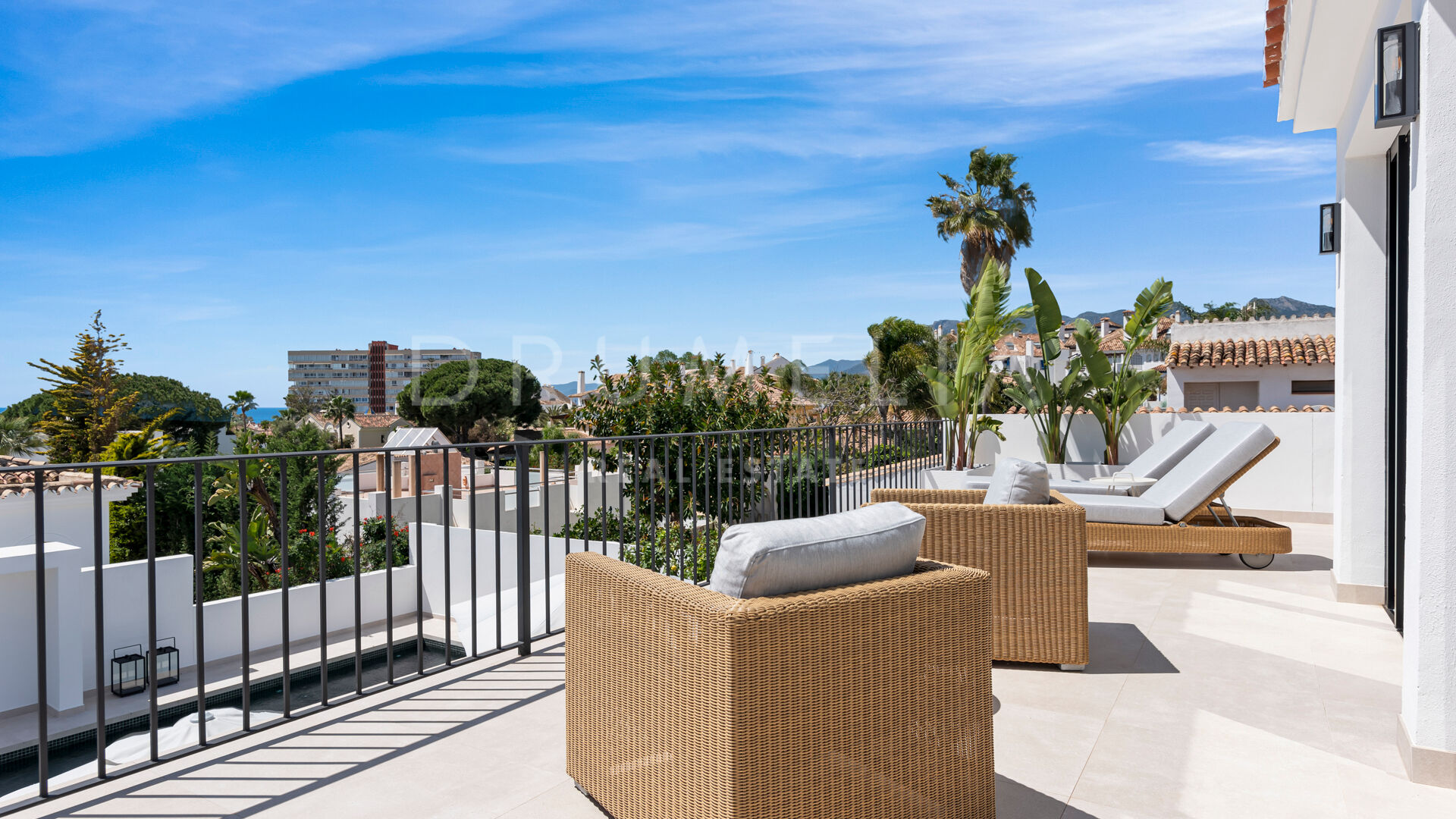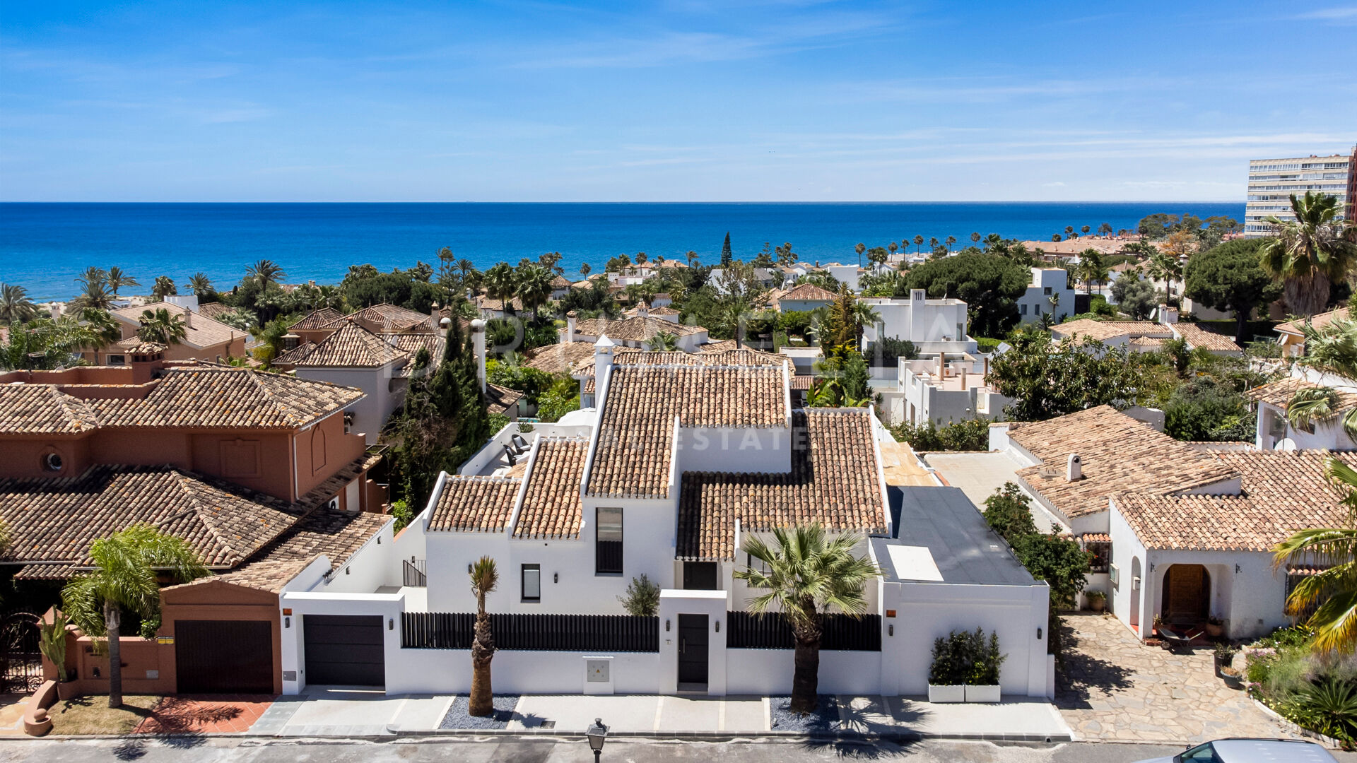 Denna helrenoverade lyxvilla med 5 sovrum ligger i det prestigefyllda Las Chapas Playa, Marbella East, bara några steg från Marbellas finaste sandstränder. Denna exceptionella fastighet kombinerar modern design med kustens lugn och erbjuder en lugn tillflyktsort omgiven av exklusiva bekvämligheter, inklusive berömda strandklubbar som NOSSO och Bono Beach, topprankade restauranger och viktiga bekvämligheter som stormarknader och apotek. Dess utmärkta läge garanterar också enkel tillgång till Marbellas centrum, Puerto Banús och natursköna kustvägar, vilket gör det till det perfekta hemmet för både avkoppling och utforskning.