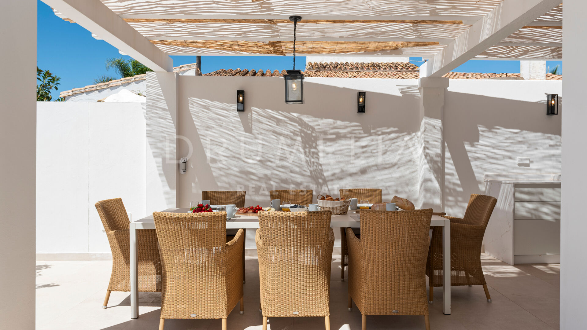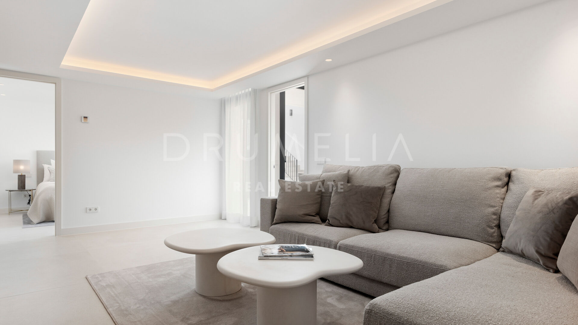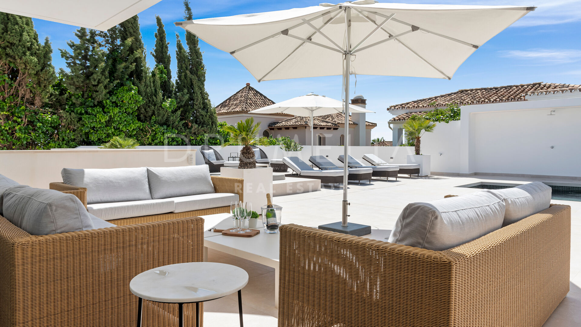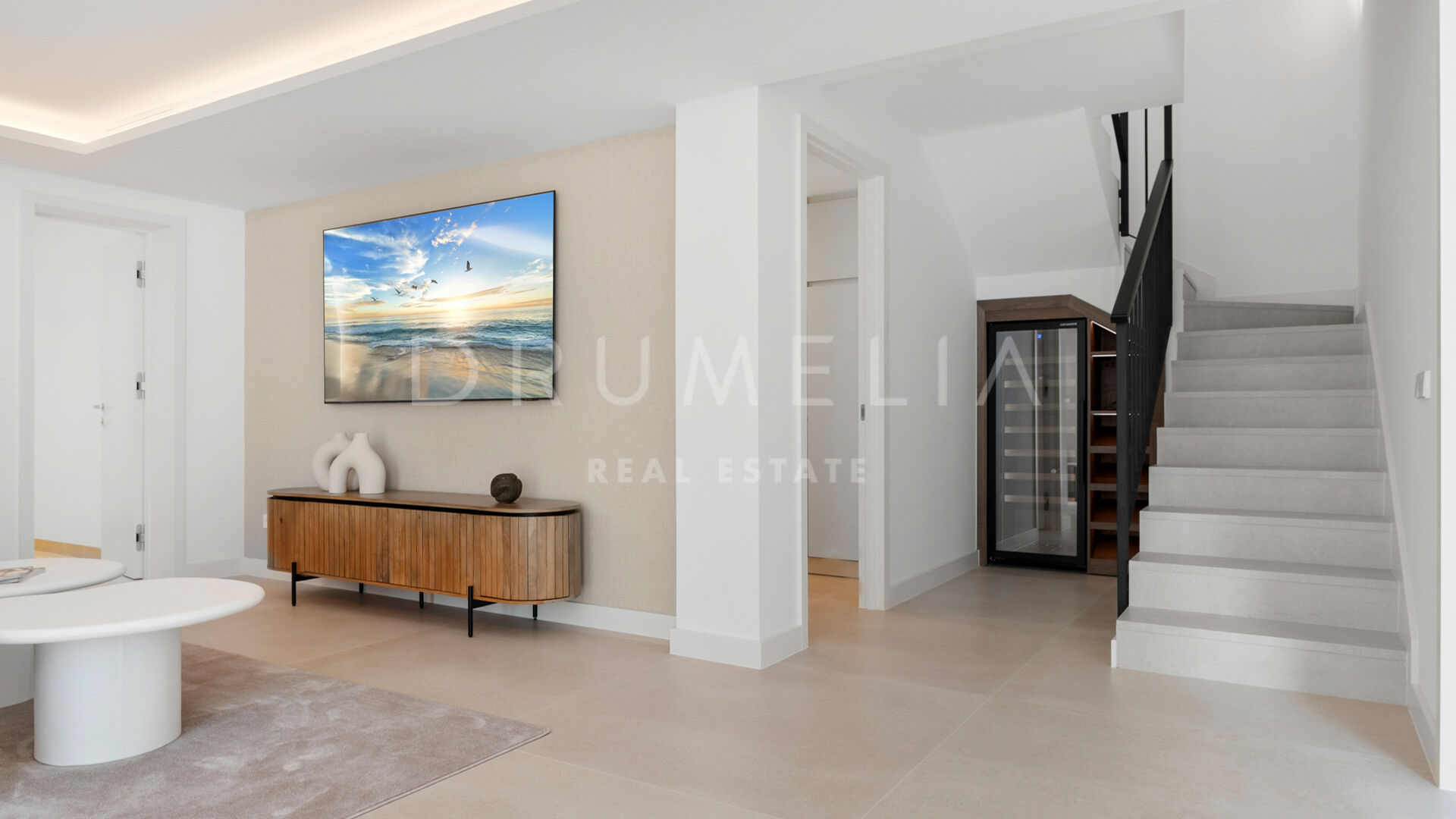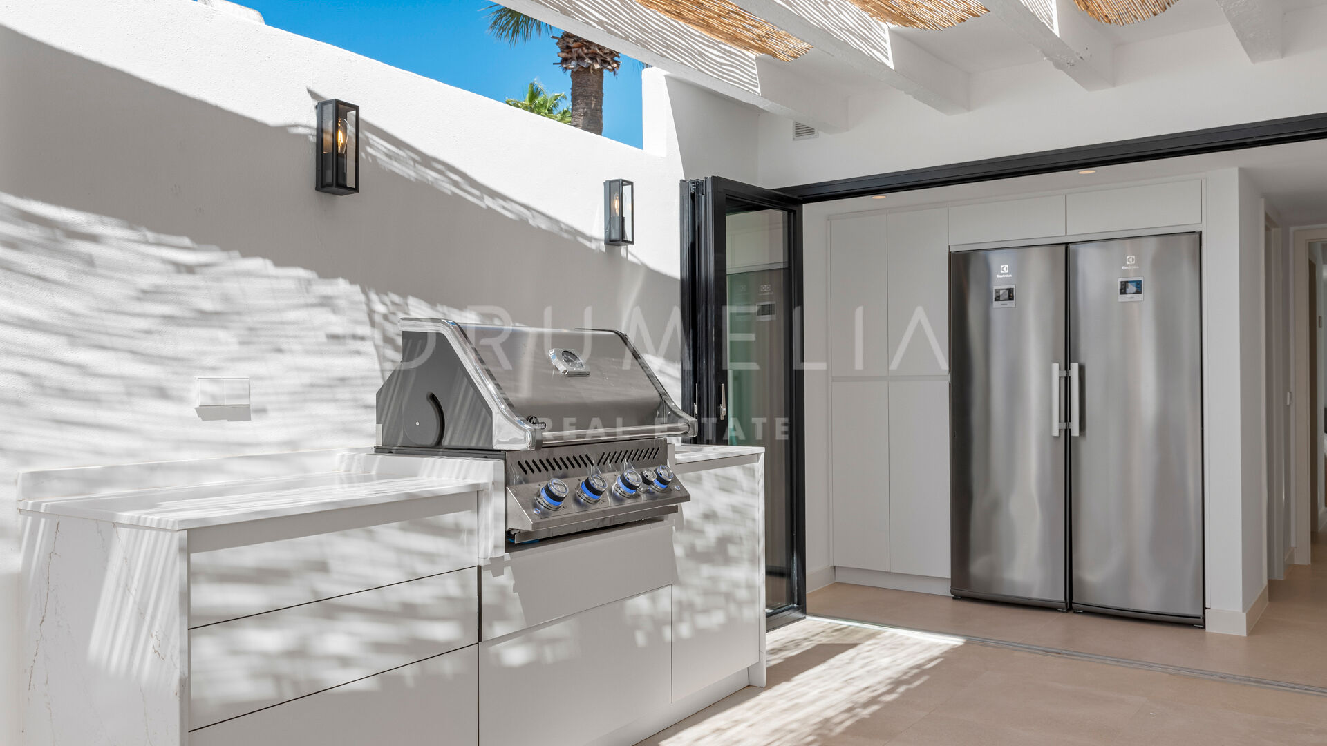 Denna helrenoverade lyxvilla med 5 sovrum ligger i det prestigefyllda Las Chapas Playa, Marbella East, bara några steg från Marbellas finaste sandstränder. Denna exceptionella fastighet kombinerar modern design med kustens lugn och erbjuder en lugn tillflyktsort omgiven av exklusiva bekvämligheter, inklusive berömda strandklubbar som NOSSO och Bono Beach, topprankade restauranger och viktiga bekvämligheter som stormarknader och apotek. Dess utmärkta läge garanterar också enkel tillgång till Marbellas centrum, Puerto Banús och natursköna kustvägar, vilket gör det till det perfekta hemmet för både avkoppling och utforskning.