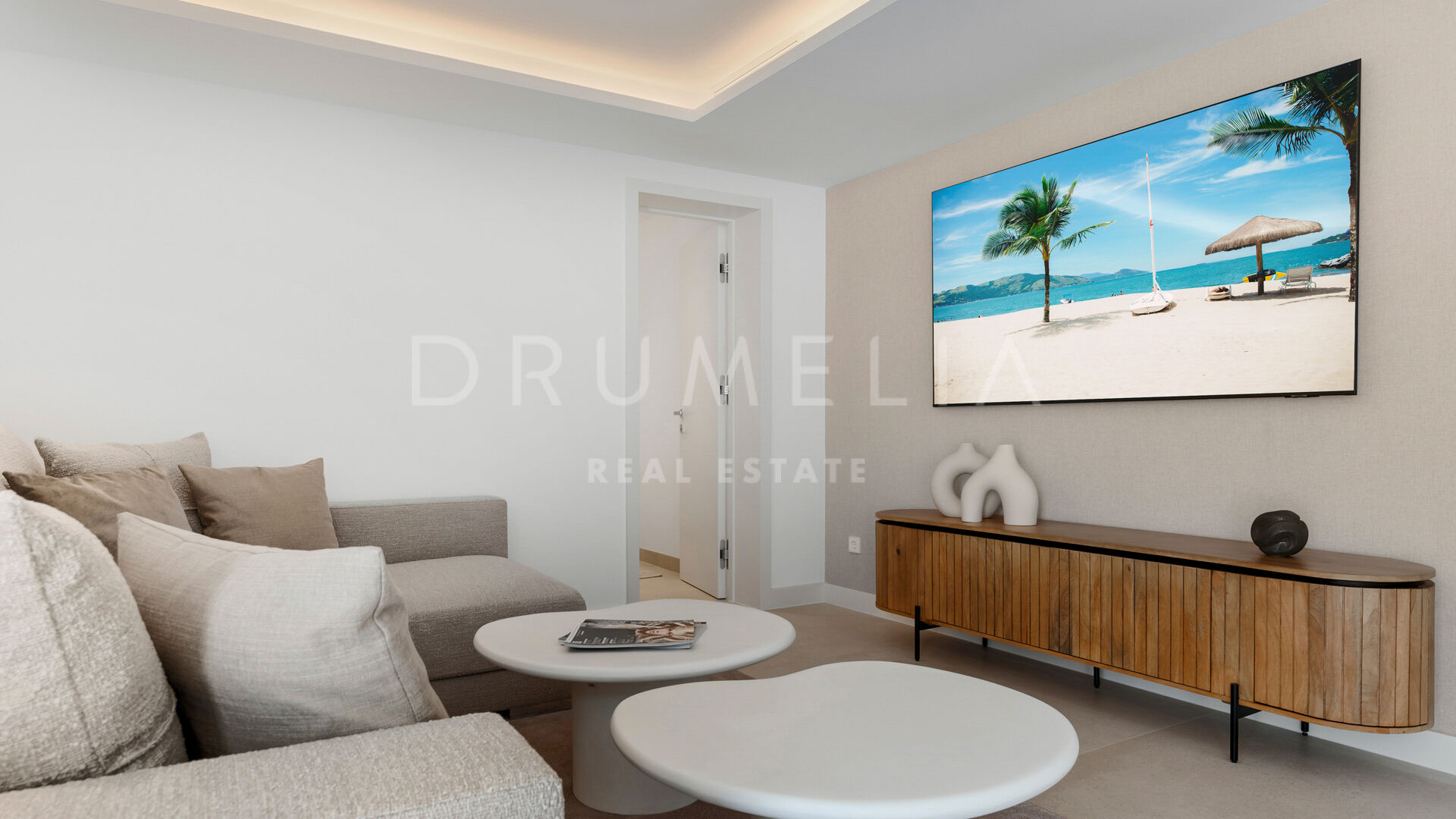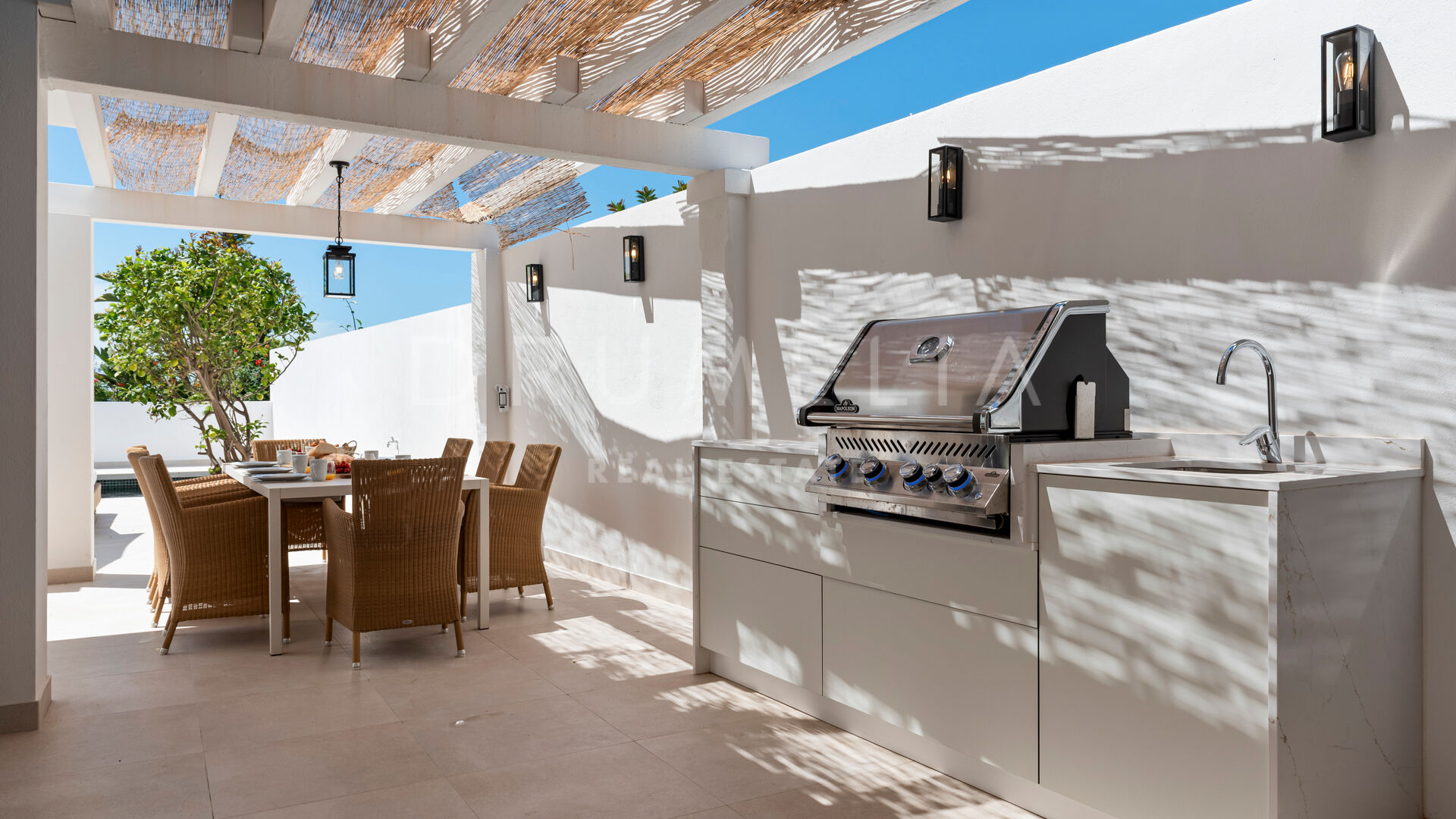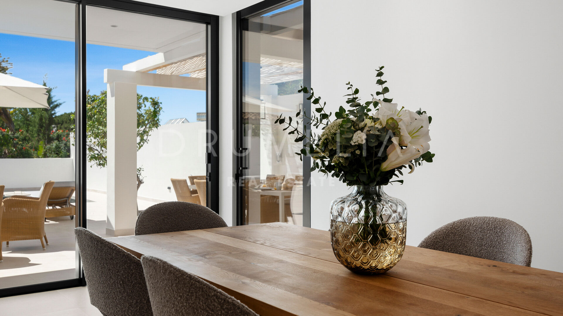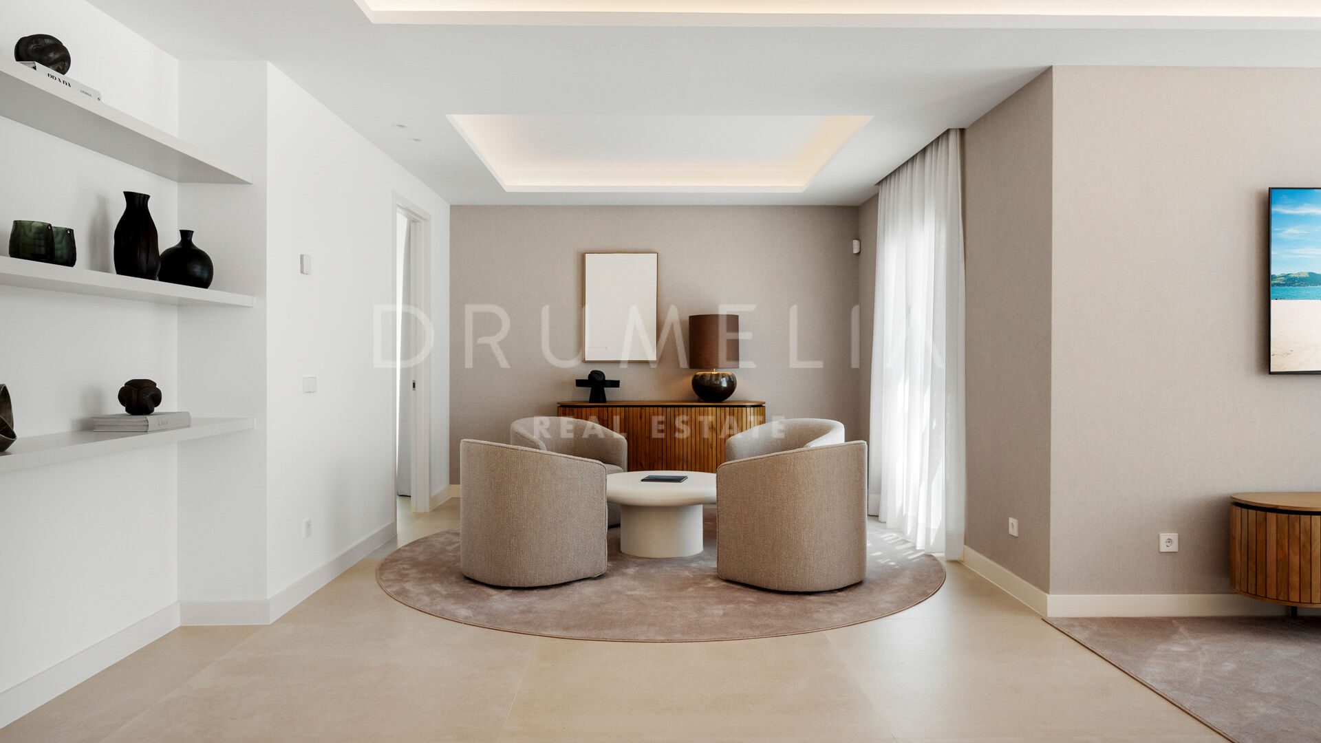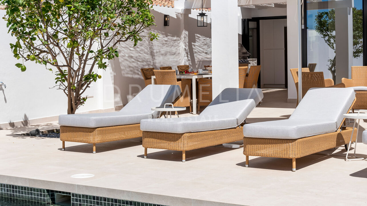 Denna helrenoverade lyxvilla med 5 sovrum ligger i det prestigefyllda Las Chapas Playa, Marbella East, bara några steg från Marbellas finaste sandstränder. Denna exceptionella fastighet kombinerar modern design med kustens lugn och erbjuder en lugn tillflyktsort omgiven av exklusiva bekvämligheter, inklusive berömda strandklubbar som NOSSO och Bono Beach, topprankade restauranger och viktiga bekvämligheter som stormarknader och apotek. Dess utmärkta läge garanterar också enkel tillgång till Marbellas centrum, Puerto Banús och natursköna kustvägar, vilket gör det till det perfekta hemmet för både avkoppling och utforskning.