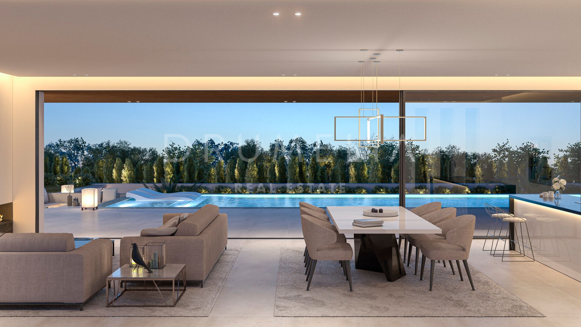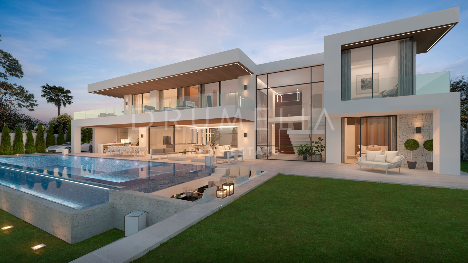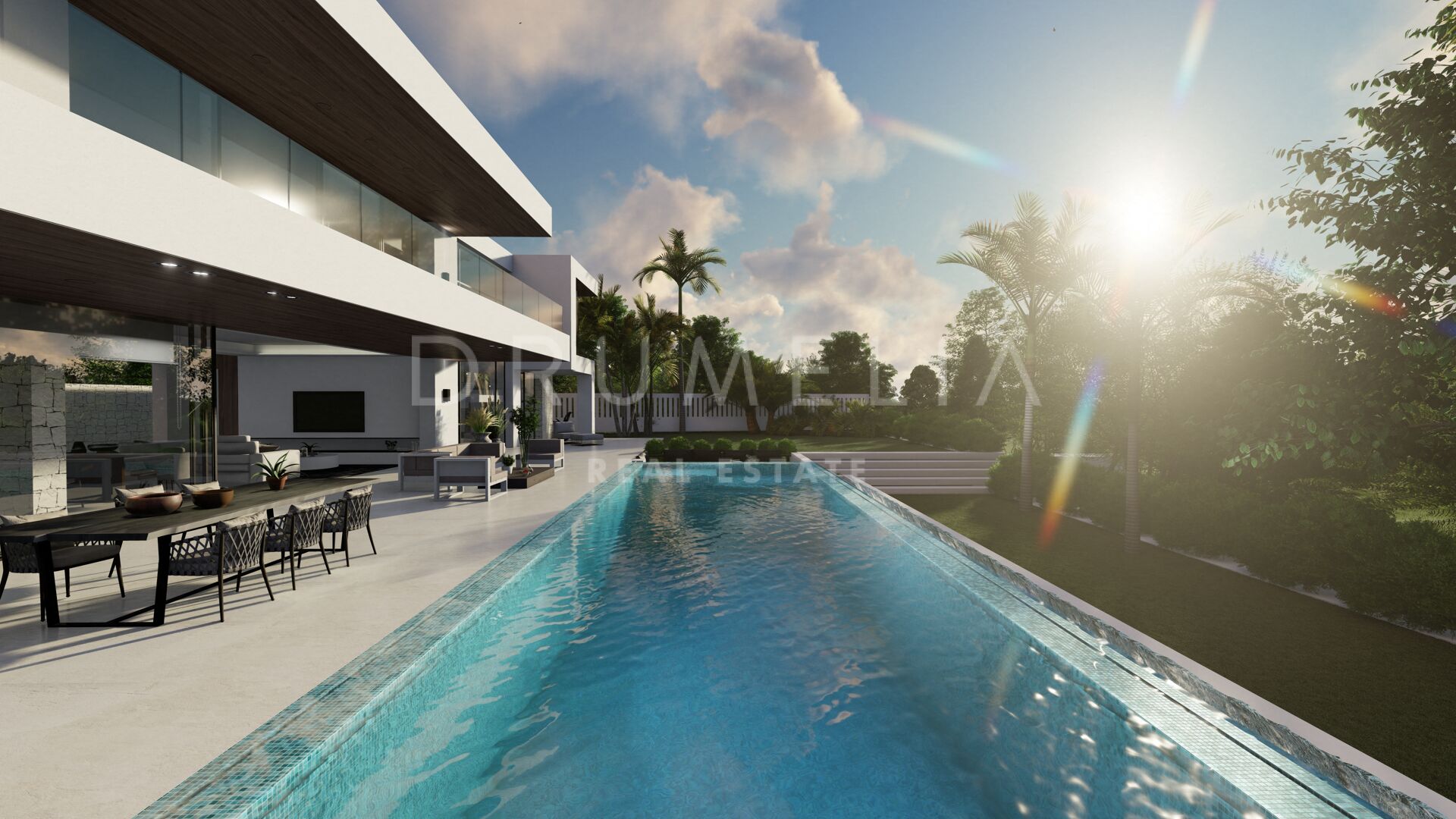 Belägen på en tomt på 1 016 m² har det sydvästvända huset på 460 m² utformats enligt expansiva standarder för ultimat lyx och modern estetik, och byggs enligt de högsta specifikationerna och ytbehandlingarna. Spännande miljövänlig arkitektur med utsökta funktioner kommer att smälta perfekt in i den naturliga skönheten i den fascinerande omgivningen. Du kommer att njuta av dess öppna vardagsrum med eleganta linjer och begränsad palett baserad på neutrala lugnande nyanser, vacker exteriör med en imponerande infinitypool, flera hörn och områden för att koppla av och sola, ett utekök och terrasser. Enorma panoramafönster, glasväggar och glasdörrar gör det möjligt att översvämma utrymmena med naturligt ljus, förena interiör och exteriör och bjuda in till att njuta av vackra fridfulla vyer.