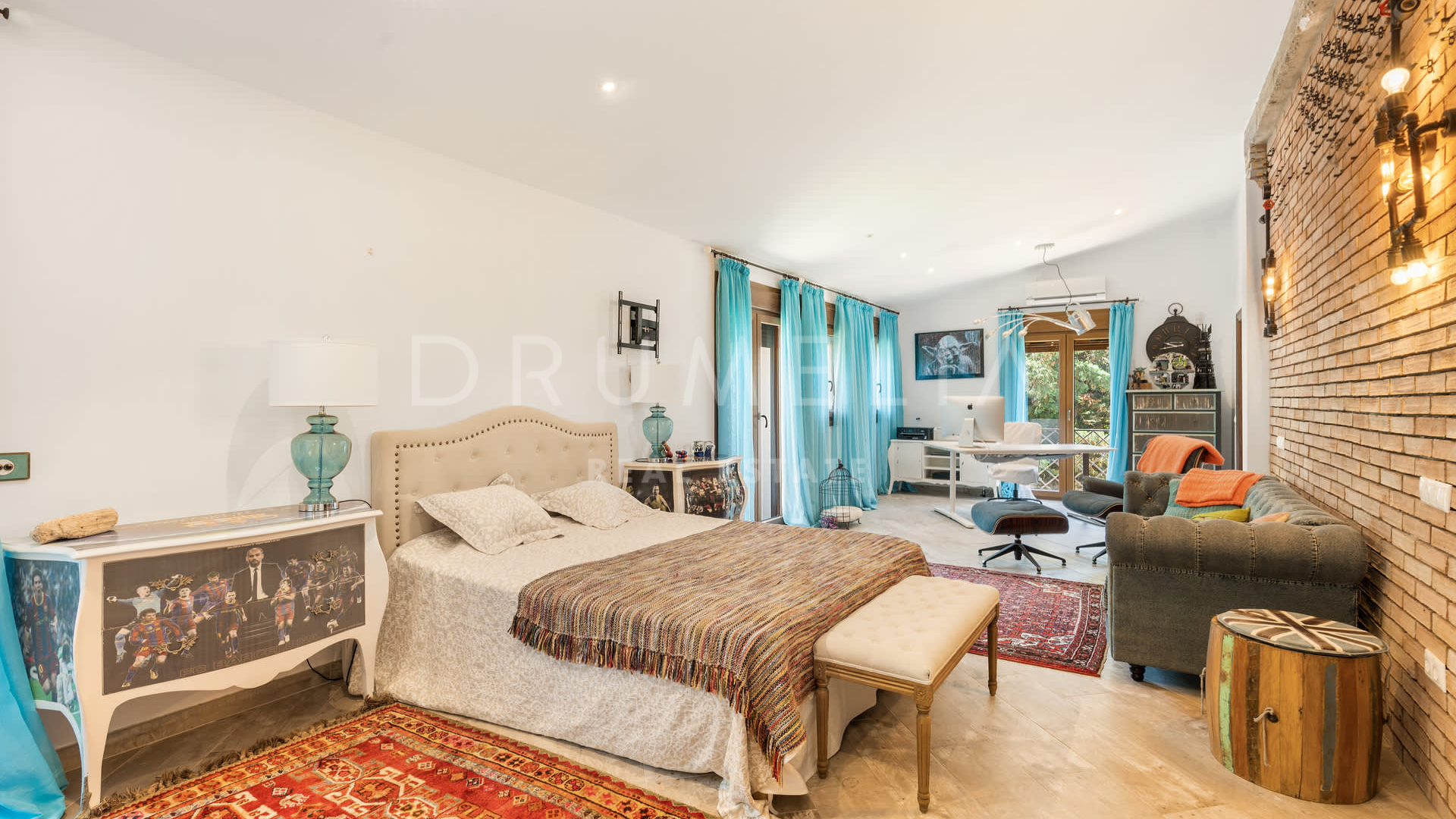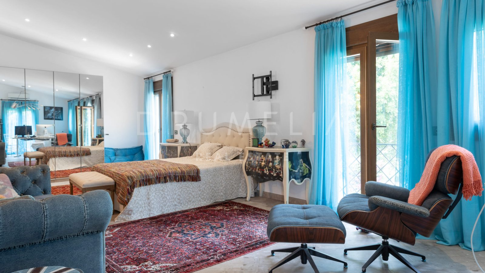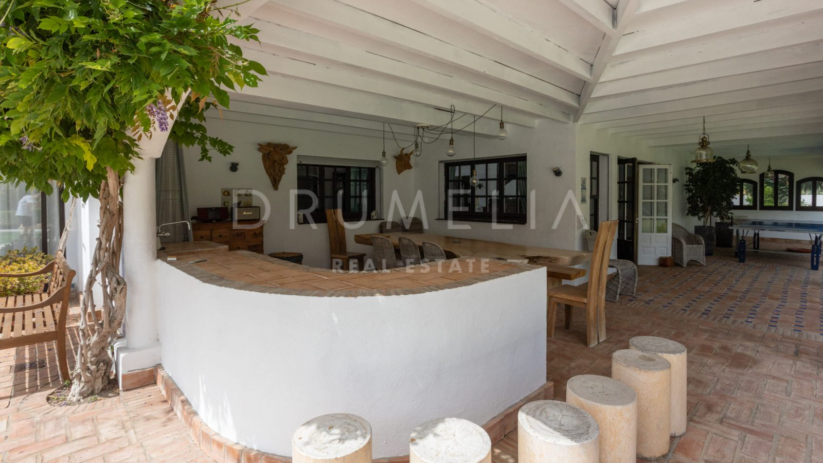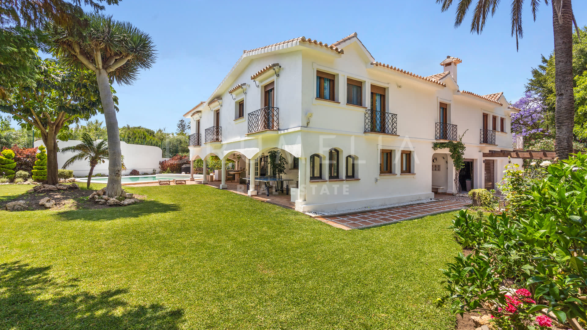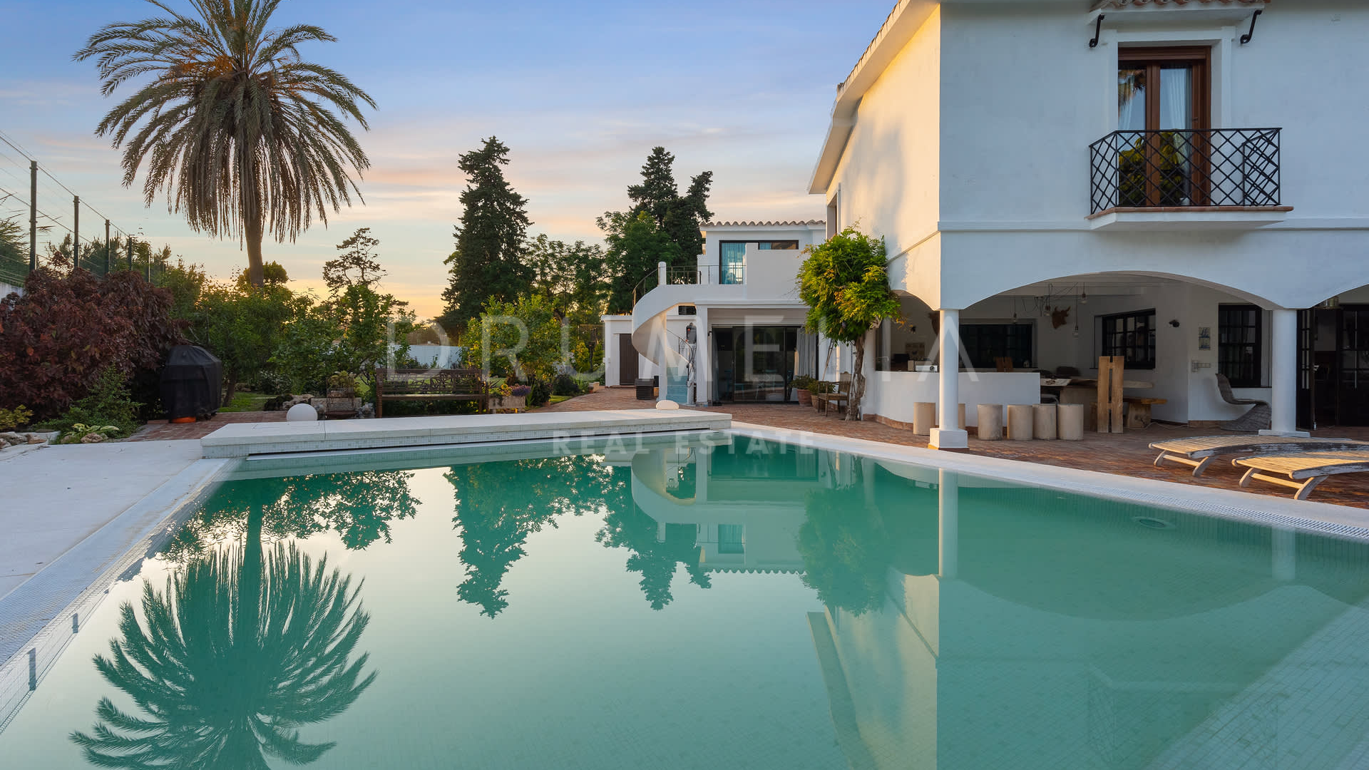 Charmig och elegant villa i Guadalmina Baja, bara 200 meter från det blå havet. Denna exceptionella bostad är perfekt integrerad i omgivningen och gränsar till den gröna ytan av en prestigefylld golfbana och det lugna flödet av Guadalmina River, vilket erbjuder en oas av oöverträffad avskildhet och lugn.