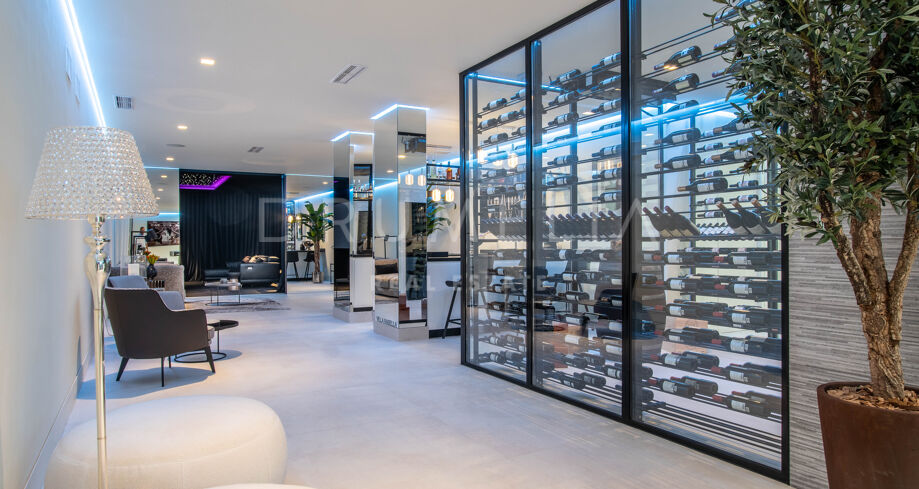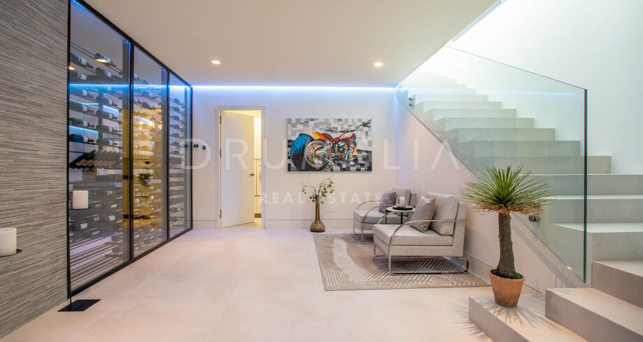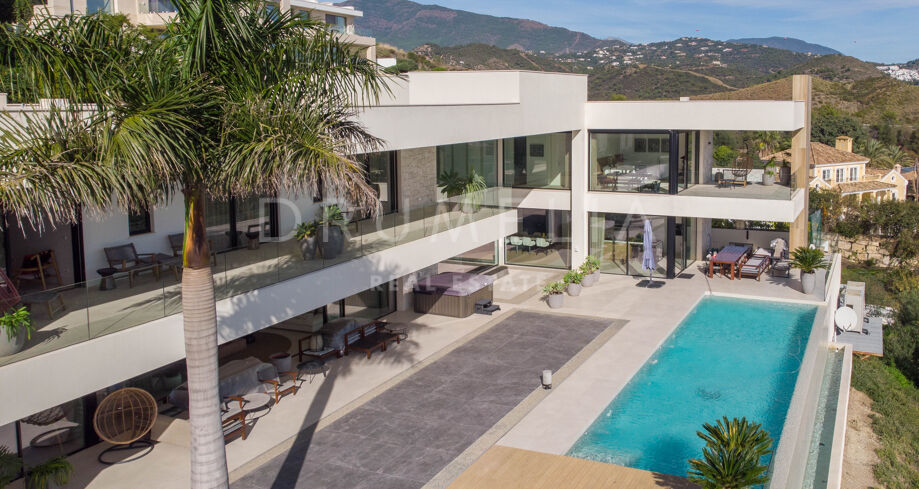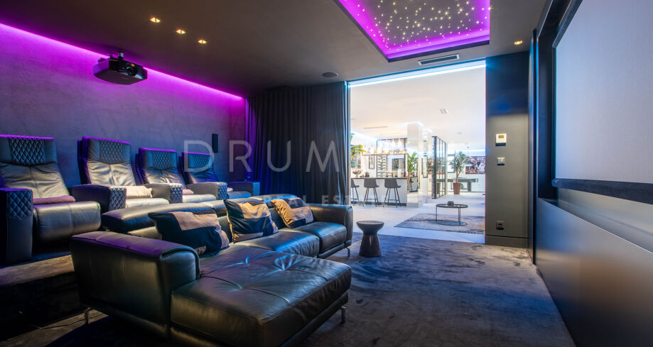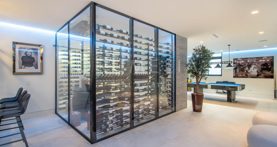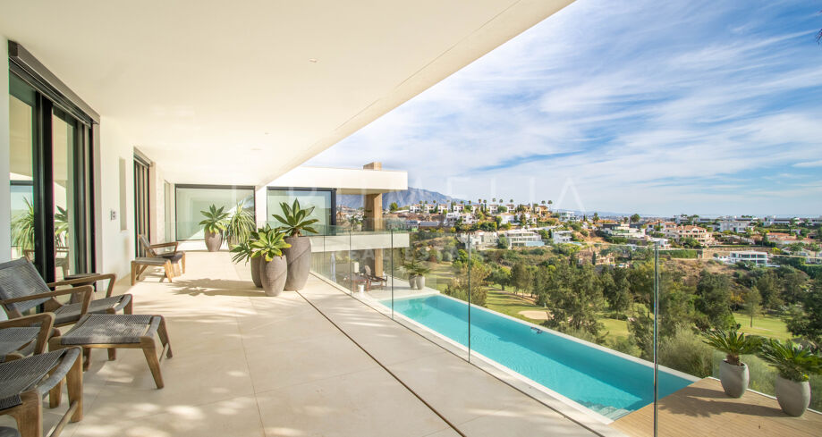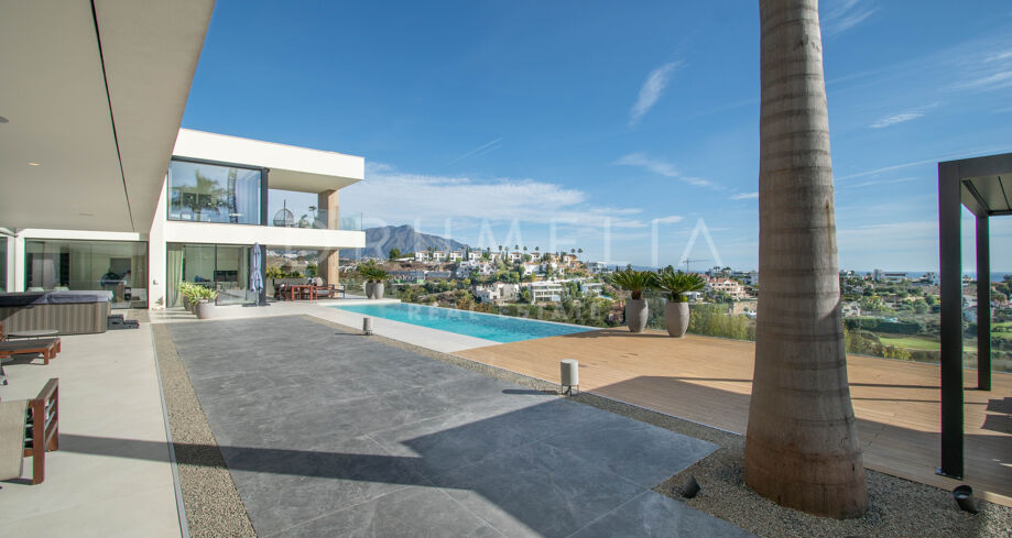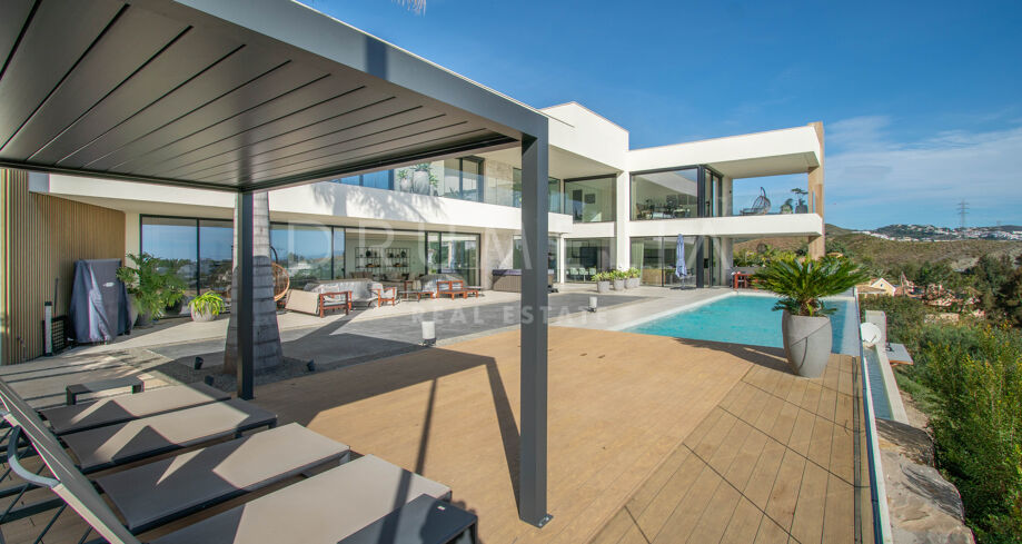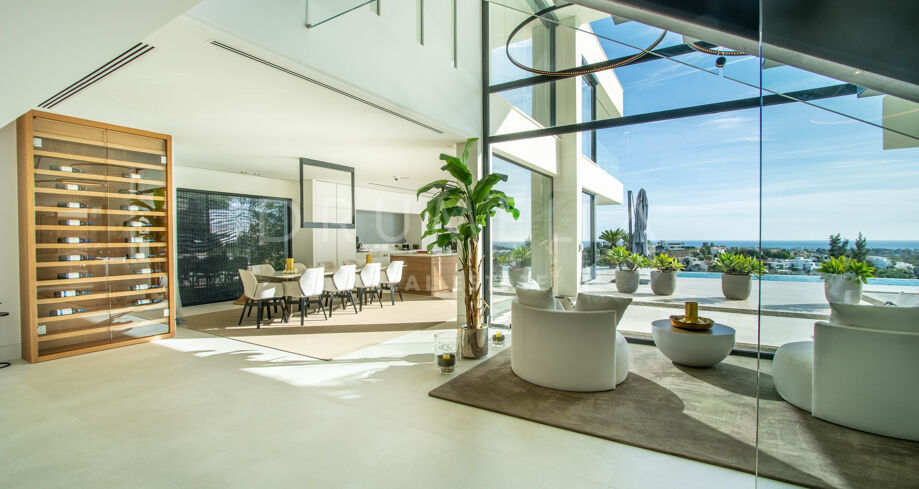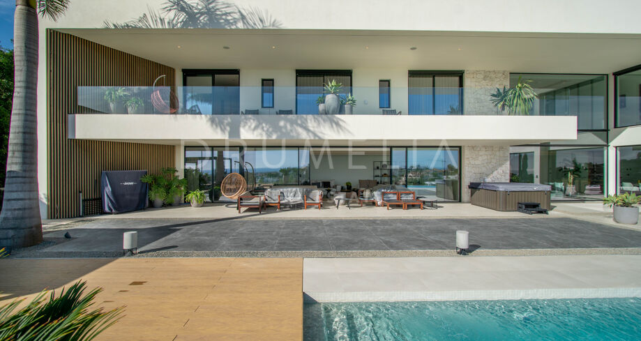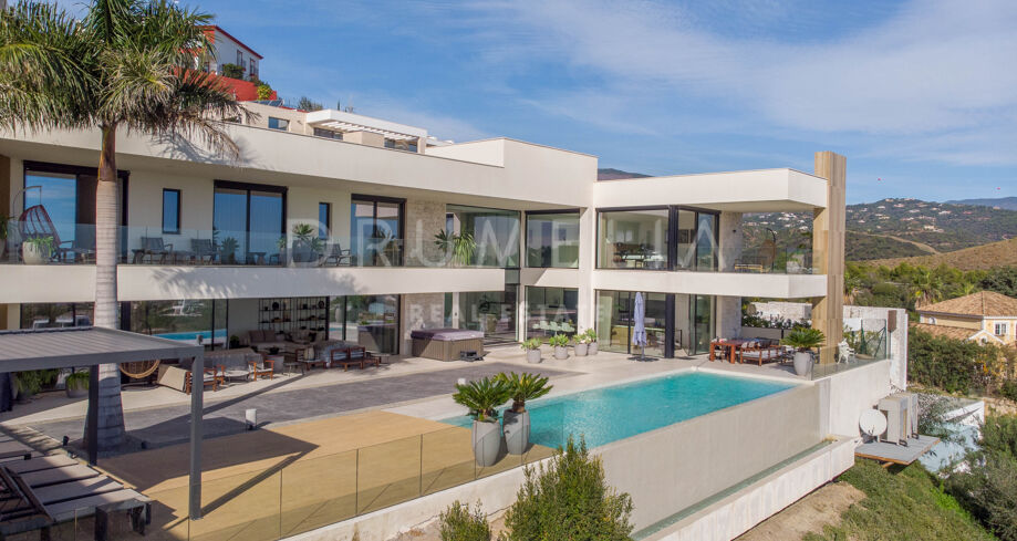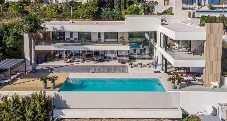 Det spektakulära huset på 616 m² ligger på en tomt på 1 427 m² och består av tre våningar, som nås via hiss eller flytande trappor, och har en vacker, rymlig entréhall med dubbel höjd. Öppen planlösning förenar sitt- och matplatser och ett fullt utrustat kök i minimalistisk stil med massiv ö och hushållsapparater av högsta kvalitet. De stora skjutfönsterna som är integrerade i väggen förbinder inomhus- och utomhusutrymmen. Fastigheten har rymliga täckta och icke täckta terrasser med hisnande utsikt över havet, bergen och golfbanan, en fantastisk infinitypool, jacuzzi, utekök och grill. Huvudterrassen har förvandlats helt och hållet med nya kakelplattor och LED-lampor som kan ändras till valfri färg. 5 sovrum och 6 badrum har designats helt och hållet med högkvalitativa material och utrustats med den senaste tekniken. Den stora källaren är fullt utrustad och har en spelplats, walk-in bodega, bar, loungeområde, SPA, bastu, turkiskt bad, gym, tvättstuga och ett riktigt biorum. Det finns ett privat garage.