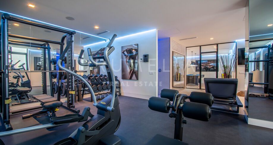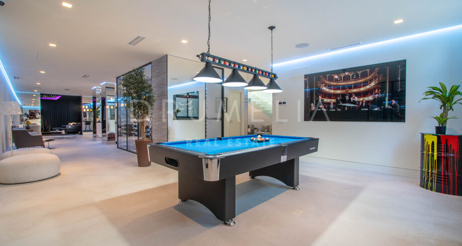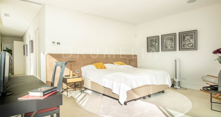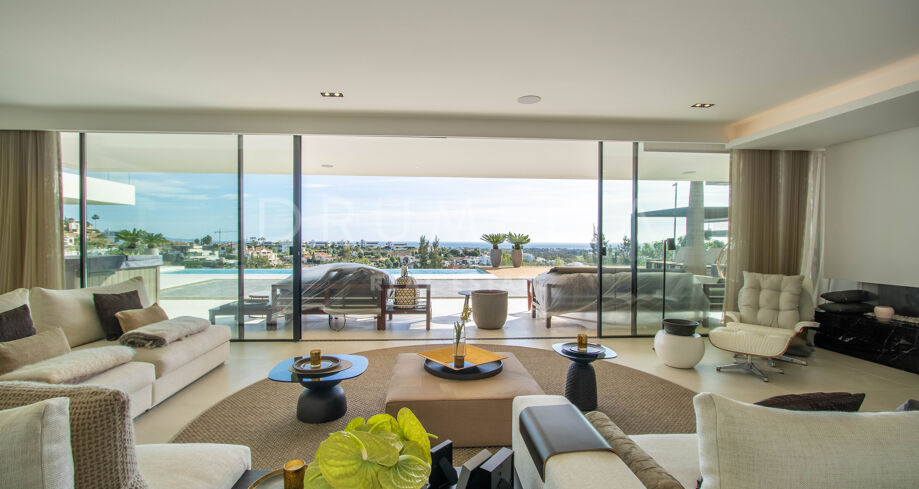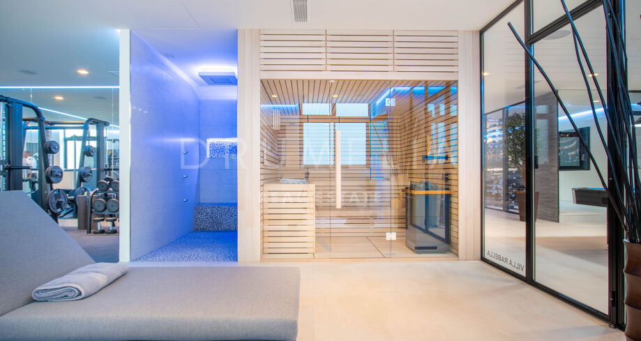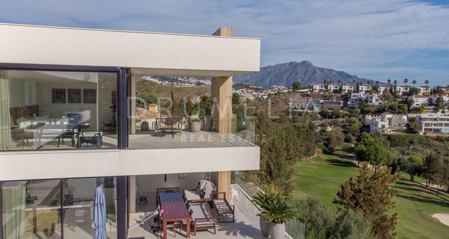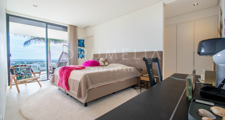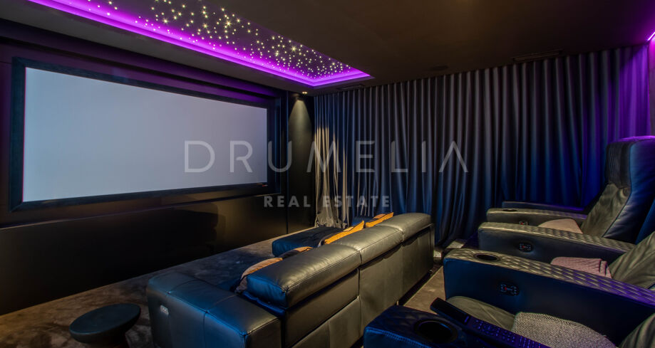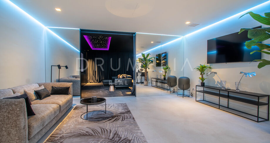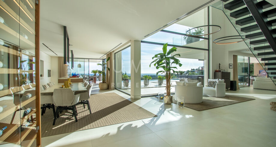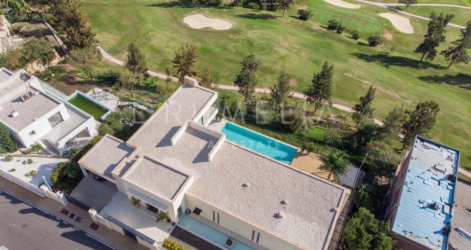 Det spektakulära huset på 616 m² ligger på en tomt på 1 427 m² och består av tre våningar, som nås via hiss eller flytande trappor, och har en vacker, rymlig entréhall med dubbel höjd. Öppen planlösning förenar sitt- och matplatser och ett fullt utrustat kök i minimalistisk stil med massiv ö och hushållsapparater av högsta kvalitet. De stora skjutfönsterna som är integrerade i väggen förbinder inomhus- och utomhusutrymmen. Fastigheten har rymliga täckta och icke täckta terrasser med hisnande utsikt över havet, bergen och golfbanan, en fantastisk infinitypool, jacuzzi, utekök och grill. Huvudterrassen har förvandlats helt och hållet med nya kakelplattor och LED-lampor som kan ändras till valfri färg. 5 sovrum och 6 badrum har designats helt och hållet med högkvalitativa material och utrustats med den senaste tekniken. Den stora källaren är fullt utrustad och har en spelplats, walk-in bodega, bar, loungeområde, SPA, bastu, turkiskt bad, gym, tvättstuga och ett riktigt biorum. Det finns ett privat garage.