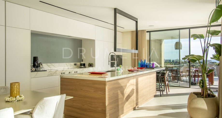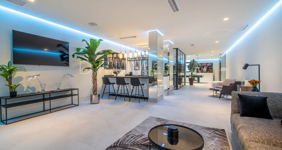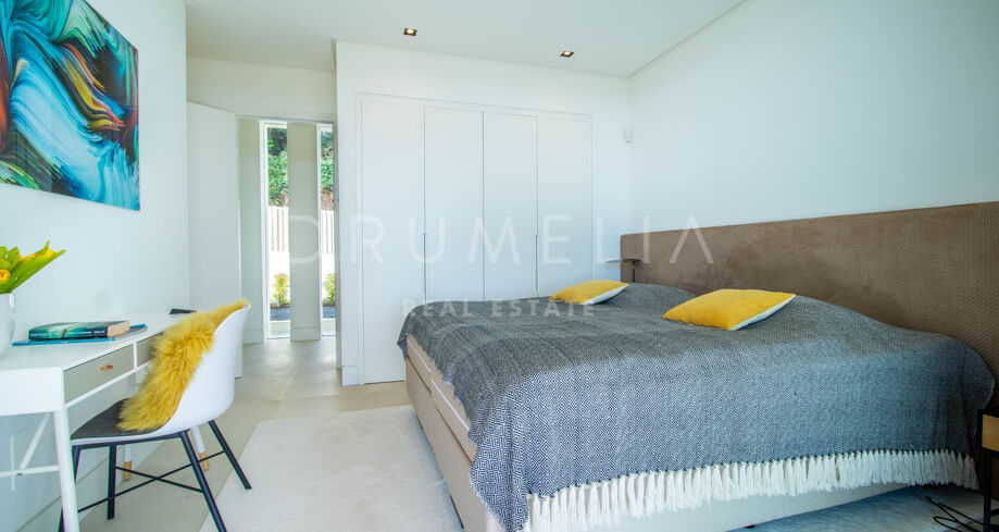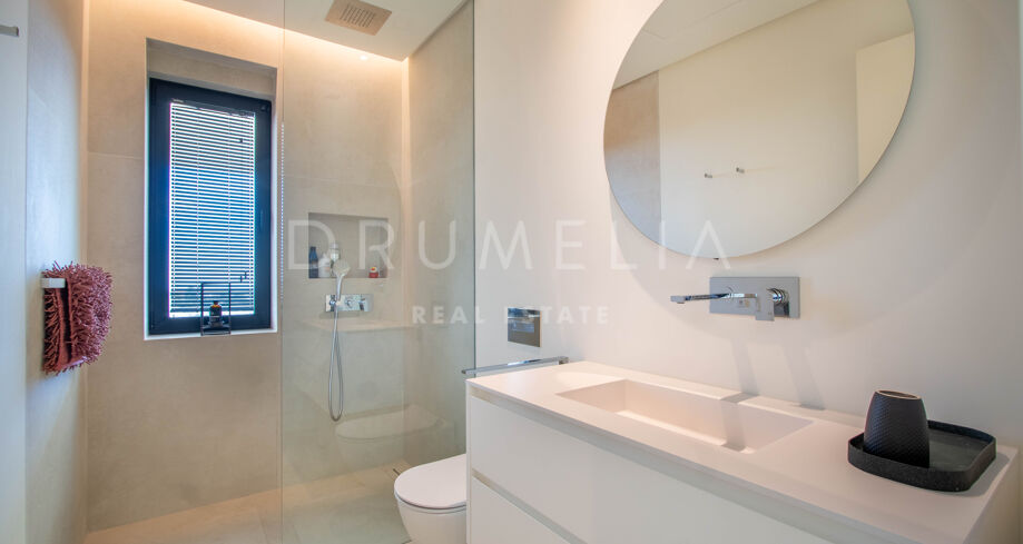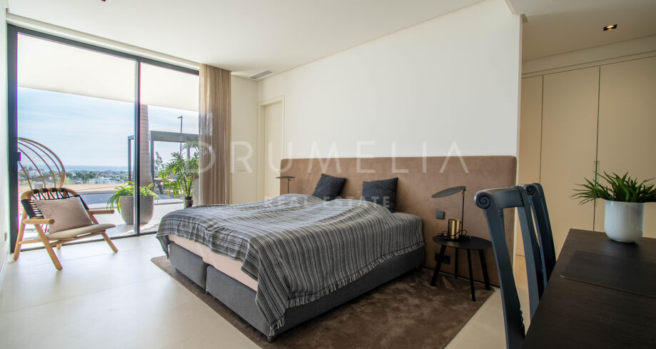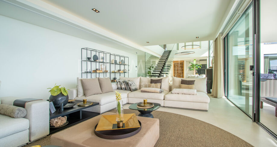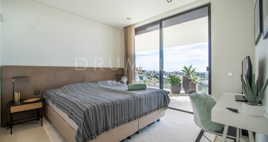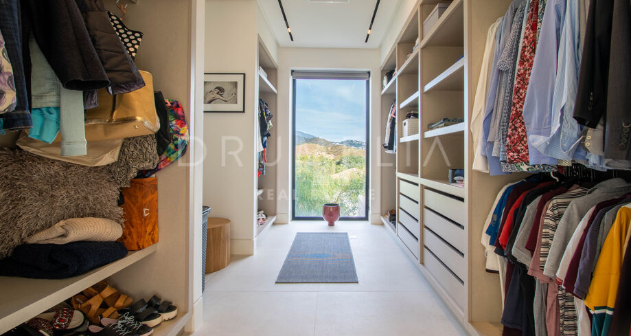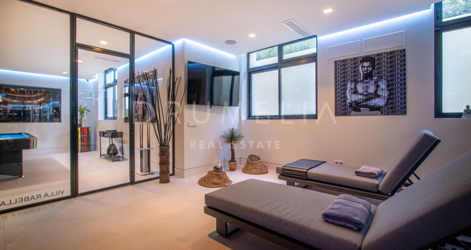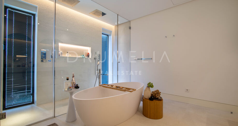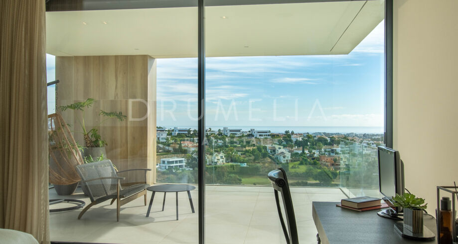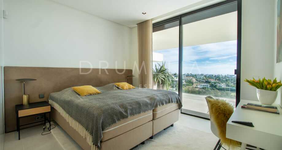 Det spektakulära huset på 616 m² ligger på en tomt på 1 427 m² och består av tre våningar, som nås via hiss eller flytande trappor, och har en vacker, rymlig entréhall med dubbel höjd. Öppen planlösning förenar sitt- och matplatser och ett fullt utrustat kök i minimalistisk stil med massiv ö och hushållsapparater av högsta kvalitet. De stora skjutfönsterna som är integrerade i väggen förbinder inomhus- och utomhusutrymmen. Fastigheten har rymliga täckta och icke täckta terrasser med hisnande utsikt över havet, bergen och golfbanan, en fantastisk infinitypool, jacuzzi, utekök och grill. Huvudterrassen har förvandlats helt och hållet med nya kakelplattor och LED-lampor som kan ändras till valfri färg. 5 sovrum och 6 badrum har designats helt och hållet med högkvalitativa material och utrustats med den senaste tekniken. Den stora källaren är fullt utrustad och har en spelplats, walk-in bodega, bar, loungeområde, SPA, bastu, turkiskt bad, gym, tvättstuga och ett riktigt biorum. Det finns ett privat garage.