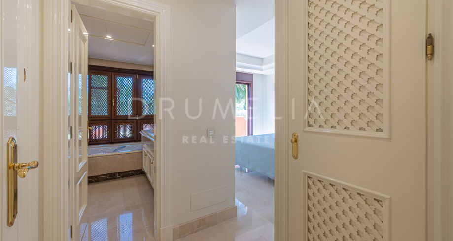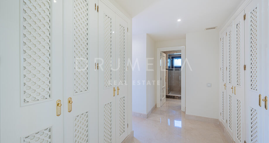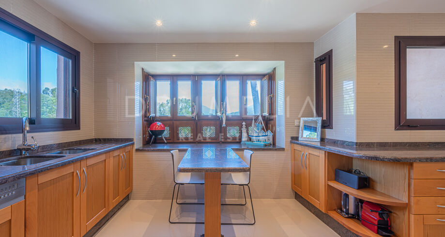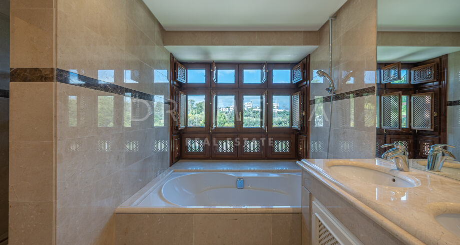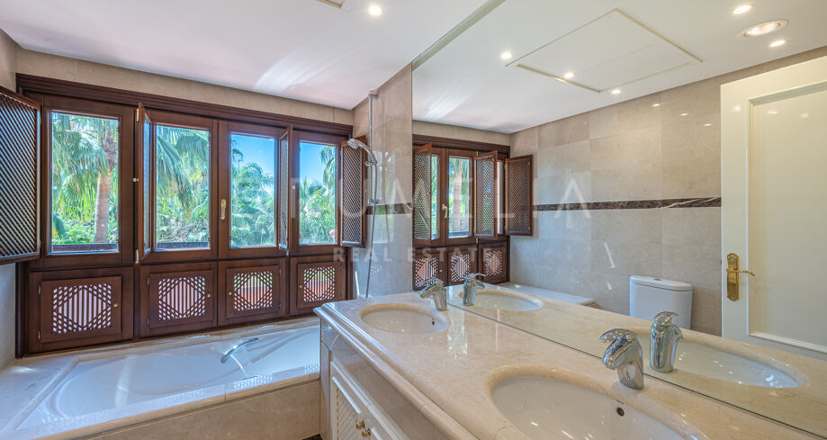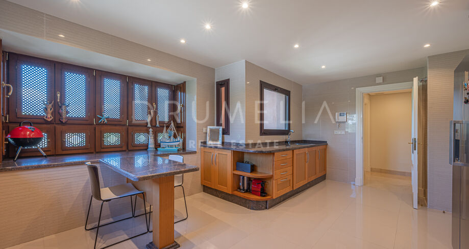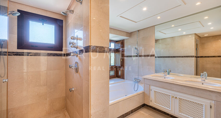 På övervåningen finns 2 sovrumssviter, varav det ena har ett omklädningsrum. Båda sovrummen har tillgång till den stora solterrassen, där man kan njuta av oförglömliga stunder av avkoppling och njutning. Det attraktiva hemmet erbjuder lyx och komfort och säljs i gott skick, fullt möblerat, med ett förråd, gästtoalett, luftkonditionering, marmor och traditionella terrakottakakelgolv, inbyggda garderober, glasdörrar, tvåglasfönster, elektriska persienner etc. Det finaste av levande upplevelser i det prestigefyllda läget i Medelhavsområdet garanteras!
