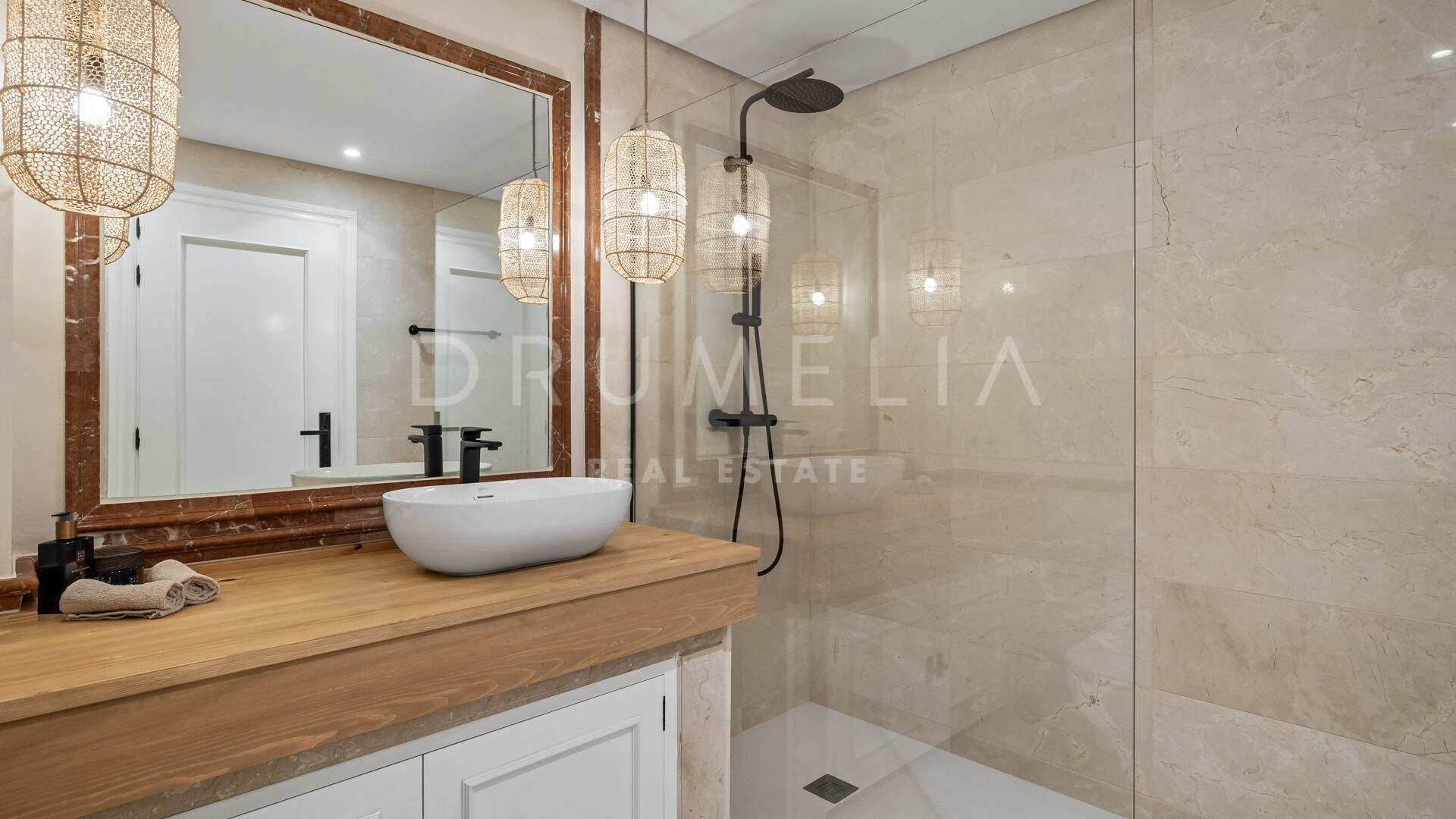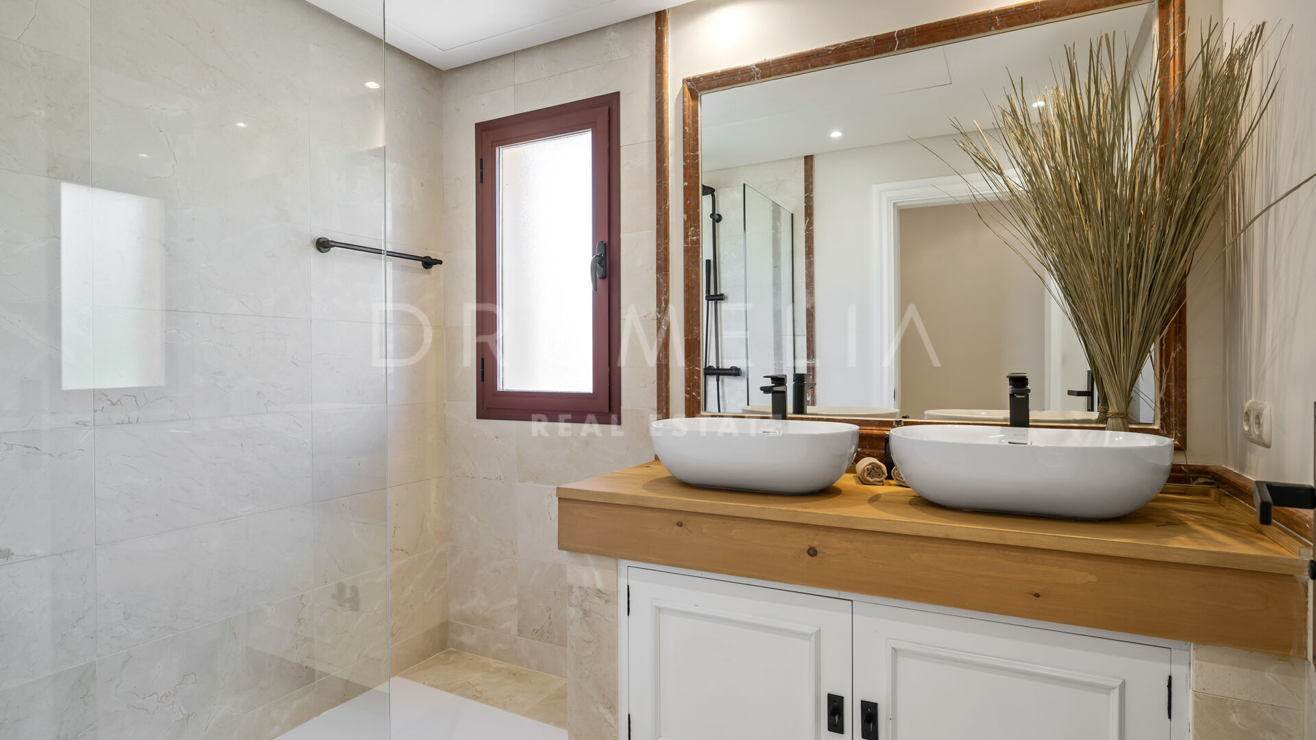 Den fantastiska villan har ett öppet kök i elegant minimalistisk stil med öppen planlösning, fullt utrustat med Siemens-apparater och en massiv ö med frukostområde. Det ligger i mitten av ett elegant vardagsrum och matsal med genomskinlig modern öppen spis och utgång till den fantastiska terrassen och trädgården. Var och en av de 5 sovrummen har ett eget badrum, 3 på första våningen och 2 på nedre plan. Det stora sovrummet och ett annat sovrum har direkt tillgång till den mysiga terrassen. Ett enormt solarium på över 100 m² har många möjligheter och du kommer att beundra den fantastiska utsikten till den bildsköna omgivningen, Nueva Andalucias dal och bergen.