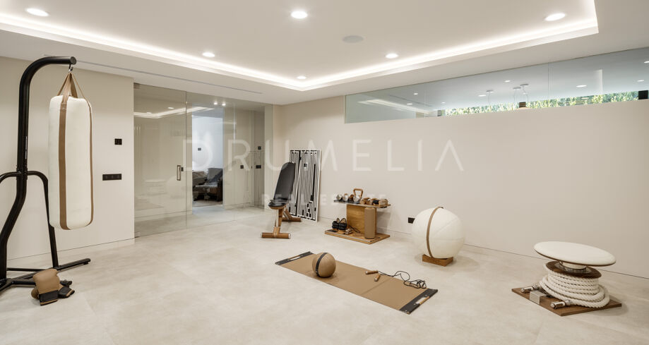 Den lägre nivån är utformad för fritid och välbefinnande med ett TV-rum, ett spelrum, ett fullt utrustat gym och ett spa med bastu och hamam. På denna våning finns också ytterligare ett sovrum med eget badrum och ett flexibelt utrymme som kan fungera som ett sjätte sovrum eller hemmakontor, intill gymområdet.