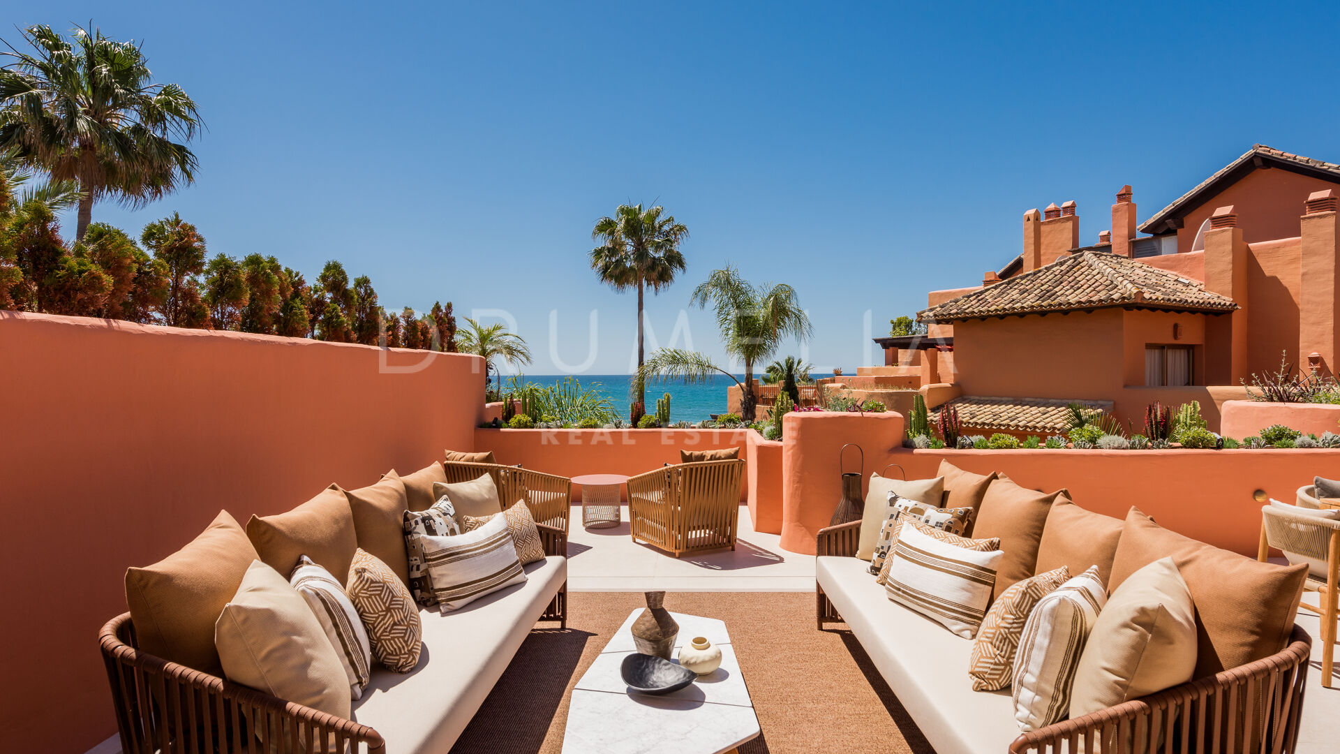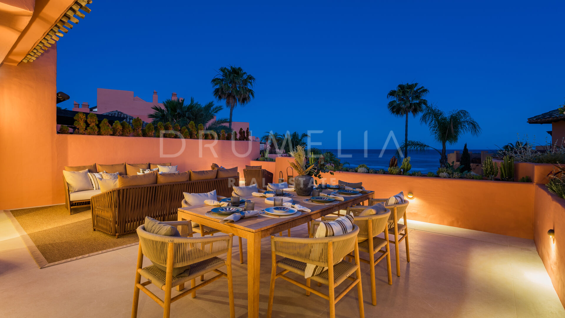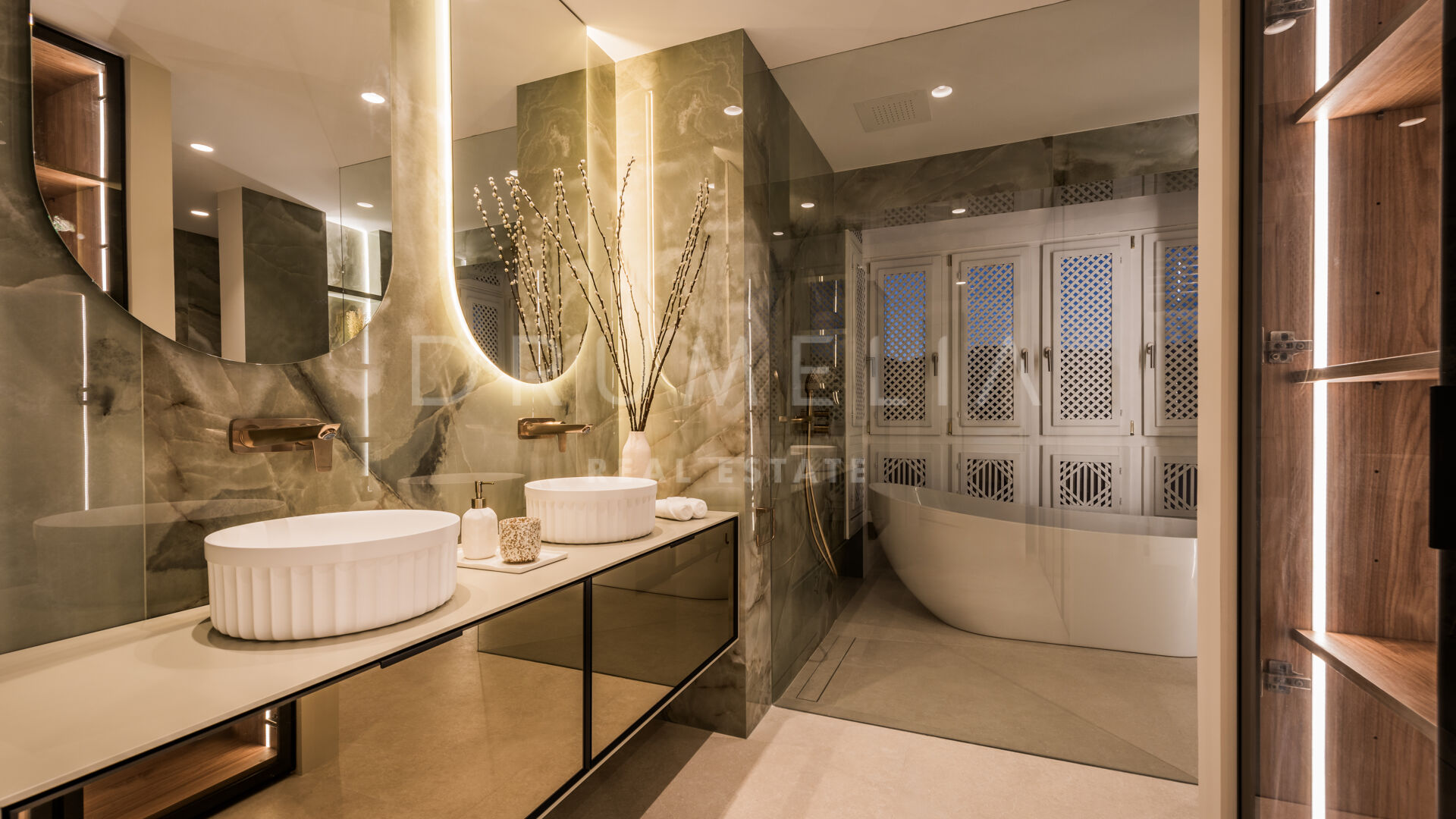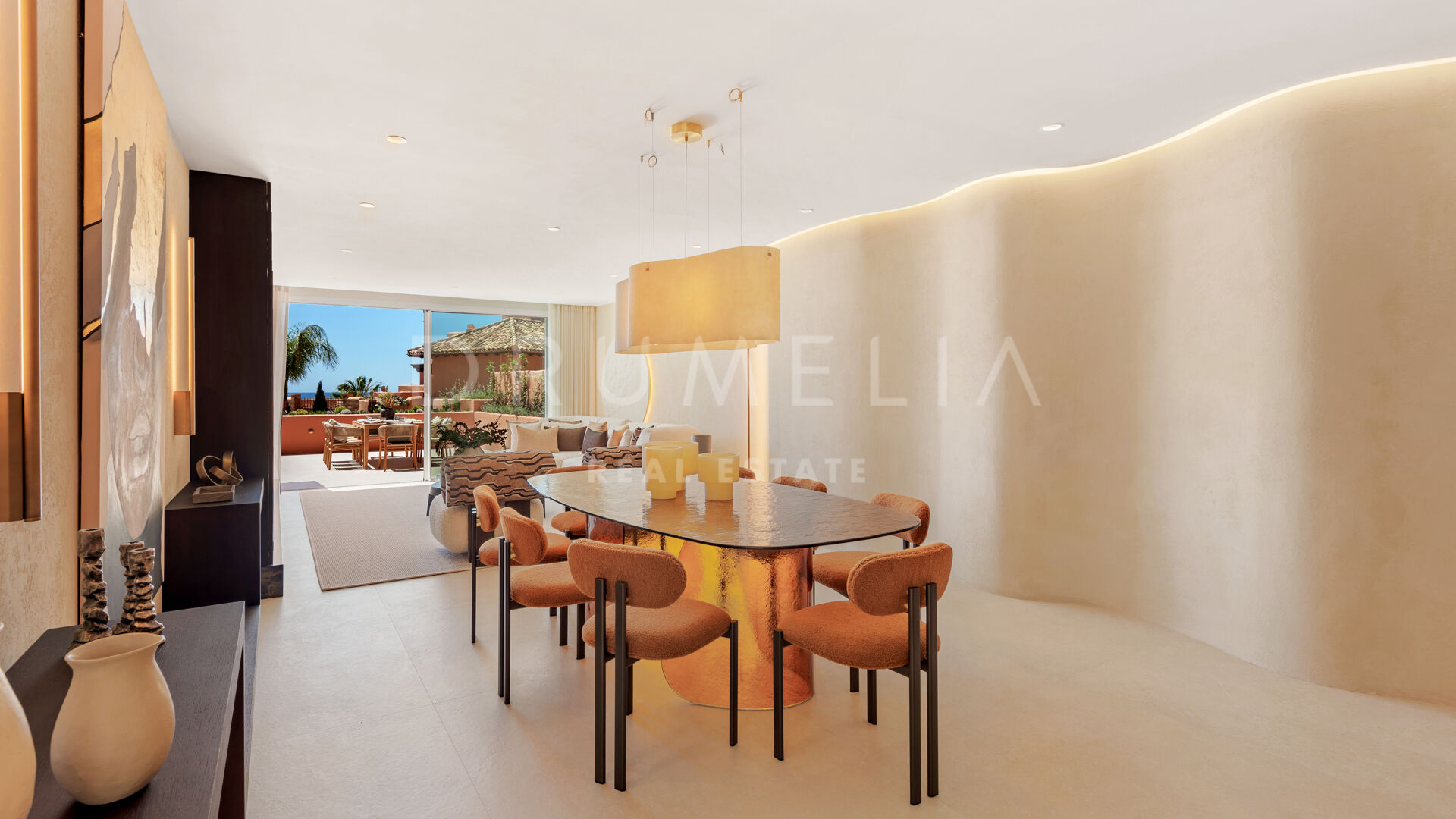 Omgiven av subtropisk grönska och lyxfastigheter i Marbella East, erbjuder den exceptionella lägenheten på 2 plan med 256 m² plus 203 m² terrasser utrymme som normalt bara finns i radhus och hus. Den sydvästliga orienteringen ger den gott om dagsljus och underbar utsikt direkt till havet. Läget, den rymliga öppna planlösningen, storleken och den spektakulära havs- och trädgårdsutsikten gör det till en mycket attraktiv möjlighet på dagens marknad. Fastigheten har 4 sovrum och 5 badrum, ett Siematic designkök med Miele-apparater, rymliga vardagsrum och matplatser som leder till terrasserna, och 2 underjordiska parkeringsplatser och ett förråd. Lägenheten är vackert renoverad till en mycket hög standard och säljs med eleganta golv och tak, en elektrisk öppen spis, skräddarsydda garderober, ett Bang & Olufsen ljudsystem, larm, exklusiva Kettal utemöbler, luftkonditionering och golvvärme. Den högkvalitativa inredningen och de eleganta möblerna har noggrant valts ut av en välkänd inredningsarkitekt.