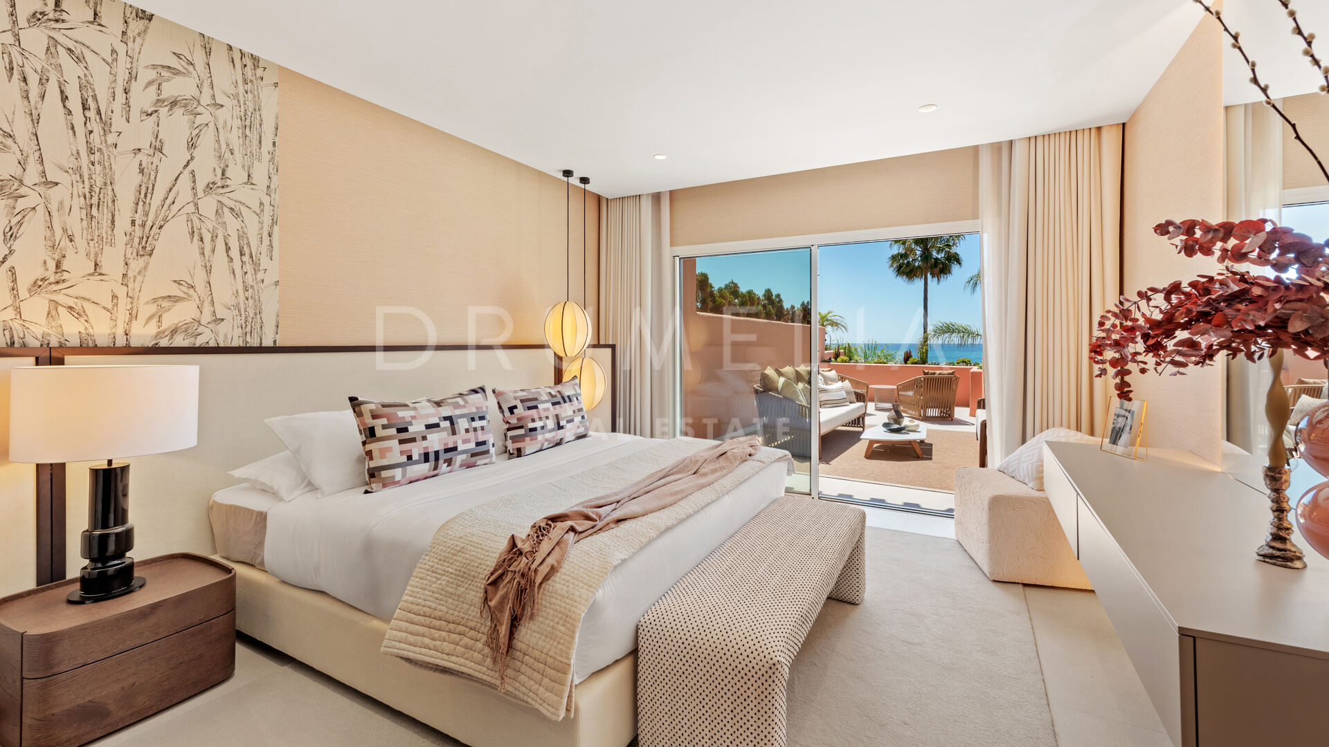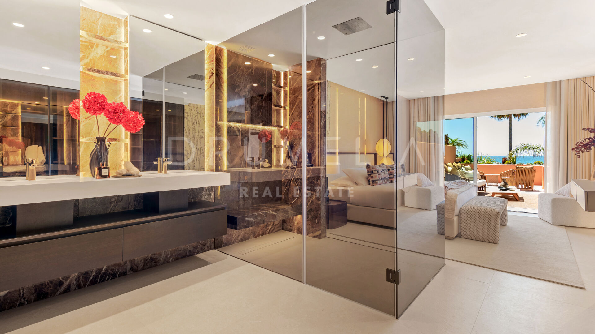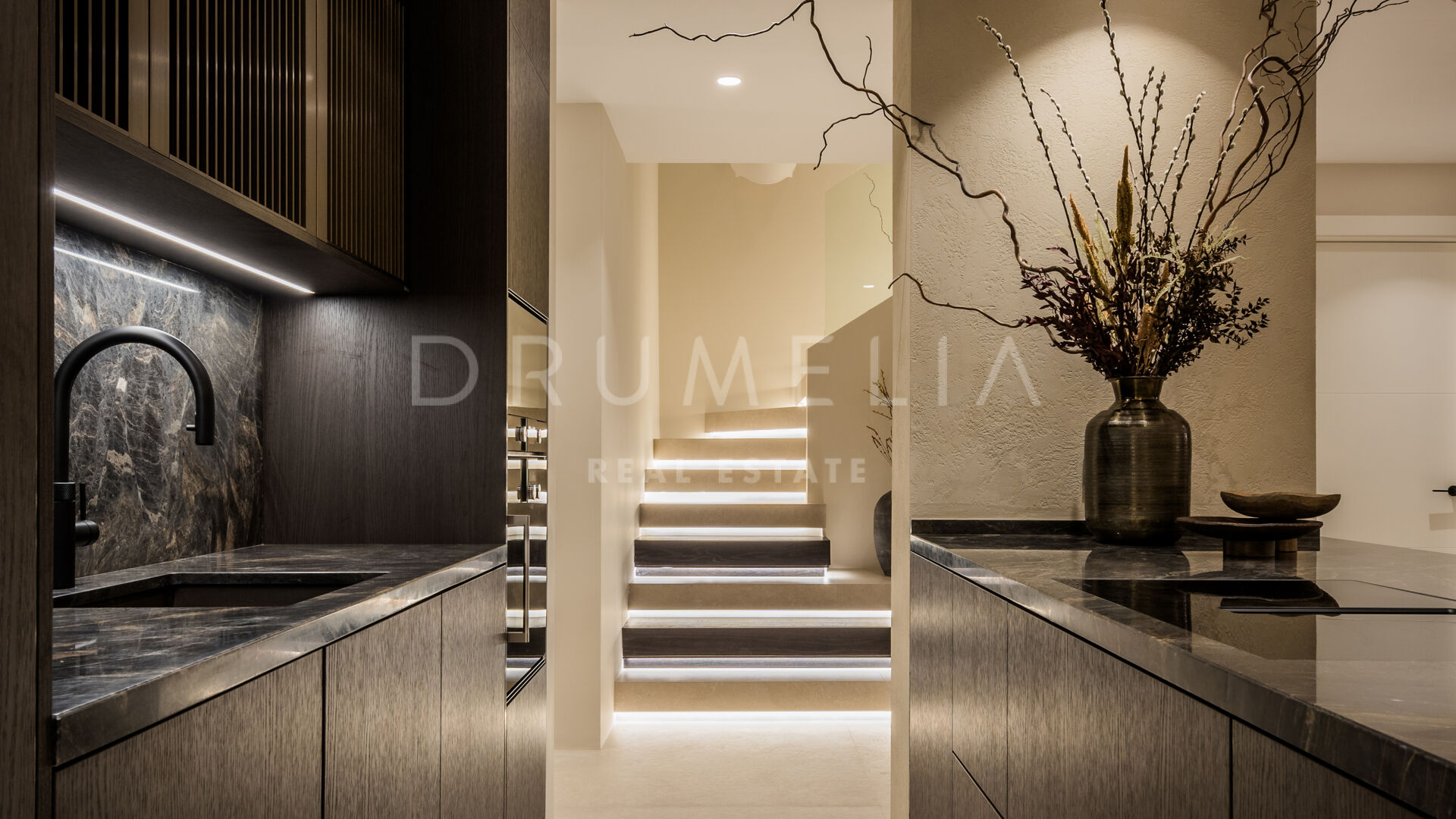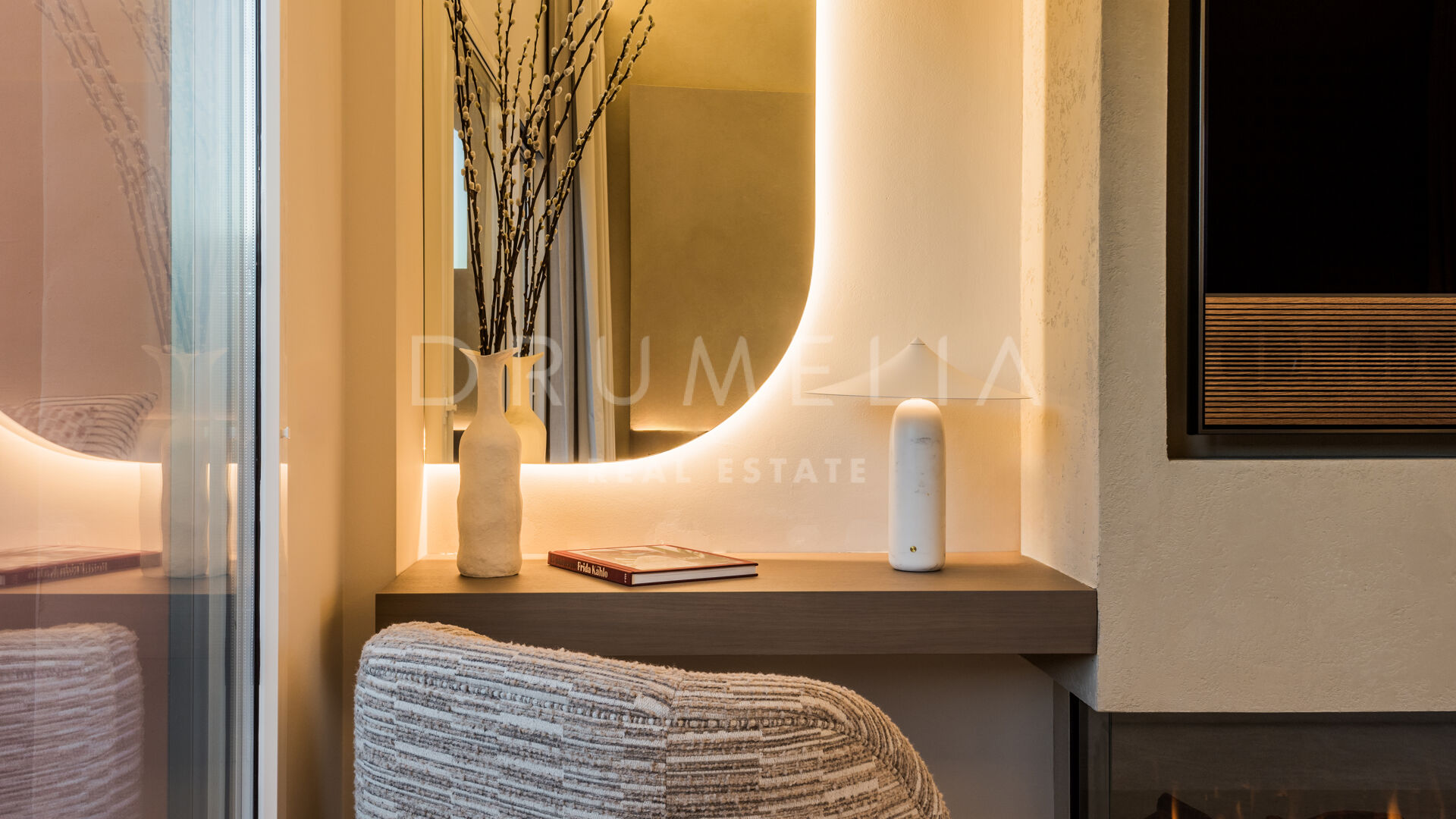 Omgiven av subtropisk grönska och lyxfastigheter i Marbella East, erbjuder den exceptionella lägenheten på 2 plan med 256 m² plus 203 m² terrasser utrymme som normalt bara finns i radhus och hus. Den sydvästliga orienteringen ger den gott om dagsljus och underbar utsikt direkt till havet. Läget, den rymliga öppna planlösningen, storleken och den spektakulära havs- och trädgårdsutsikten gör det till en mycket attraktiv möjlighet på dagens marknad. Fastigheten har 4 sovrum och 5 badrum, ett Siematic designkök med Miele-apparater, rymliga vardagsrum och matplatser som leder till terrasserna, och 2 underjordiska parkeringsplatser och ett förråd. Lägenheten är vackert renoverad till en mycket hög standard och säljs med eleganta golv och tak, en elektrisk öppen spis, skräddarsydda garderober, ett Bang & Olufsen ljudsystem, larm, exklusiva Kettal utemöbler, luftkonditionering och golvvärme. Den högkvalitativa inredningen och de eleganta möblerna har noggrant valts ut av en välkänd inredningsarkitekt.
