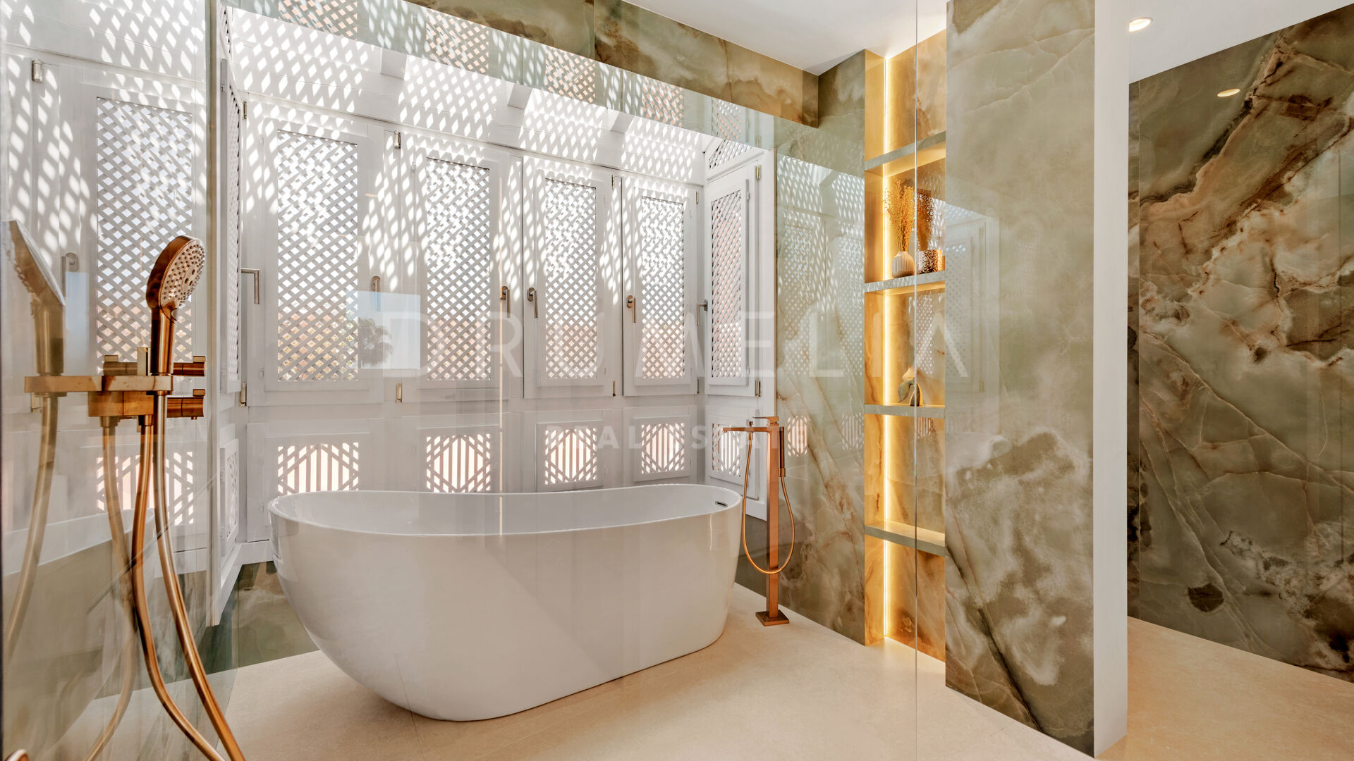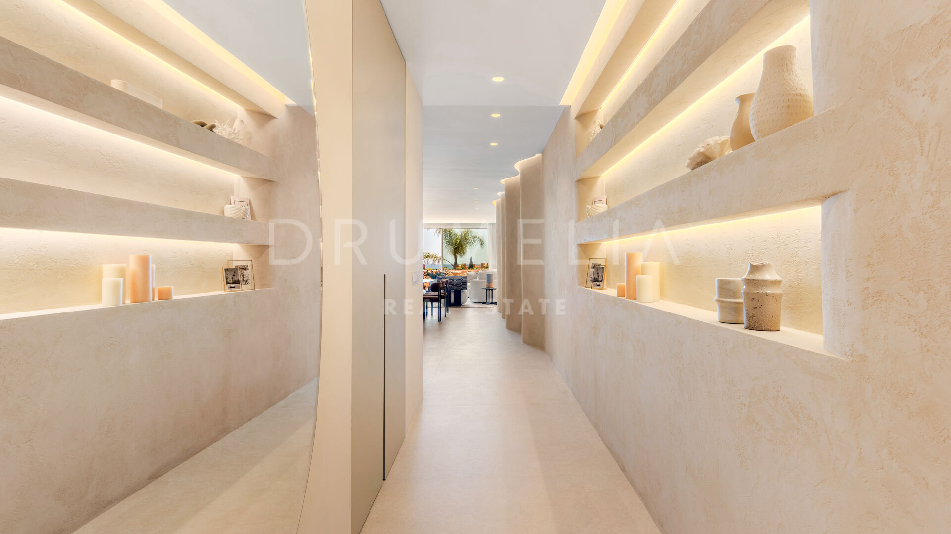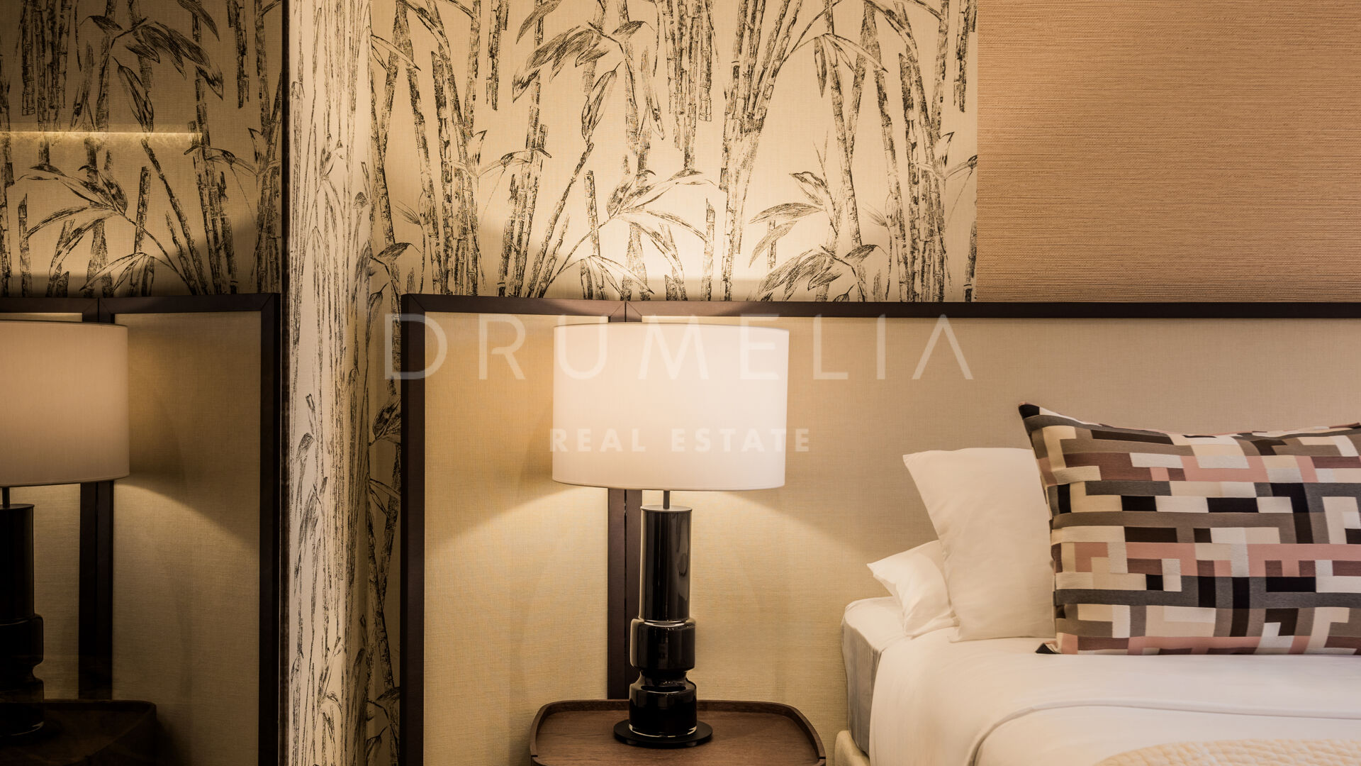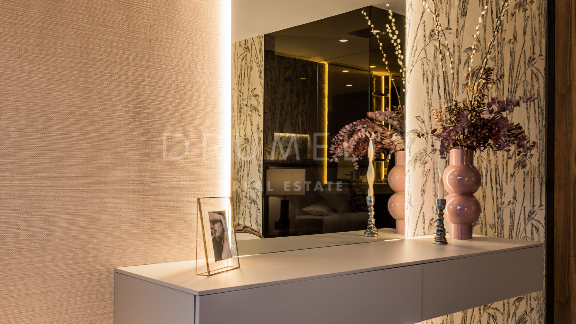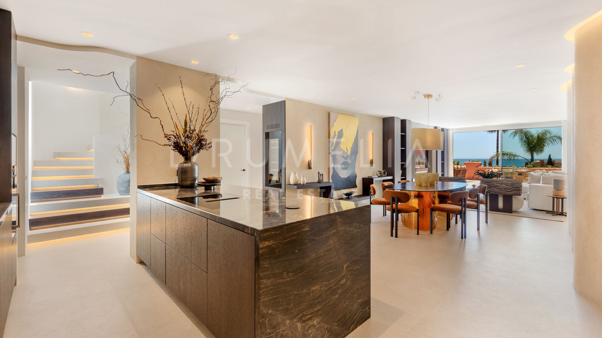 Omgiven av subtropisk grönska och lyxfastigheter i Marbella East, erbjuder den exceptionella lägenheten på 2 plan med 256 m² plus 203 m² terrasser utrymme som normalt bara finns i radhus och hus. Den sydvästliga orienteringen ger den gott om dagsljus och underbar utsikt direkt till havet. Läget, den rymliga öppna planlösningen, storleken och den spektakulära havs- och trädgårdsutsikten gör det till en mycket attraktiv möjlighet på dagens marknad. Fastigheten har 4 sovrum och 5 badrum, ett Siematic designkök med Miele-apparater, rymliga vardagsrum och matplatser som leder till terrasserna, och 2 underjordiska parkeringsplatser och ett förråd. Lägenheten är vackert renoverad till en mycket hög standard och säljs med eleganta golv och tak, en elektrisk öppen spis, skräddarsydda garderober, ett Bang & Olufsen ljudsystem, larm, exklusiva Kettal utemöbler, luftkonditionering och golvvärme. Den högkvalitativa inredningen och de eleganta möblerna har noggrant valts ut av en välkänd inredningsarkitekt.