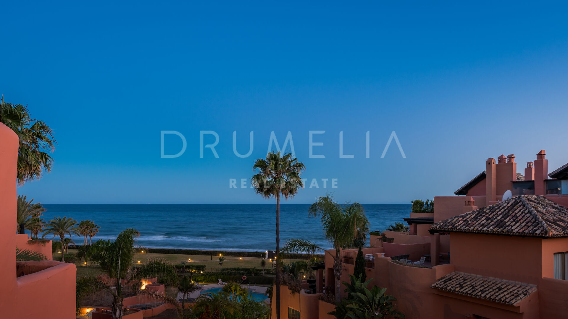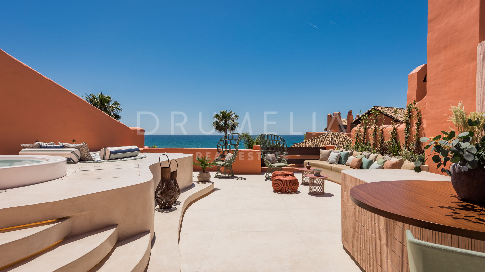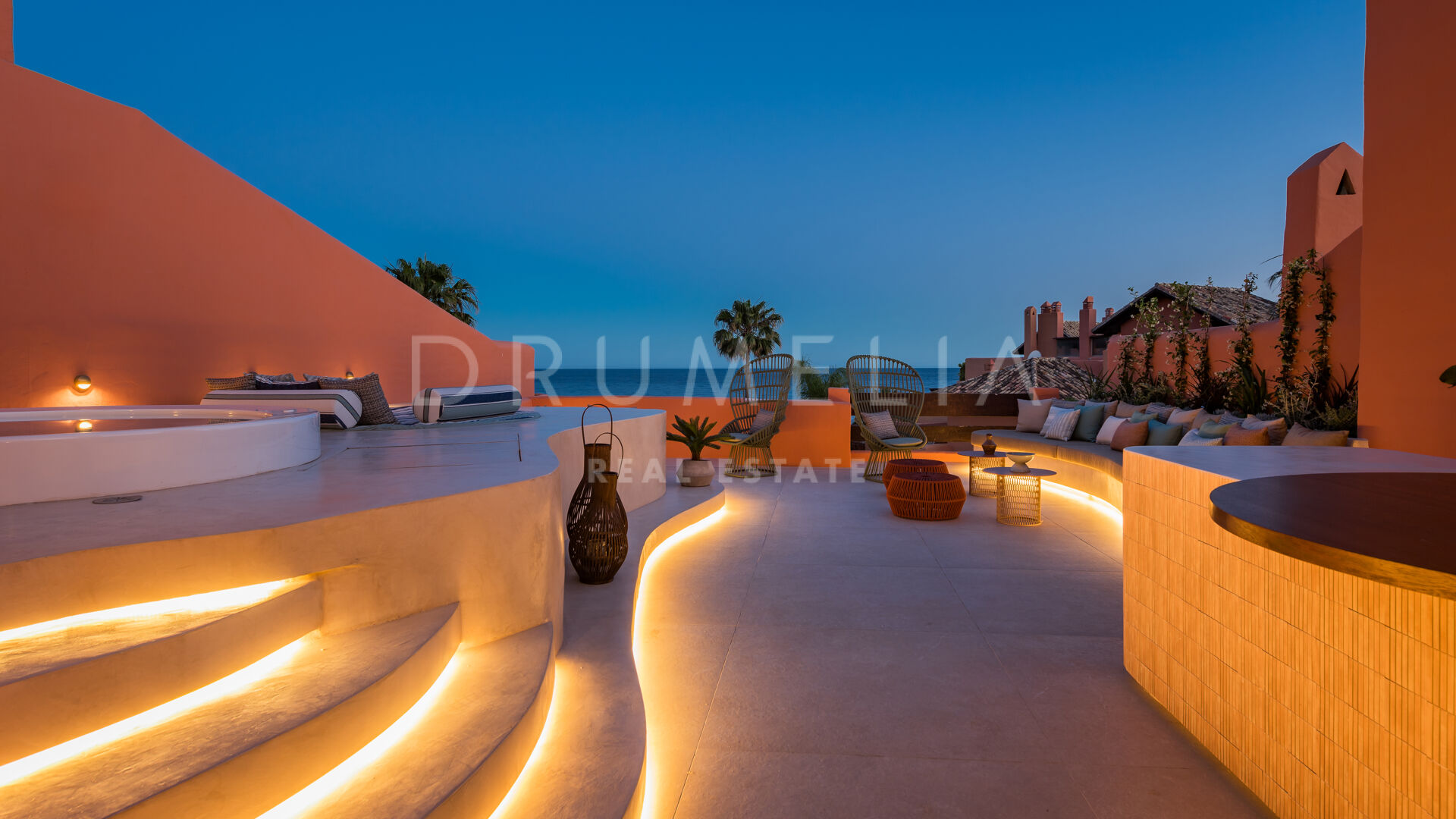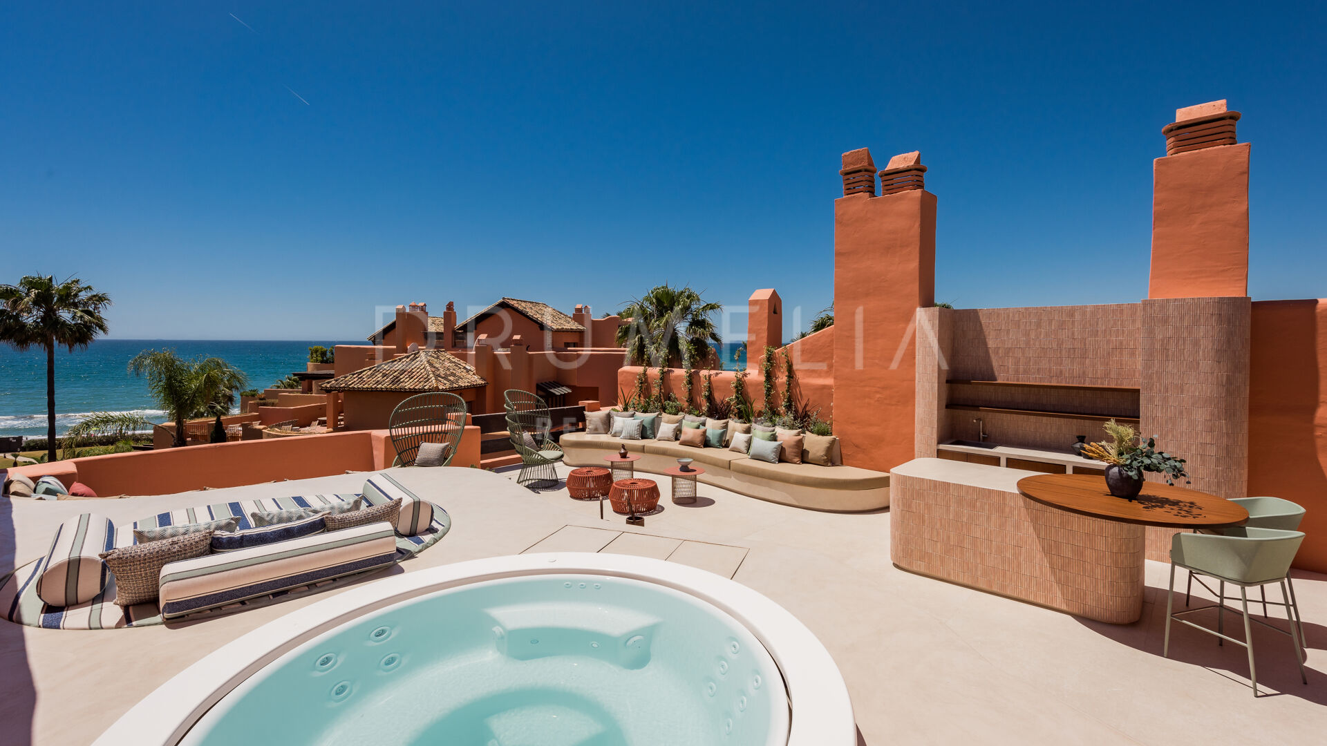 Denna fantastiska takvåning i ett lyxigt strandkomplex i Marbella East är en oas av lugn och avskildhet, med fantastisk utsikt och alla bekvämligheter till hands. En riktig fångst! Varje dag kommer att vara som semester vid havet!