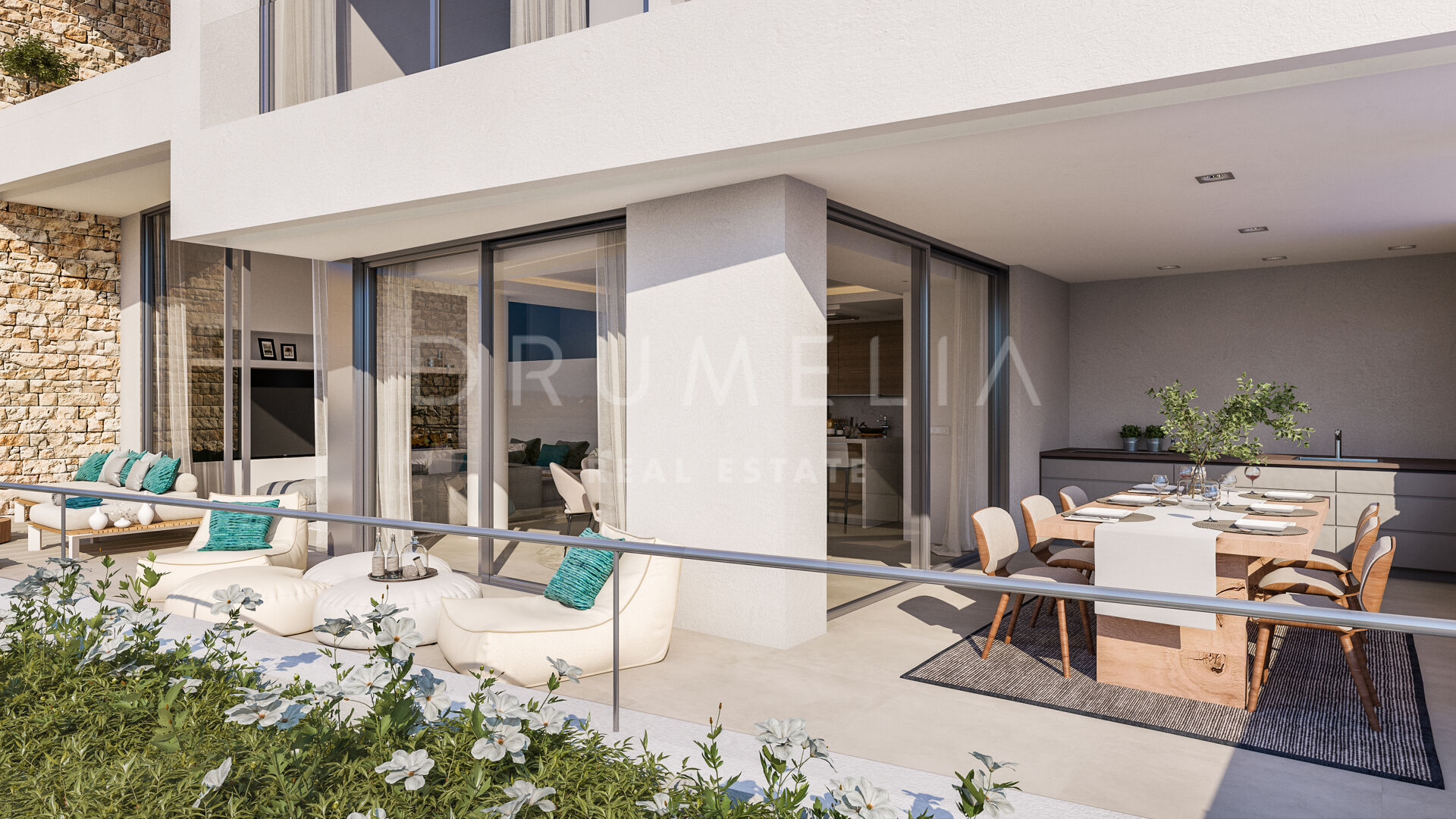 Denna fantastiska moderna lägenhet på bottenvåningen till salu i La Quinta, Benahavis, är en dröm som snart kan bli verklighet. Den magnifika fastigheten är under uppbyggnad och förväntas vara färdig i mars 2022. Takvåningen har en fantastisk havsutsikt och är “crème de la crème” av 7 stora lägenheter i ett trevåningshus med spa- och avkopplingsfaciliteter: ett fullt utrustat gym med de senaste maskinerna, bastu och ångbastu. Den vackra fasaden och stenväggarna smälter perfekt samman med en utomhuspool som kommer att behandlas med ett saltelektrolysesystem och omges av en förtrollande subtropisk trädgård.