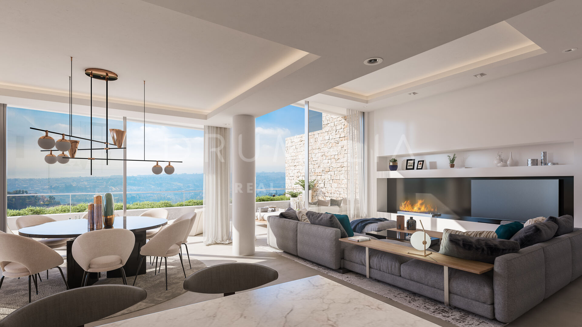 Den stora och ljusa takvåningen i två våningar på 514 m² kommer att erbjuda en kombination av spektakulär modern design och härlig medelhavs charm. De exceptionellt stora vardagsrummen och matplatserna och de rymliga terrasserna på 287 m² beundrar den hisnande panoramiska havsutsikten. Det generösa eleganta vardagsrummet med öppen planlösning består av en rymlig entréhall, ett vardagsrum med högt i tak, biologisk öppen spis och TV-rum, en matsal och ett modernt, skräddarsytt och elegant kök med hög standard, utrustat med en ö/bar/frukosthörna. Det skjutbara panoramafönstret som går från golv till tak öppnas automatiskt via fjärrkontroll för att möjliggöra en fullständig integrering av den stora utomhusterrassen i lägenheten, vilket skapar en känsla av frihet. Du kan äta middag utomhus med familjen eller koppla av med ett glas vin i relaxhörnan och beundra den fantastiska utsikten. Den fantastiska takvåningen kommer att ha 2 gästsviter med utgång till terrassen och det stora sovrummet på 42 m² med ett omklädningsrum i ek, ett badrum (elegant dubbelt handfat med ett inbyggt träskåp under, ett fristående badkar, termostatkranar, elektriska handdukstorkar) med privat terrass och utomhusdusch, och kommer också att ha tillgång till huvudterrassen med söder- och västerläge.