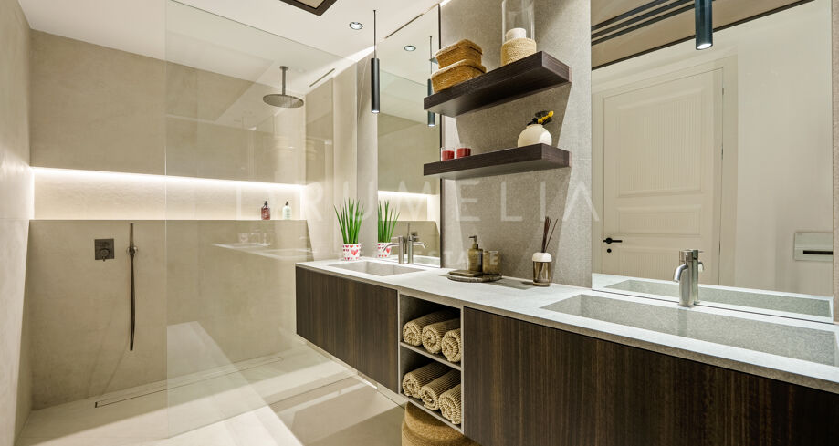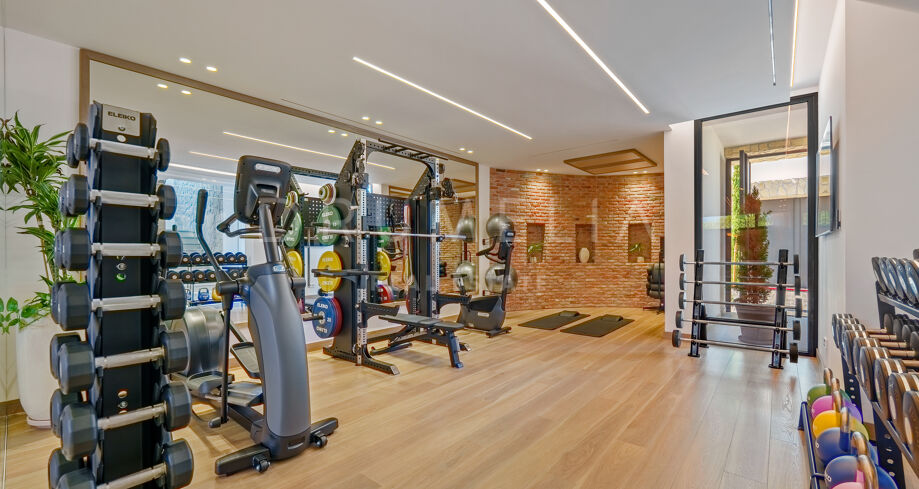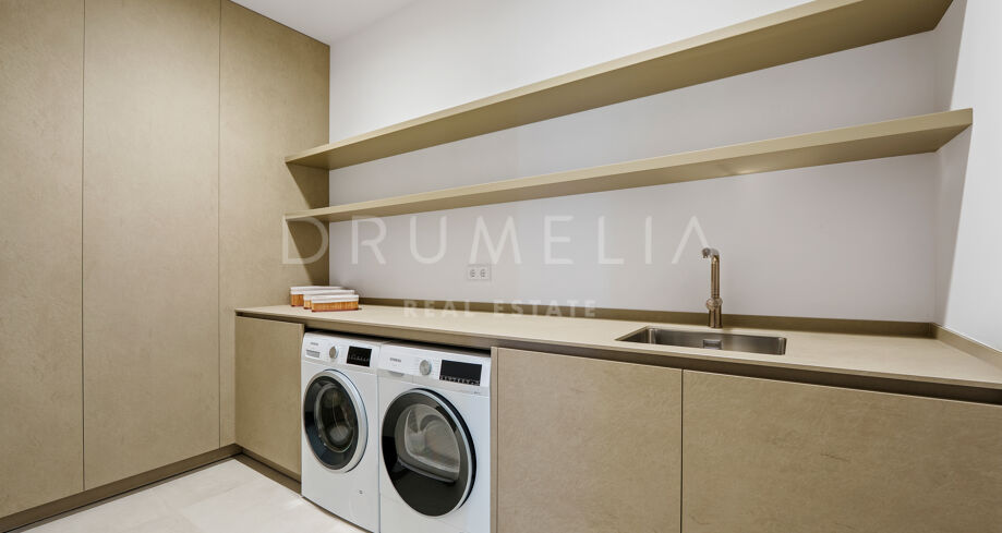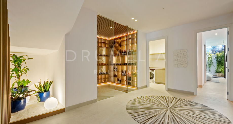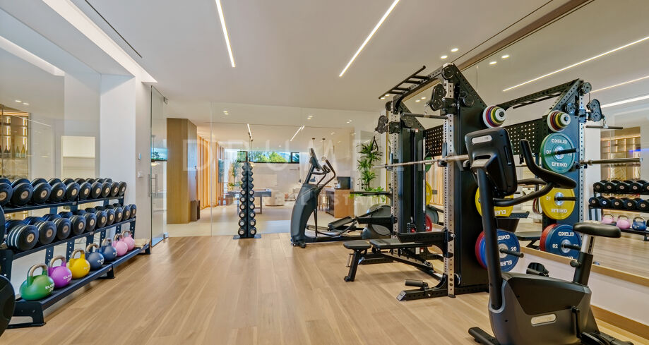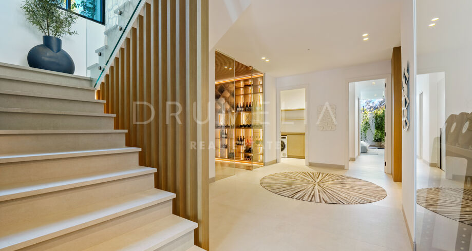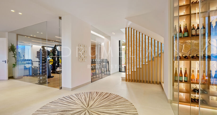 Övervåningen rymmer de privata sviterna, inklusive en mastersvit med terrass, garderob och imponerande utsikt. Underhållningsplanet inkluderar gym, vinkällare, biografrum och ett garage för flera fordon, samt tvättstuga och förråd. Allt ligger bara några minuter från La Quinta Golf & Country Club, Los Naranjos och Los Arqueros.