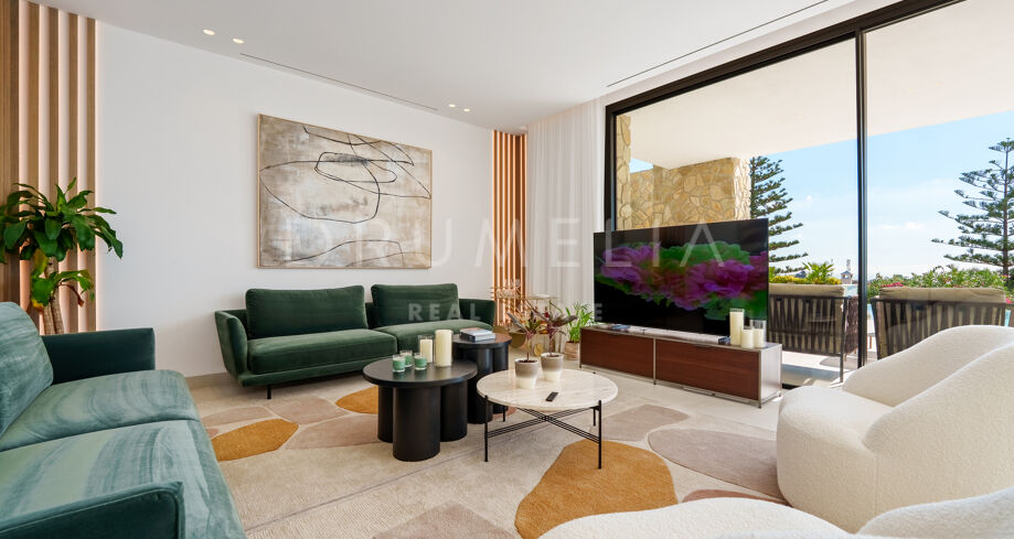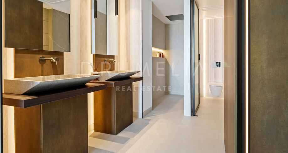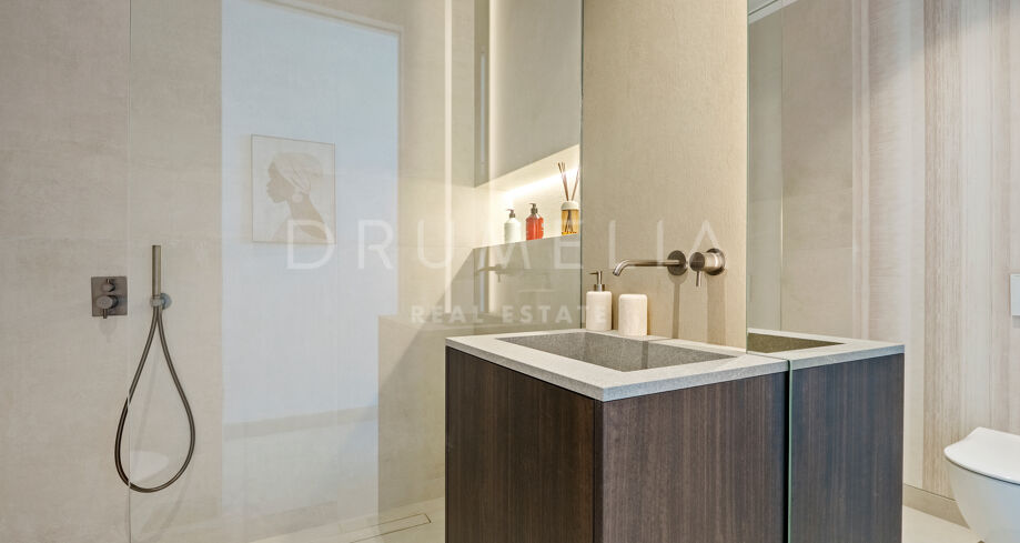 Med 605 m² fördelade på tre nivåer erbjuder fastigheten fem sovrum och fyra badrum. Huvudplanet har öppna vardagsrums- och matsalsytor som ansluter till stora terrasser och en infinitypool på 73 m², vilket skapar en ljus och sömlös inomhus-och-utomhuslivsstil tack vare de stora fönstren och moderna detaljerna.
