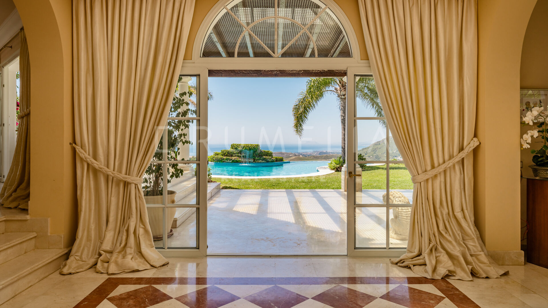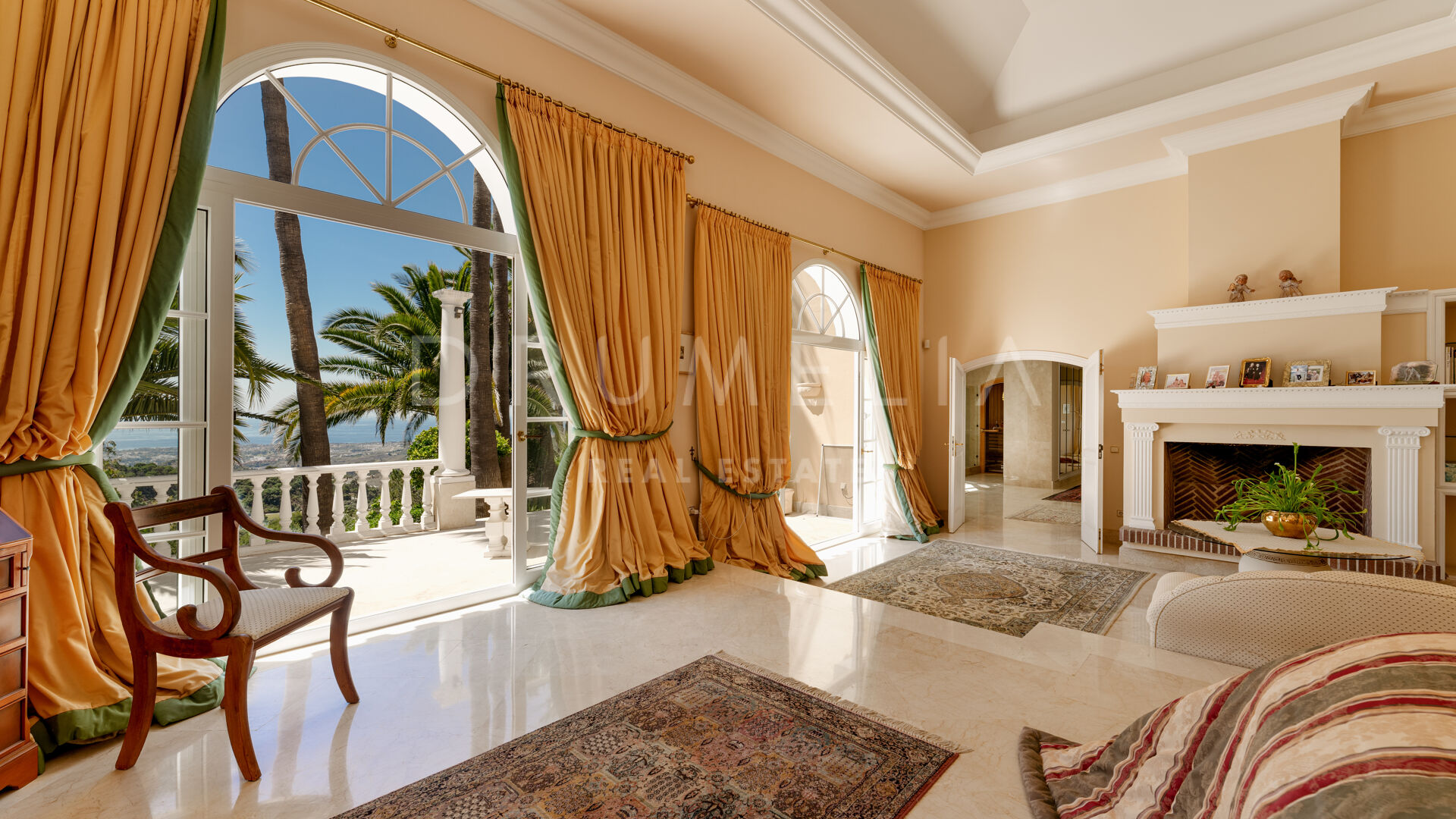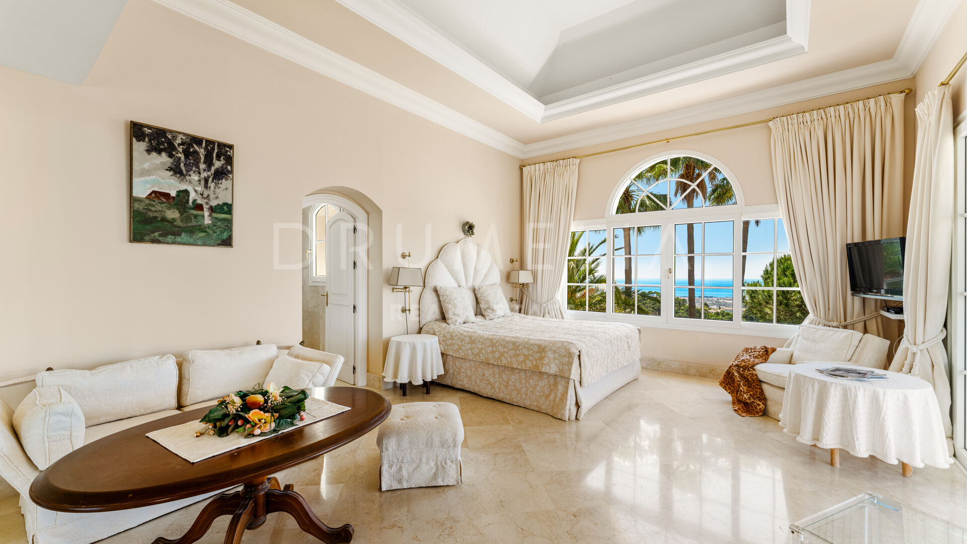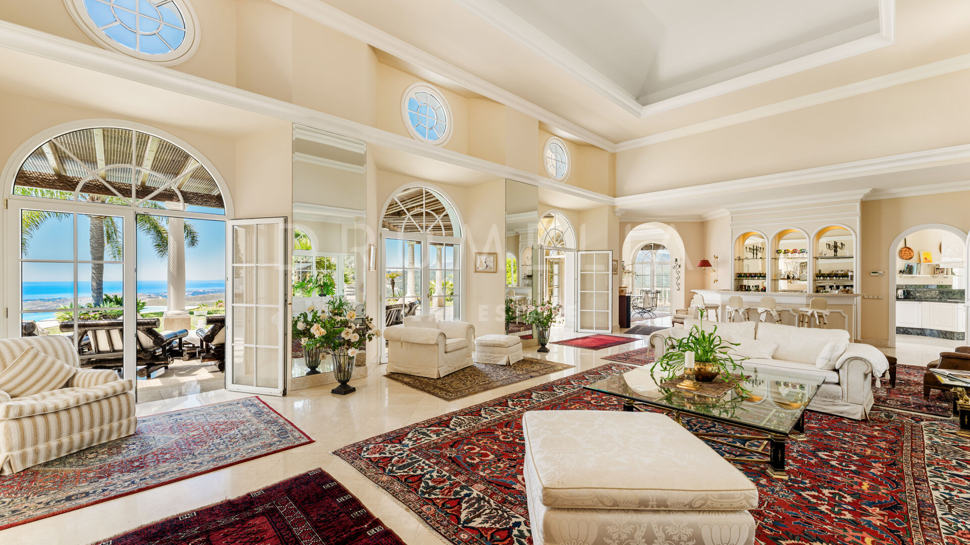 Villan är utformad i varm toscansk stil och präglas av karaktär och traditionell elegans. En privat infart leder till huvudingången, där ljusa interiörer öppnar upp med högt i tak, mjuka kurvor och stora fönsterpartier. Vardagsrummet är husets hjärta och har en klassisk öppen spis samt välvda fönster som ramar in panoramautsikten och fyller rummet med naturligt ljus.