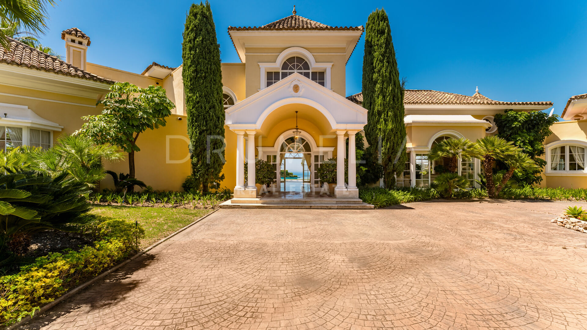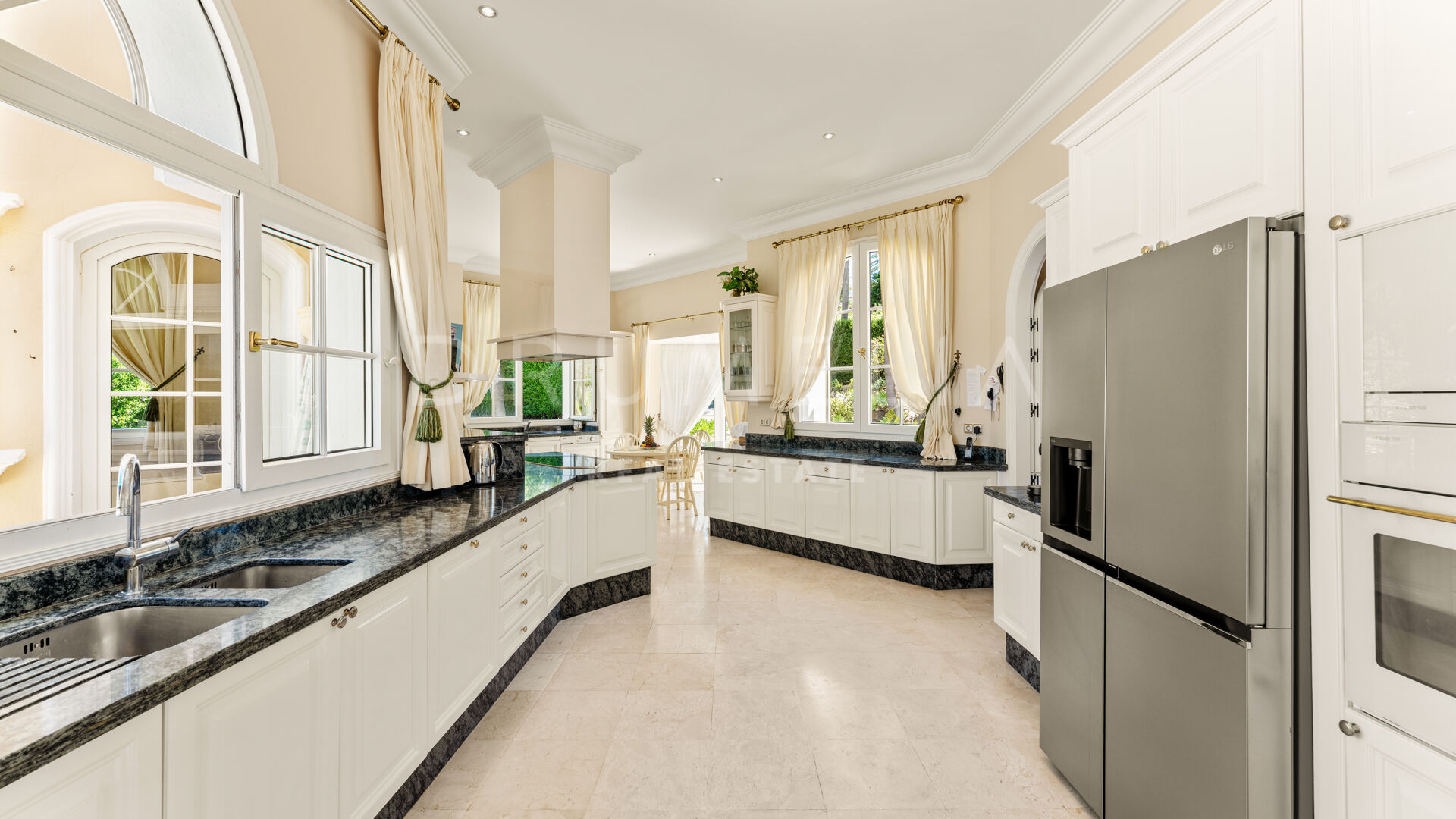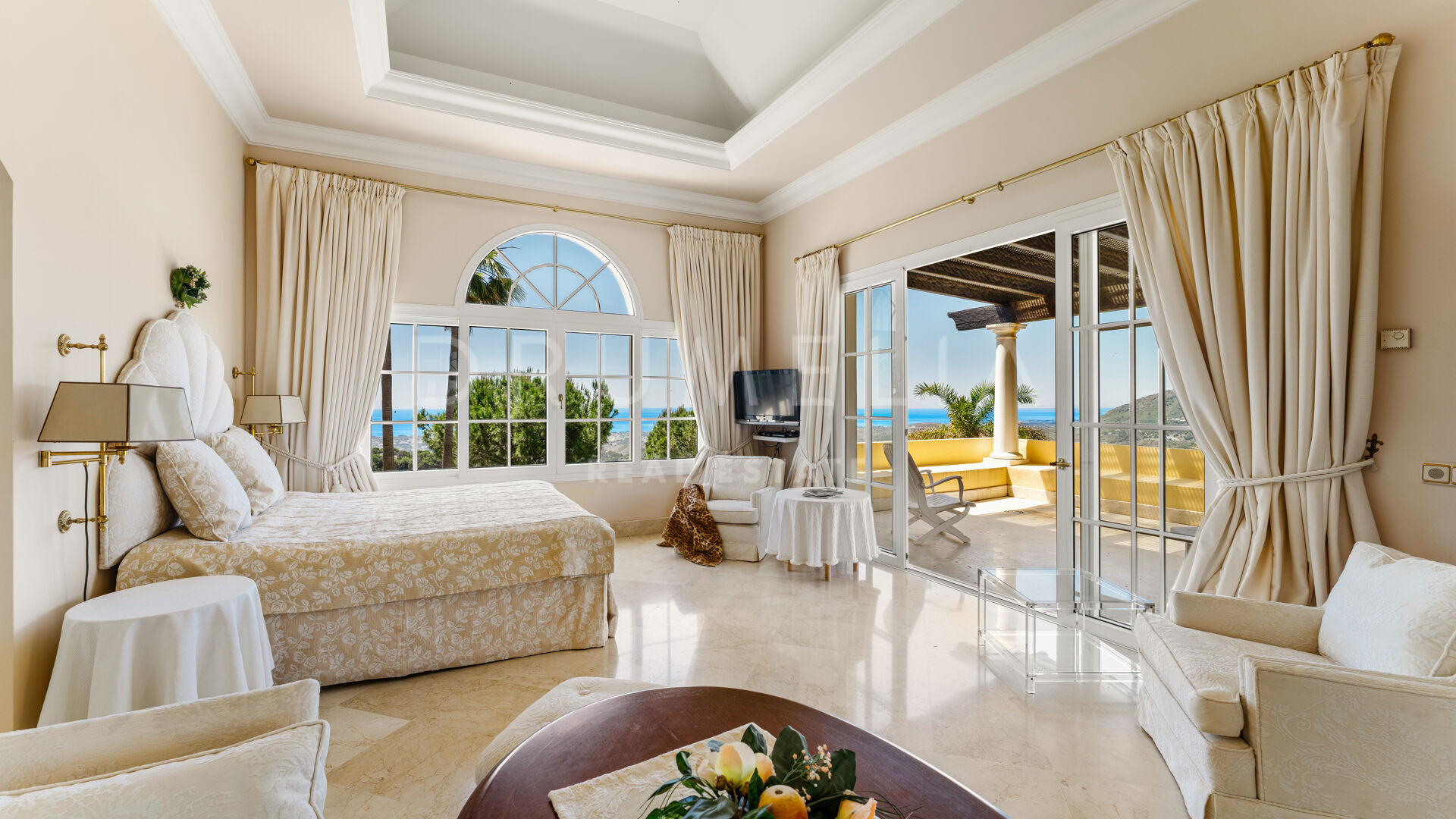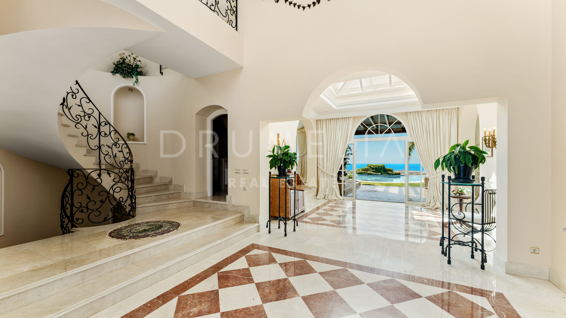 Villan är utformad i varm toscansk stil och präglas av karaktär och traditionell elegans. En privat infart leder till huvudingången, där ljusa interiörer öppnar upp med högt i tak, mjuka kurvor och stora fönsterpartier. Vardagsrummet är husets hjärta och har en klassisk öppen spis samt välvda fönster som ramar in panoramautsikten och fyller rummet med naturligt ljus.