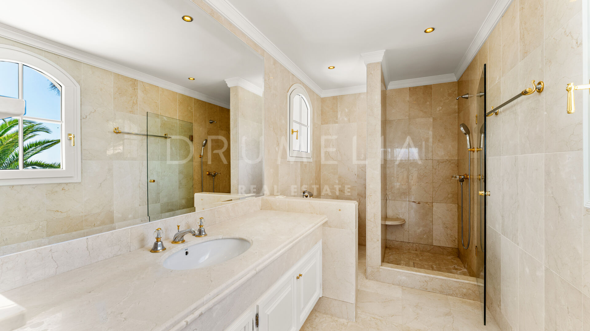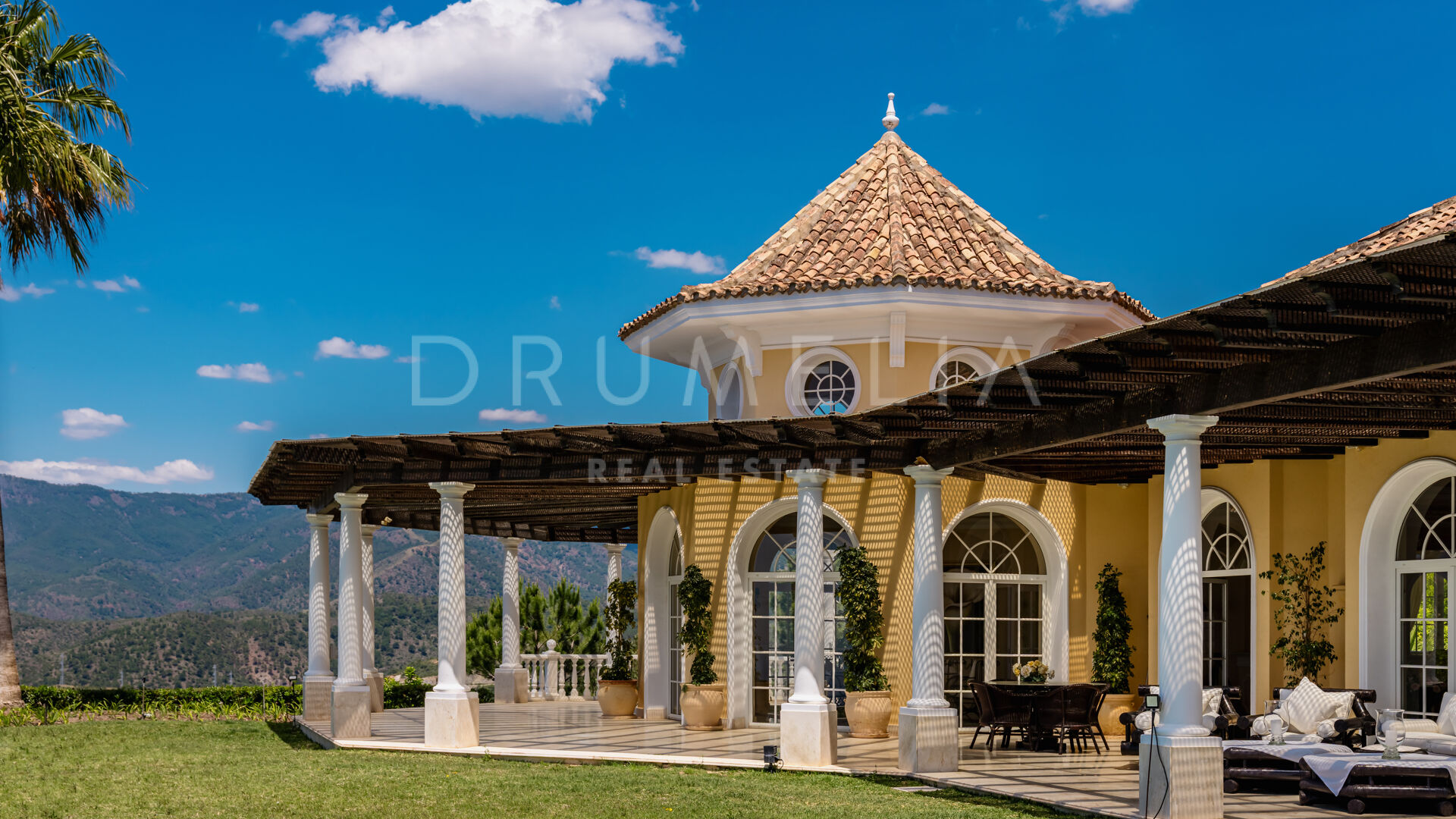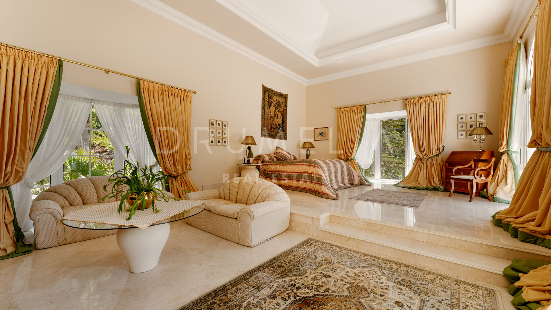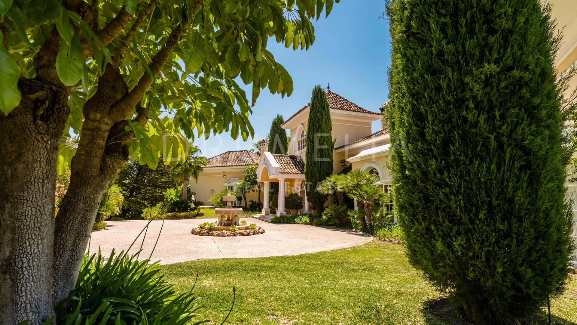Villan är utformad i varm toscansk stil och präglas av karaktär och traditionell elegans. En privat infart leder till huvudingången, där ljusa interiörer öppnar upp med högt i tak, mjuka kurvor och stora fönsterpartier. Vardagsrummet är husets hjärta och har en klassisk öppen spis samt välvda fönster som ramar in panoramautsikten och fyller rummet med naturligt ljus.