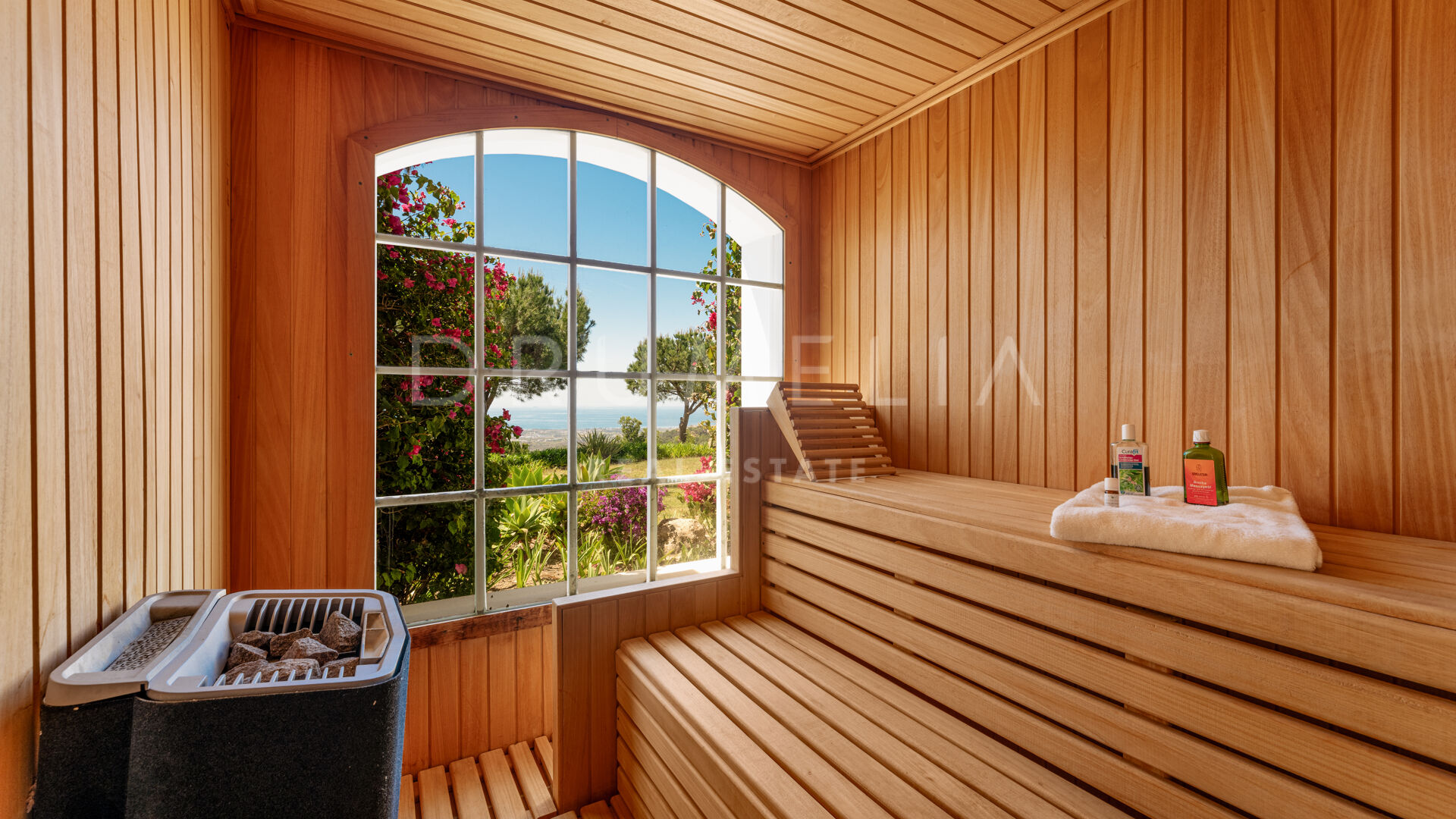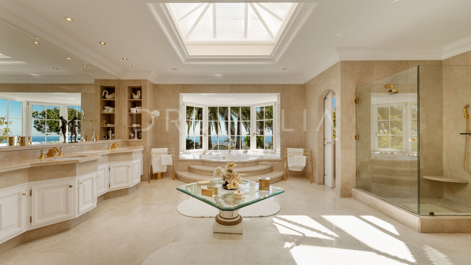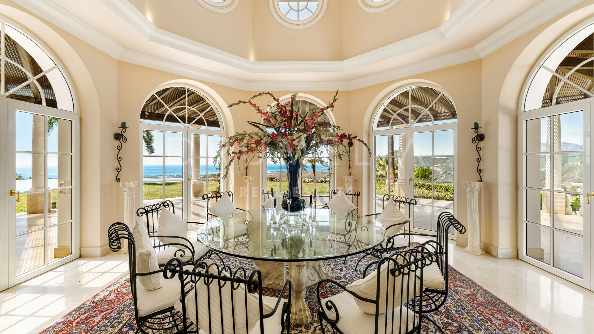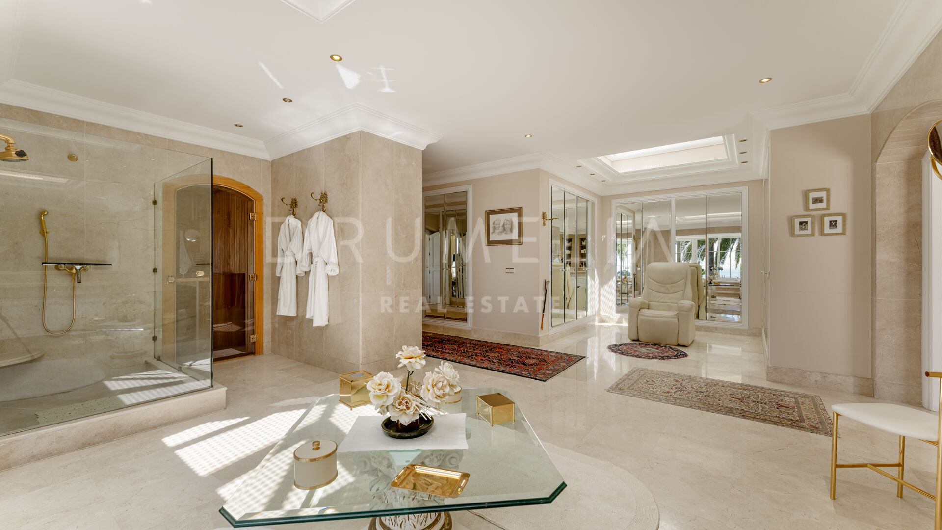 På entréplanet finns en imponerande mastersvit med direkt havsutsikt, ett rymligt walk-in-closet och ett lyxigt badrum en suite med privat bastu – även den med havsutsikt – en sällsynt och utsökt detalj. På samma plan finns även ett exklusivt kök med marmorbänkar, en bar och en majestätisk åttakantig matsal, perfekt för eleganta middagar.